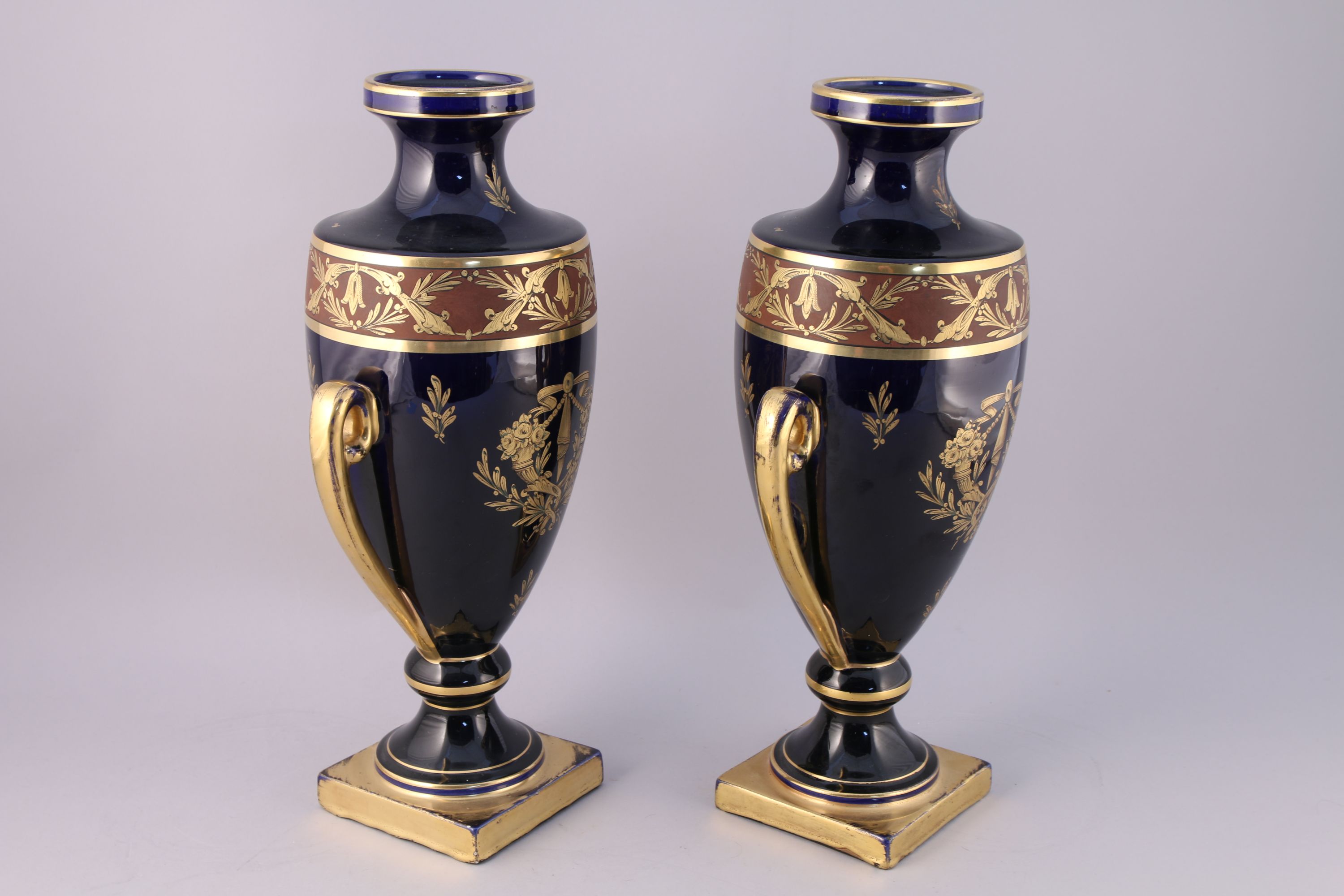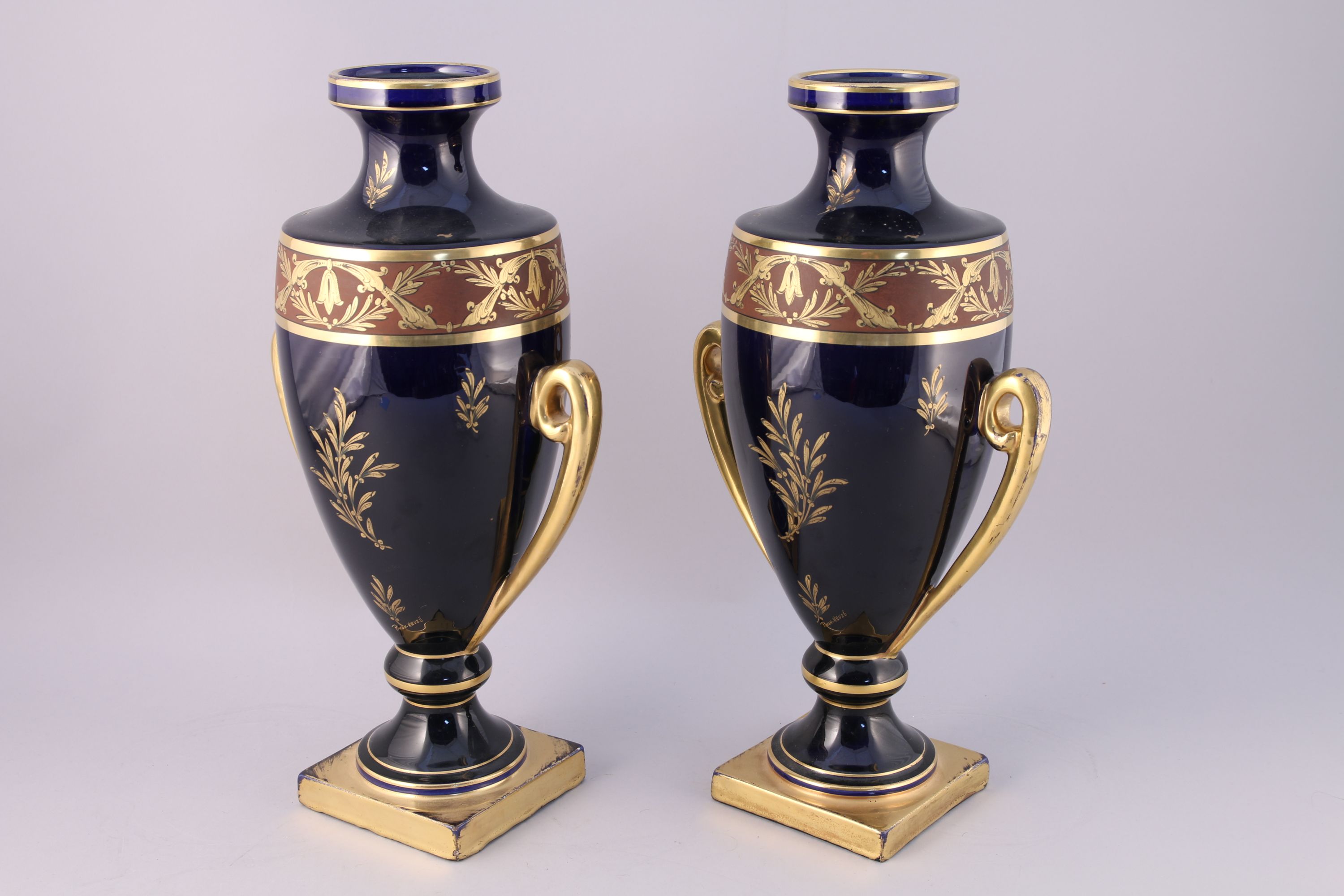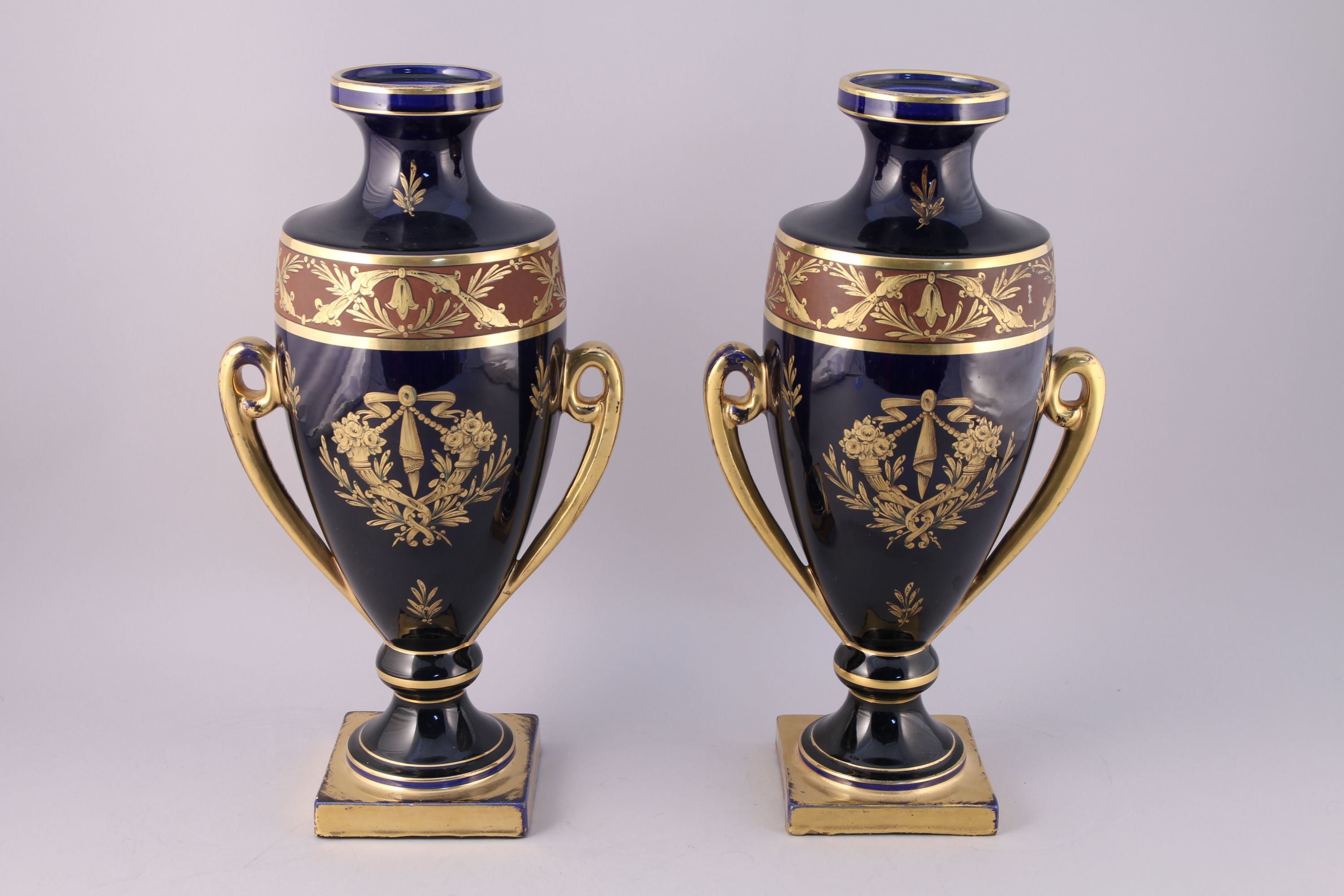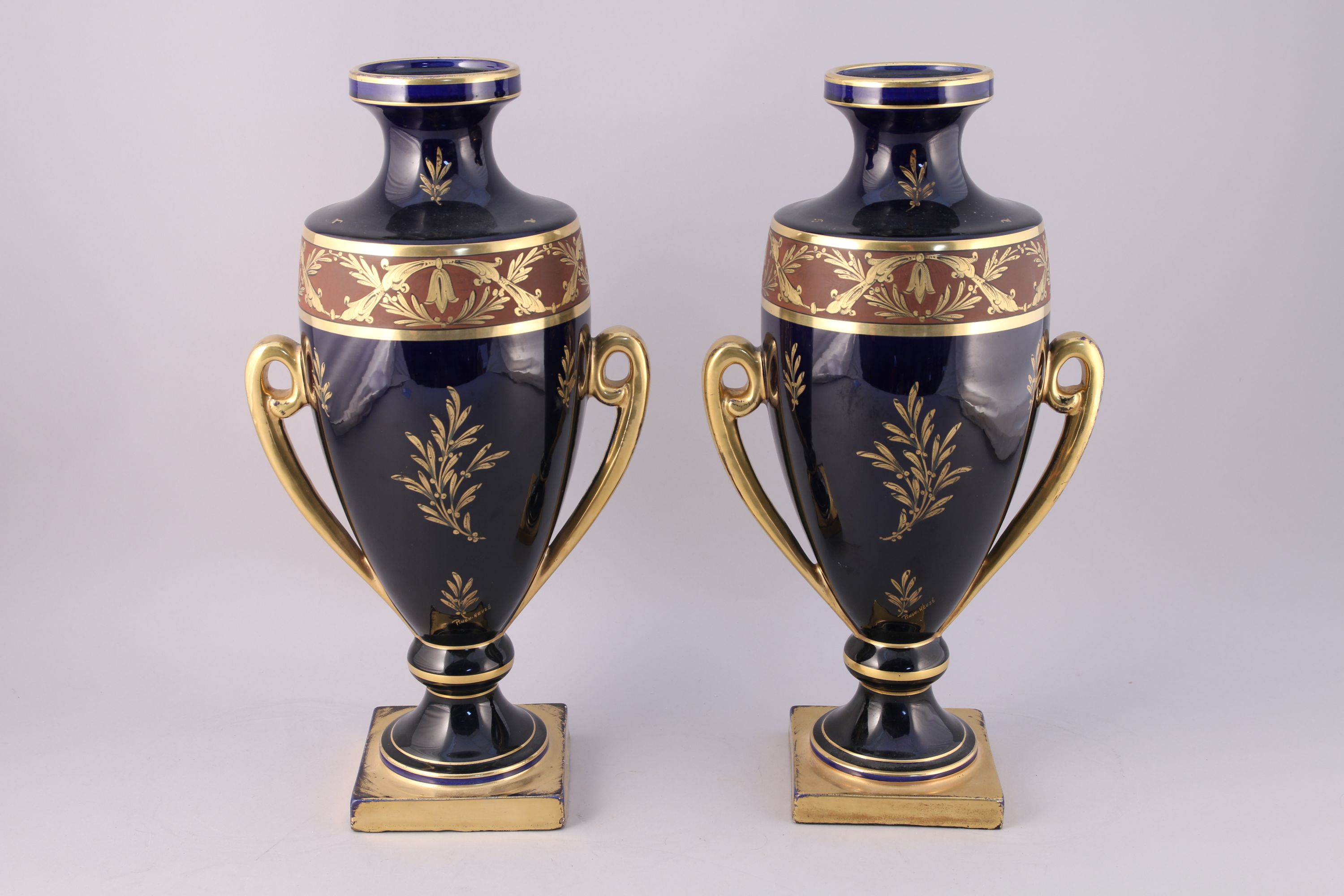Paire de vases balustres sur piédouches flanqués d'anses à enroulement. En céramique à fond bleu nuit au décor rehaussé d'or de cornes fleuris et de branches d'olivier, ceint en partie supérieure d'un bandeau or sur fond brun.