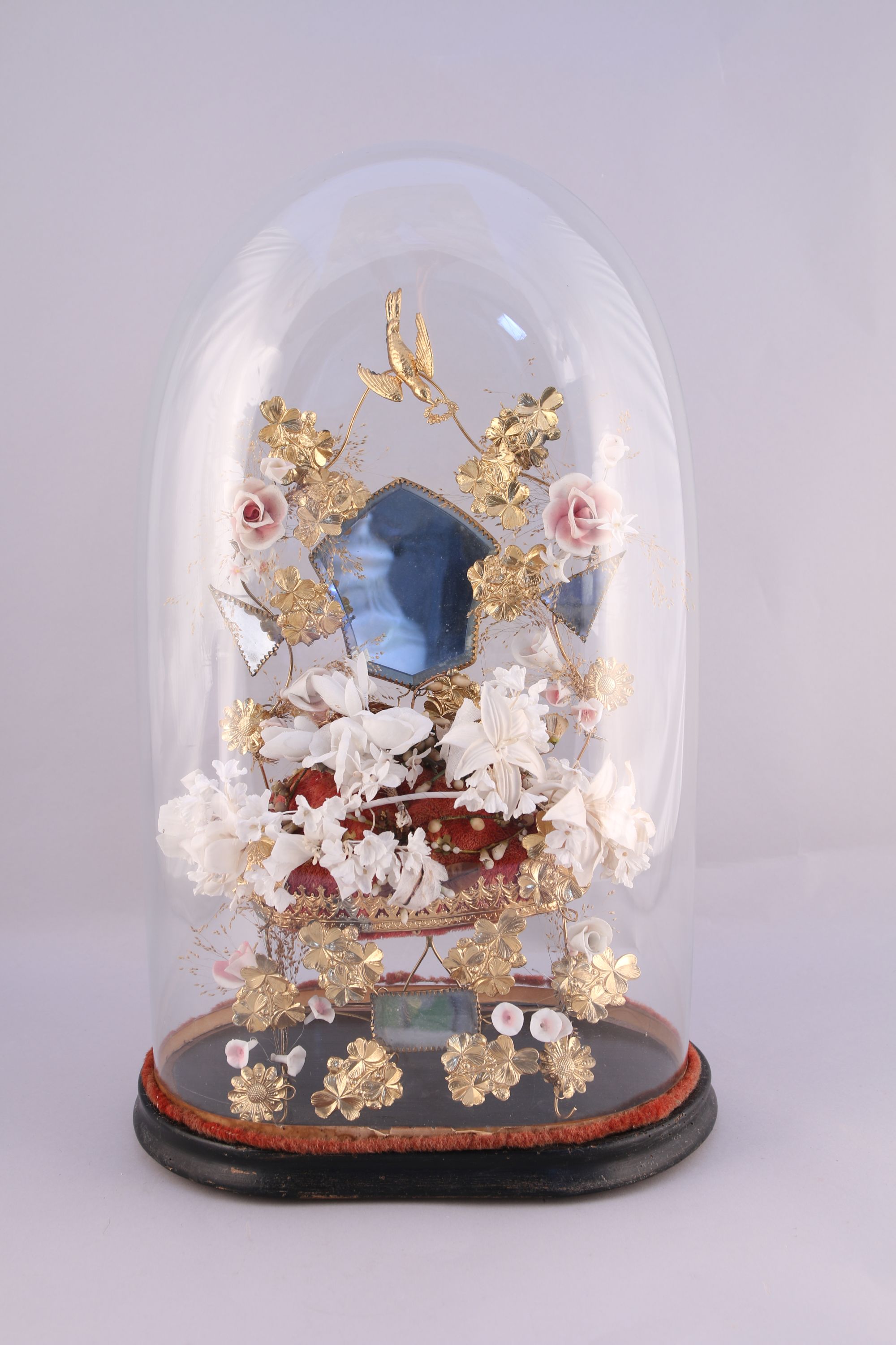 constitué d'un coussin de velours rouge à armature de métal doré. Riche garniture de fines plaques de métal doré embouti à décor de trèfles, de fleurs et d'une colombe. Elle est agrémentée de fleurs en papier et porcelaine, de branches d'oranger et de quatre miroirs. Sous globe à socle de bois noirci.