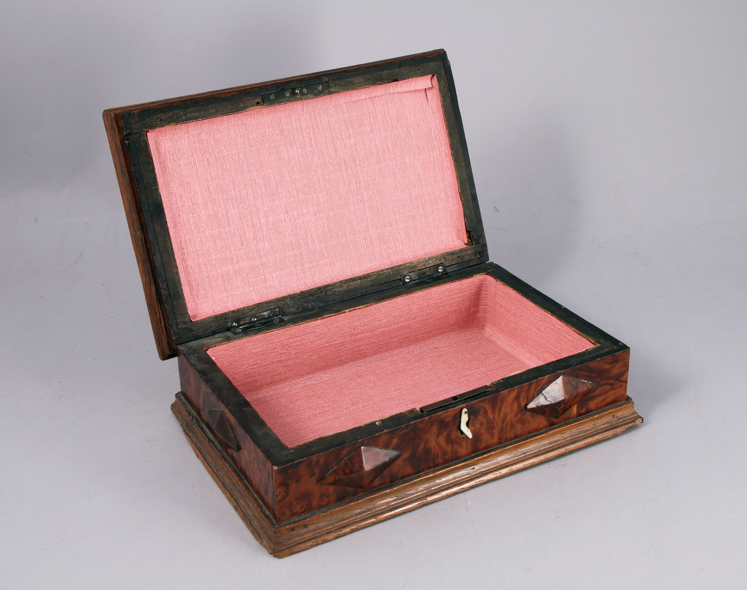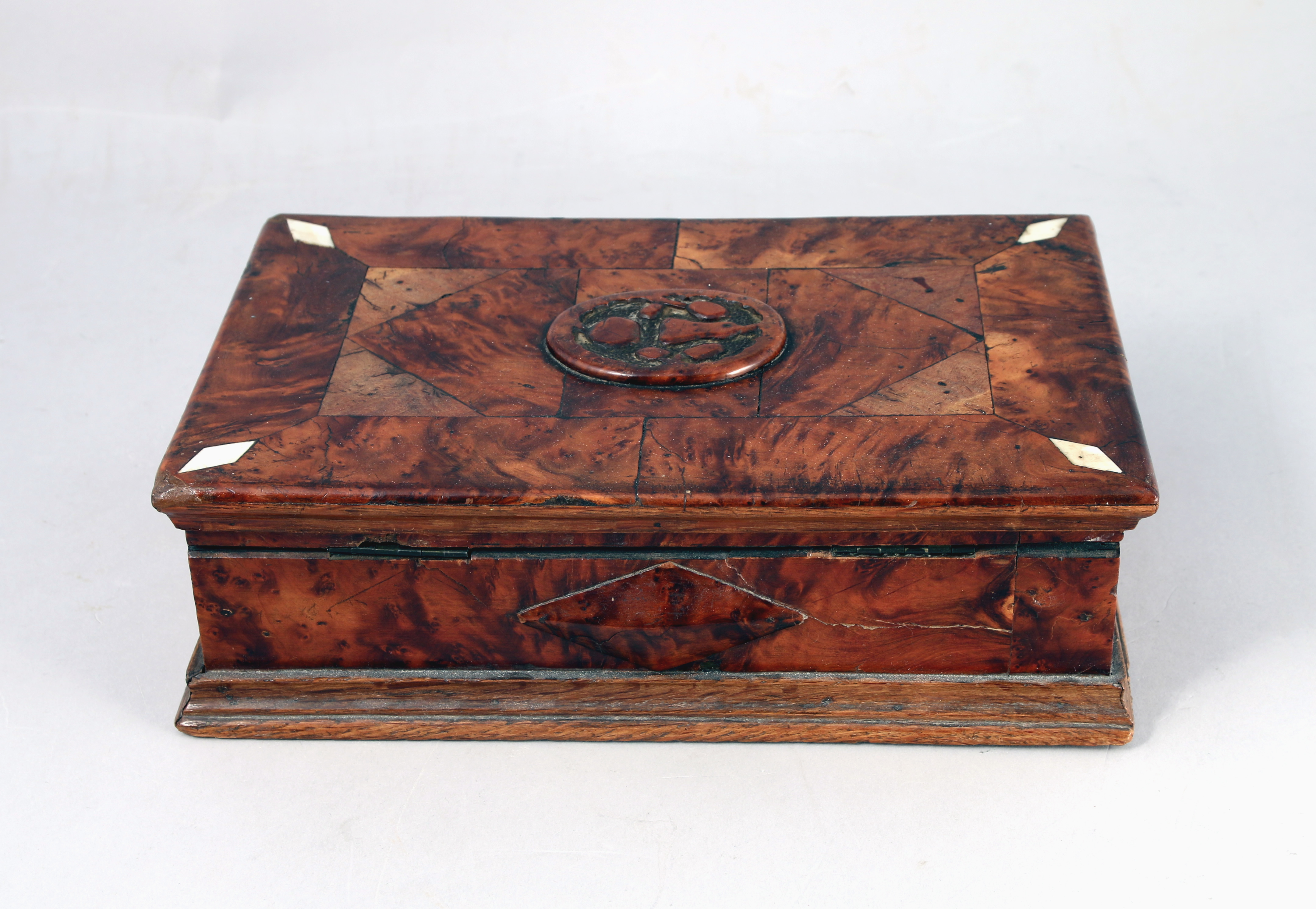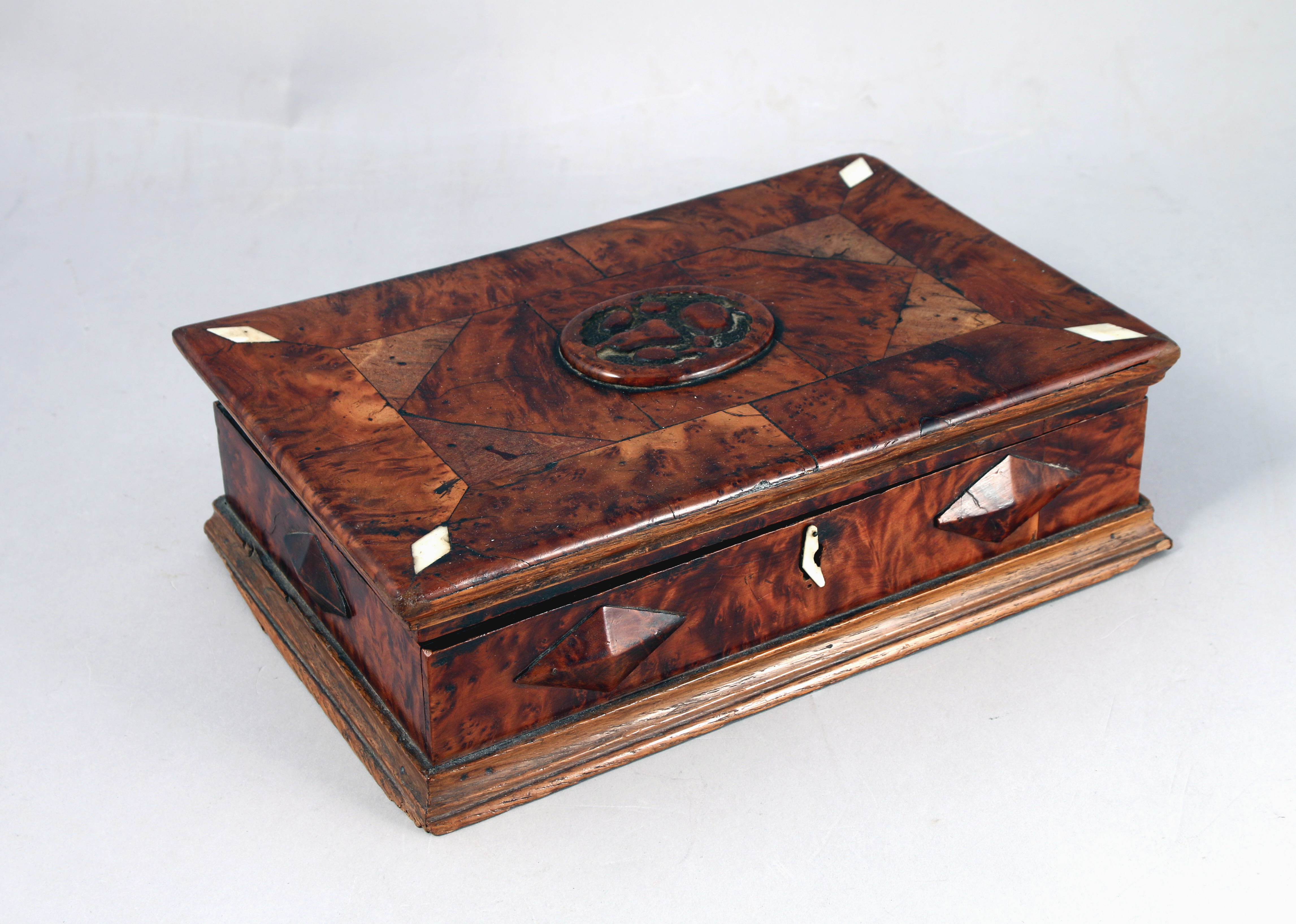 BOÎTE en placage géométrique de ronce et marqueterie d'os de forme rectangulaire ouvrant par un abattant rehaussé d'un cartouche orné d'une graine stylisée. Losange en cabochon sur mes côtés.