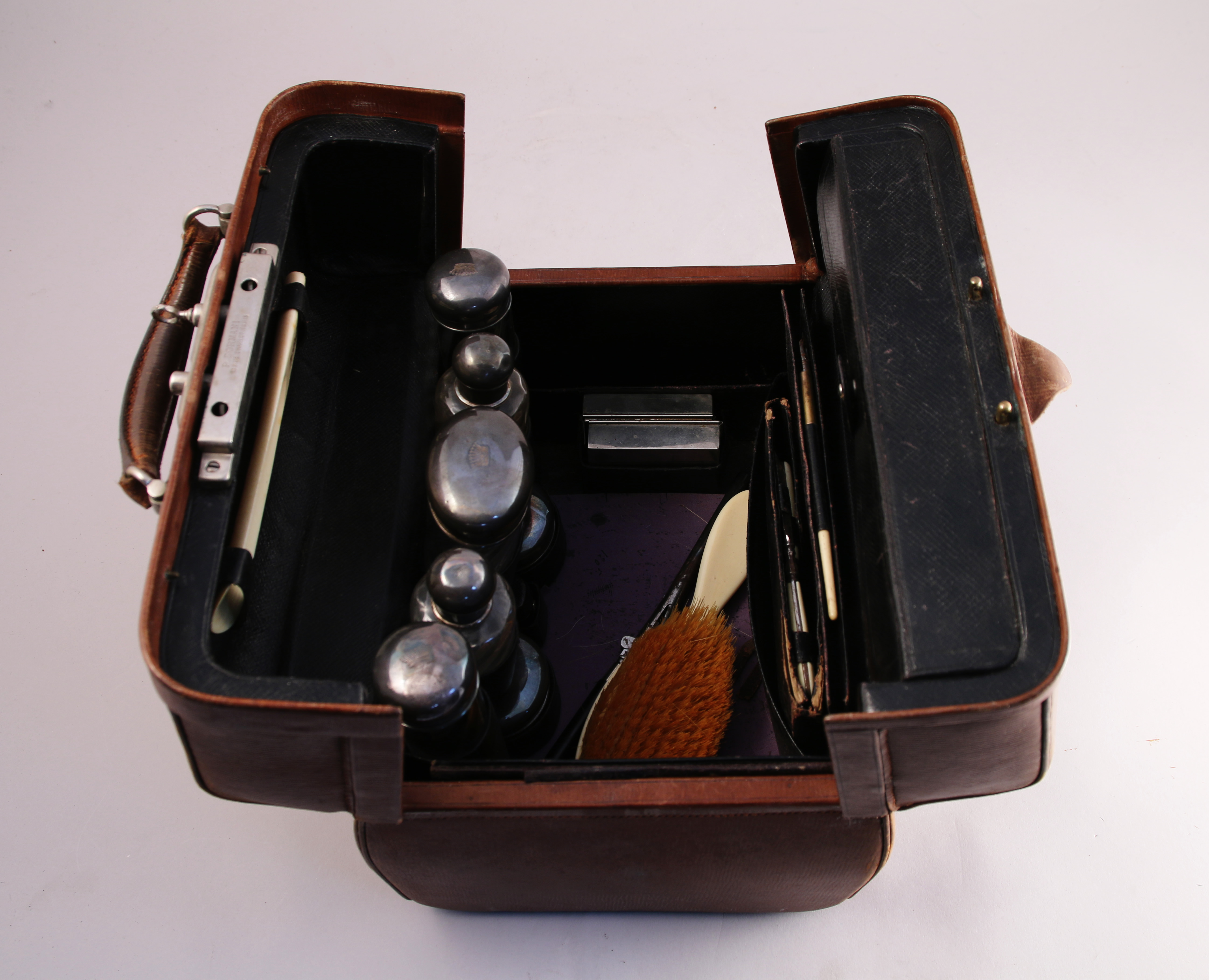 - d'un NÉCESSAIRE de TOILETTE comprenant un ensemble de sept boîtes ou flacons de formes diverses en verre torsadé à bouchon d'argent gravé d'une couronne comtale; trois brosses monogrammées "LH"; un peigne; un miroir (brisé); un fer à friser; une boîte à lumière; un ensemble de neuf petits ustensiles et un chausse-pied monogrammé "LH";
