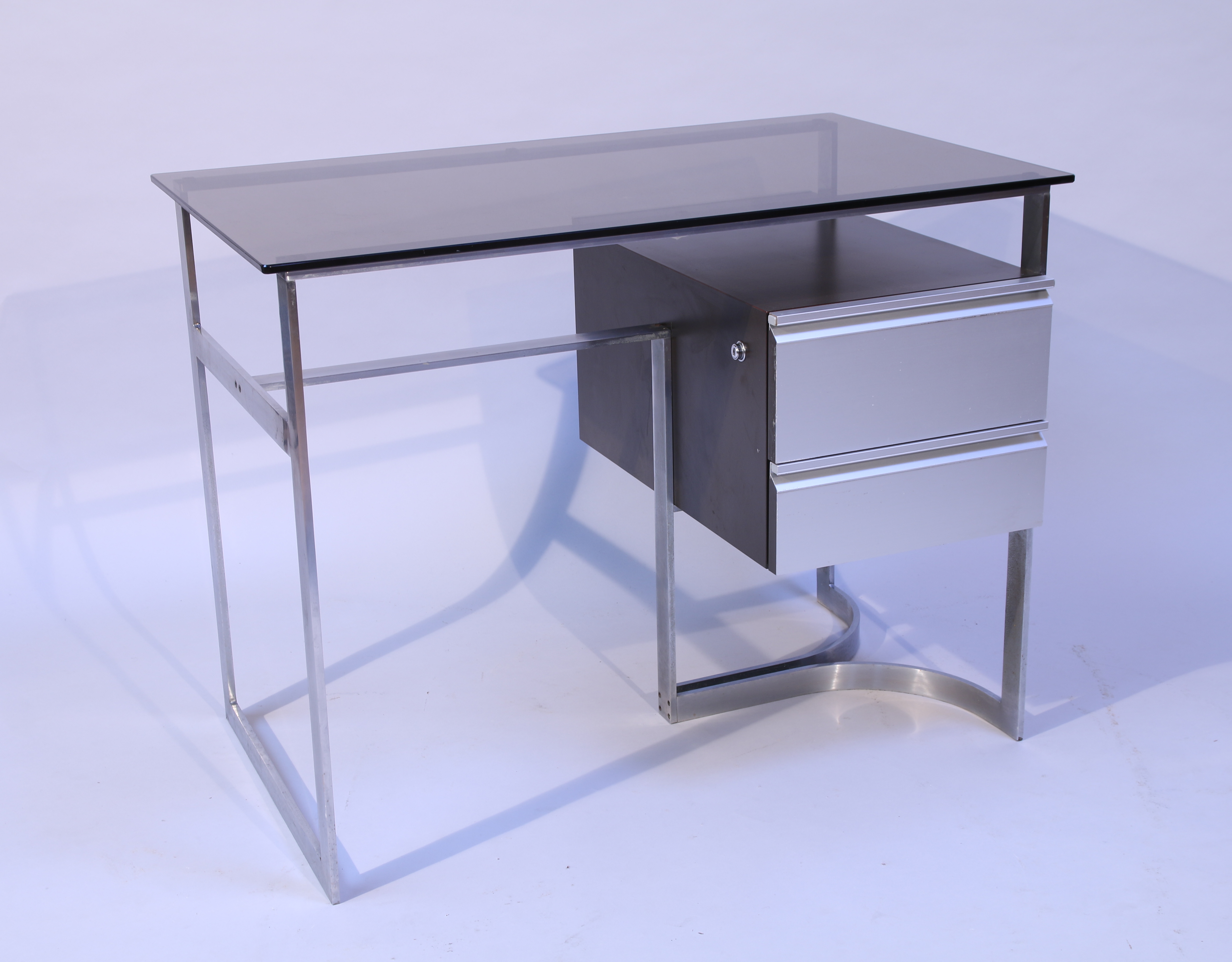 ouvrant en façade par un caisson à deux tiroirs. Piètement en acier brossé, plateau de verre fumé.