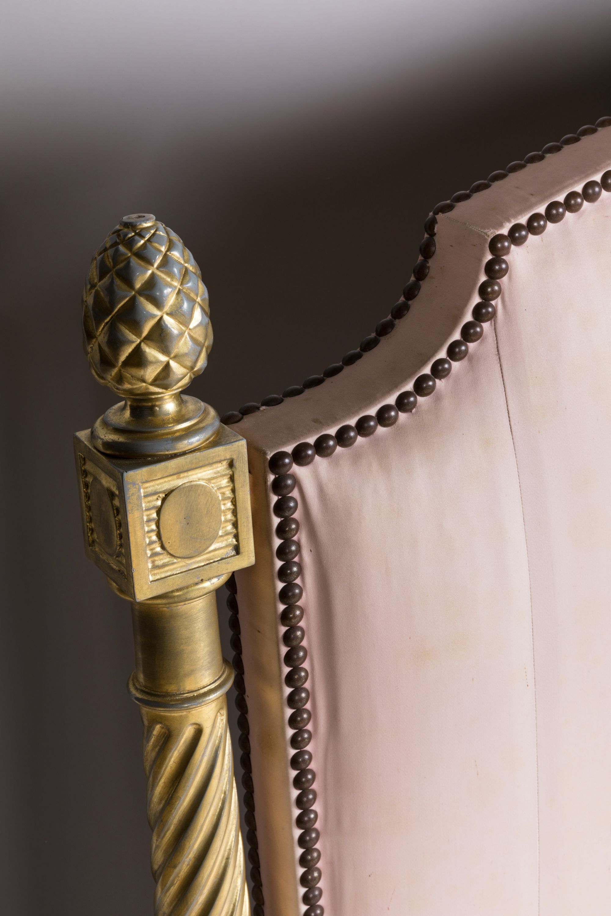 laqué gris bleuté et doré. Montants détachés en balustre à décor de cannelures torses raccordés aux pieds fuselés et cannelés par un dé à fleurons. Une pomme de pin à l'amortissement.