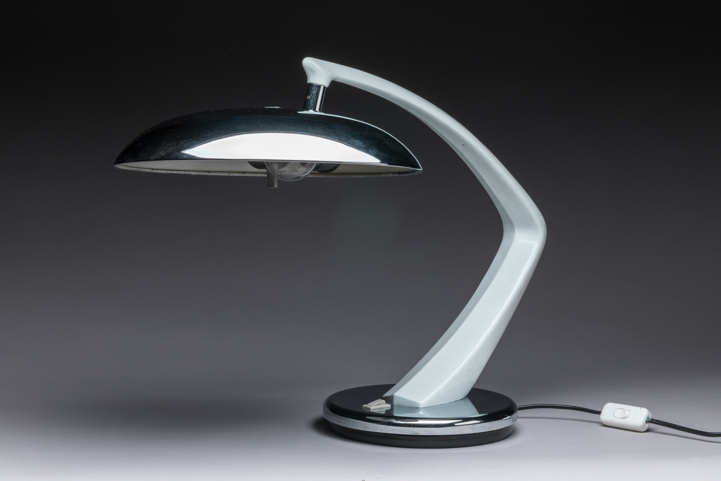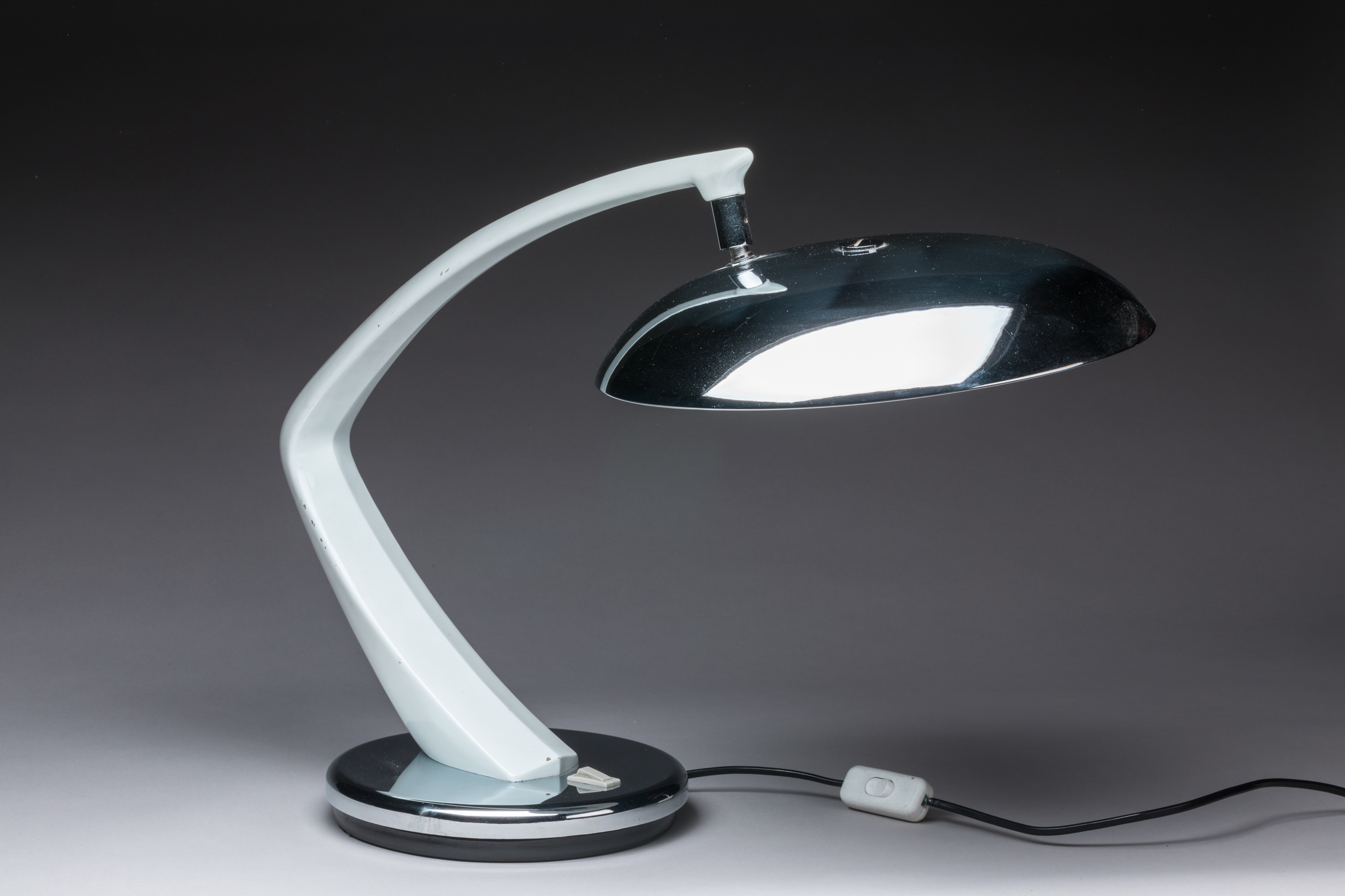 - FASE Éditeur, Madrid. LAMPE de BUREAU, Modèle "Boomerang" au bras laqué blanc, base et déflecteur à deux sources de lumières en métal chromé. Manque le diffuseur en plastique. Inscription "FASE" sous la base. Travail des années 1960-1970. Haut. 39 cm, Long. 60 cm, Diam. 30 cm.