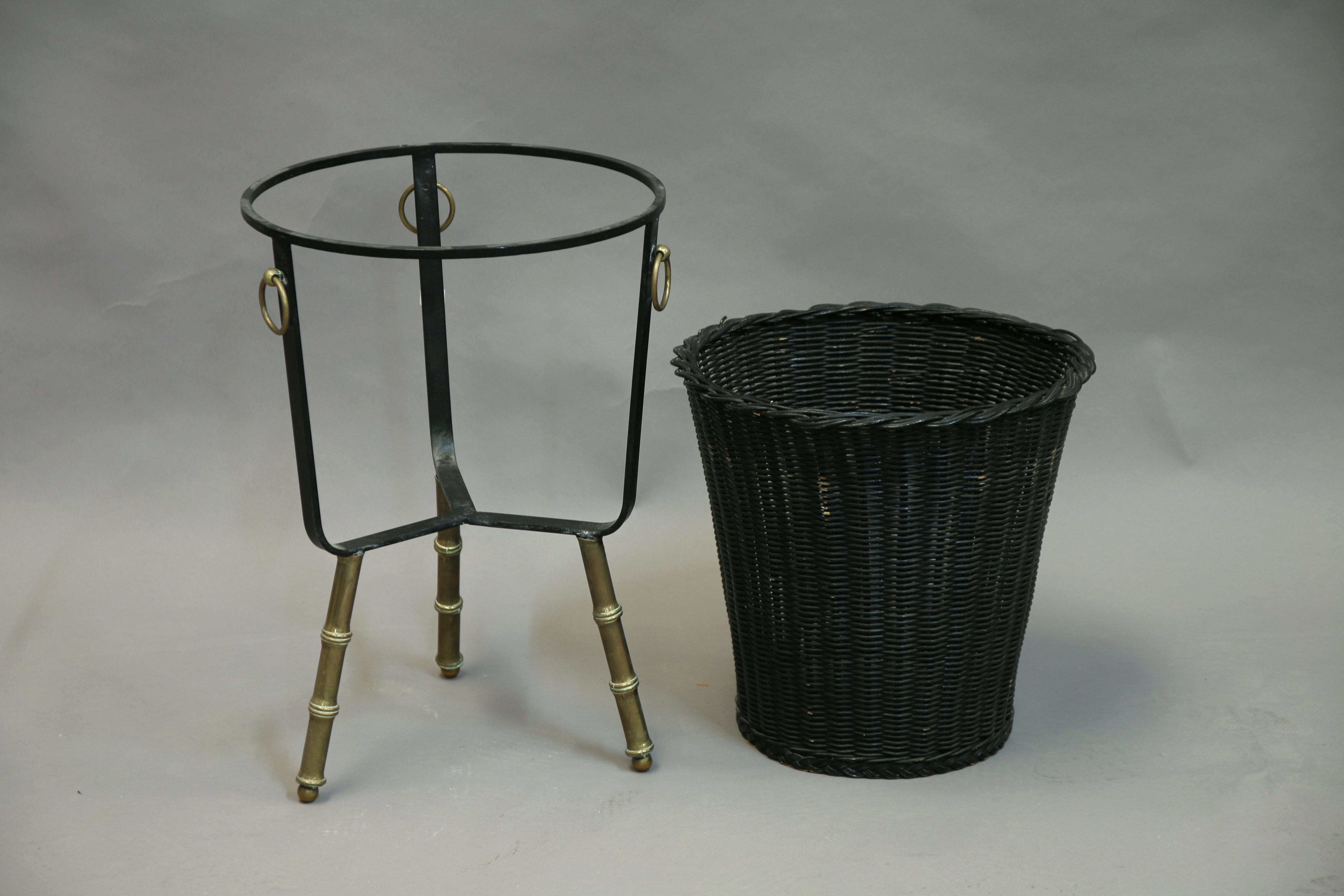- CORBEILLE en osier noir au piètement métallique tripode en forme de bambou, anneaux de laiton.