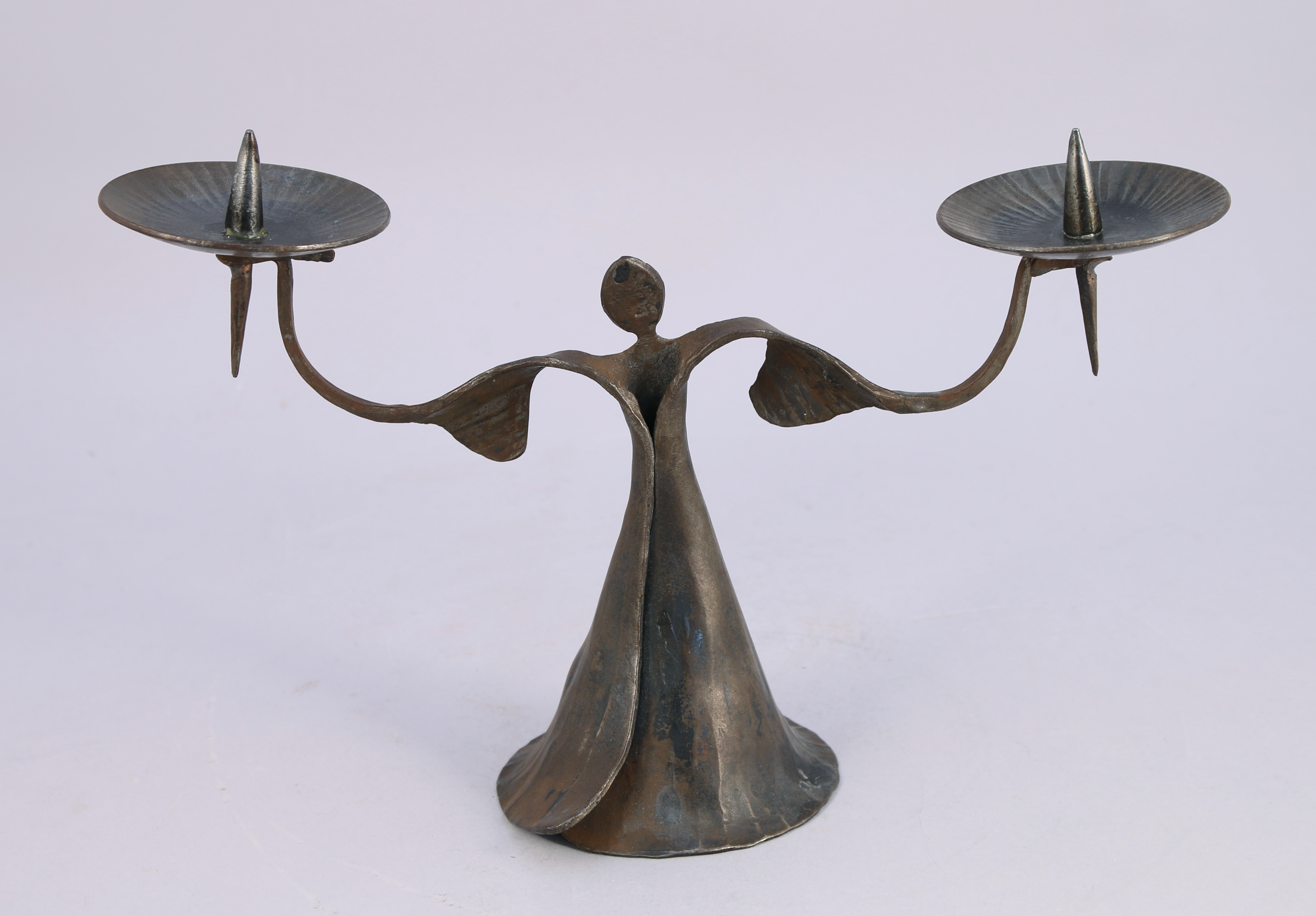 - PORTE-BOUGIE en bronze patiné brun, à deux bras de lumières. Piques-bougies fixés aux bobèches évoquant des feuilles de nénuphars. Haut. 21, Larg. 30 cm.