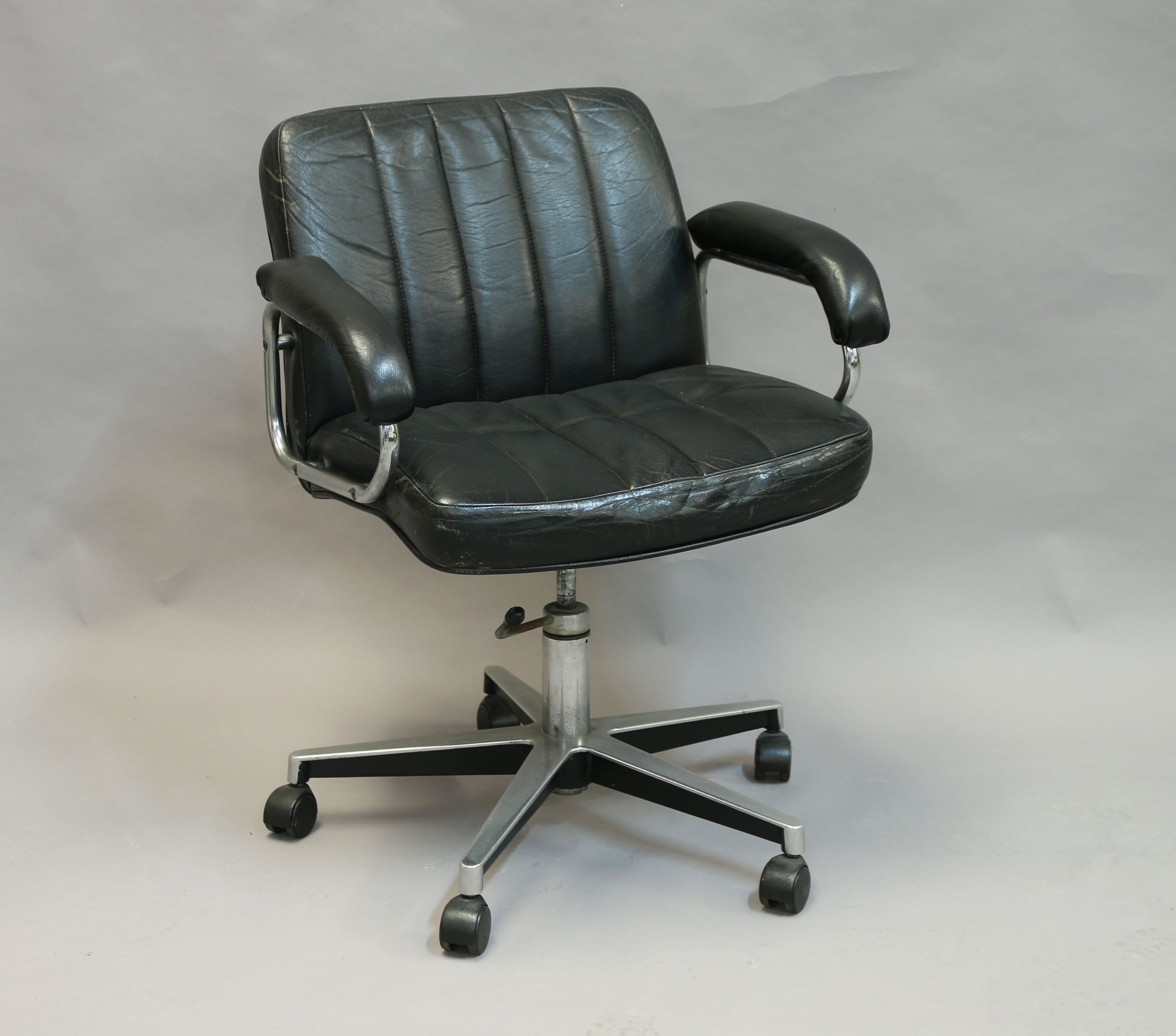 - FAUTEUIL de BUREAU à roulettes, le piètement en aluminium à cinq bras et roues en plastique noir, garniture en skaï noir. Travail des années 1970 inspiré du fauteuil Soft Pad de Charles & Ray EAMES. Haut. 82, Larg. 50, Long. 62 cm.