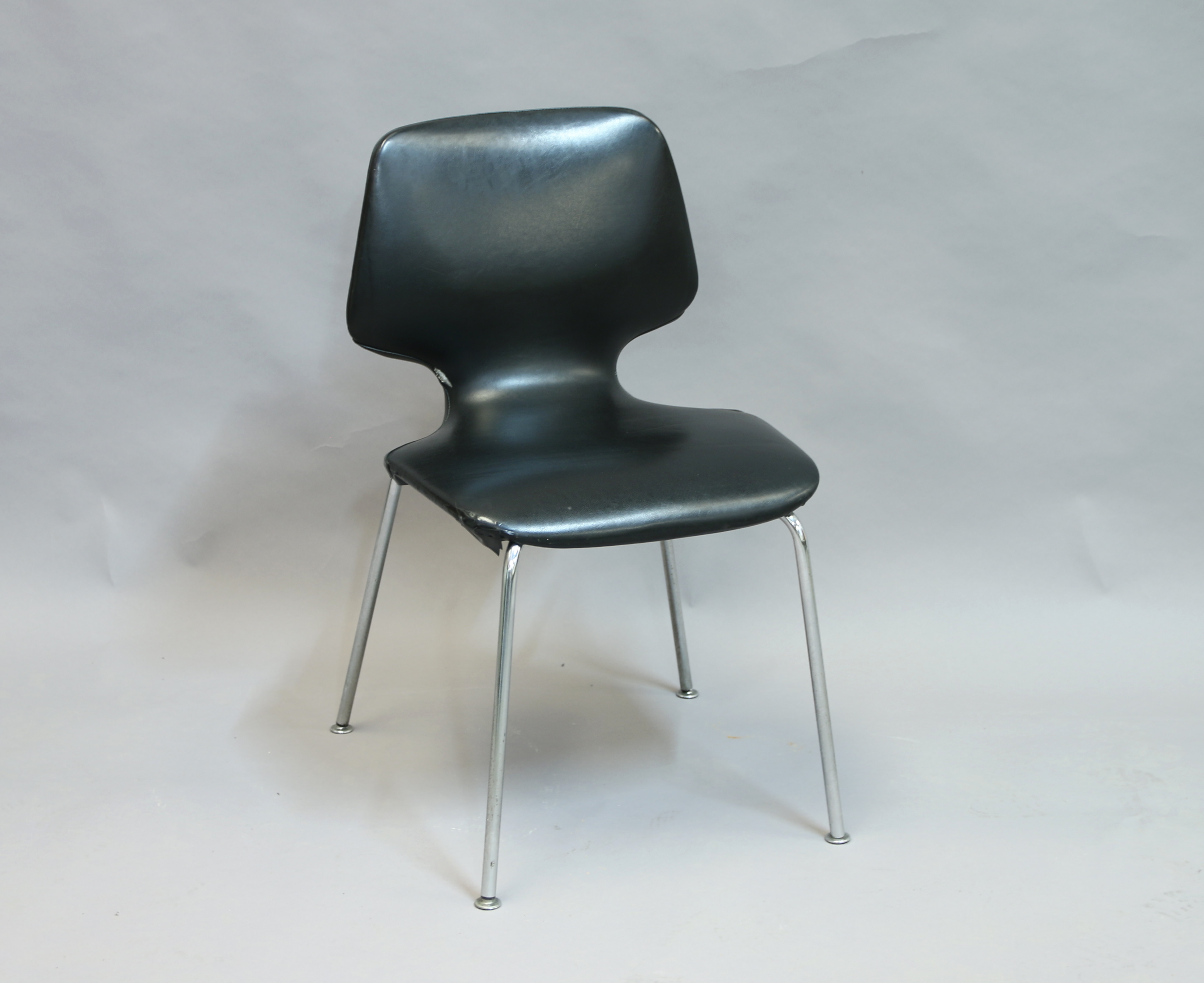- CHAISE à la structure en aluminium, au dossier en trapèze, à l'assise garnie de cuir noir. Travail des années 1970. Haut. 77, Larg. 45, Long. 45 cm.