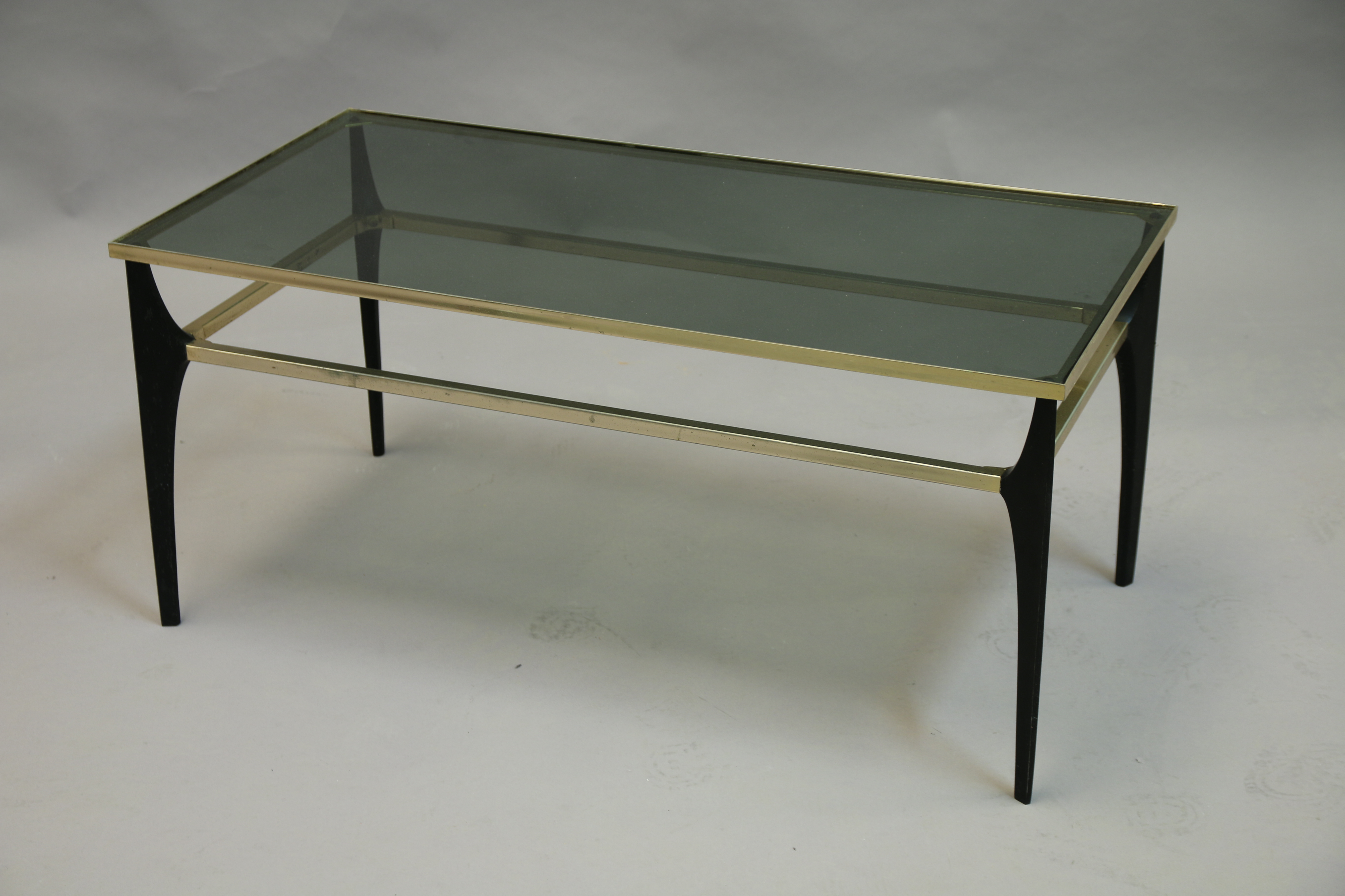 - TABLE BASSE au plateau de verre fumé, le piètement en métal laqué noir et doré. Haut. 41, Larg. 90,5, Long. 45,5 cm.