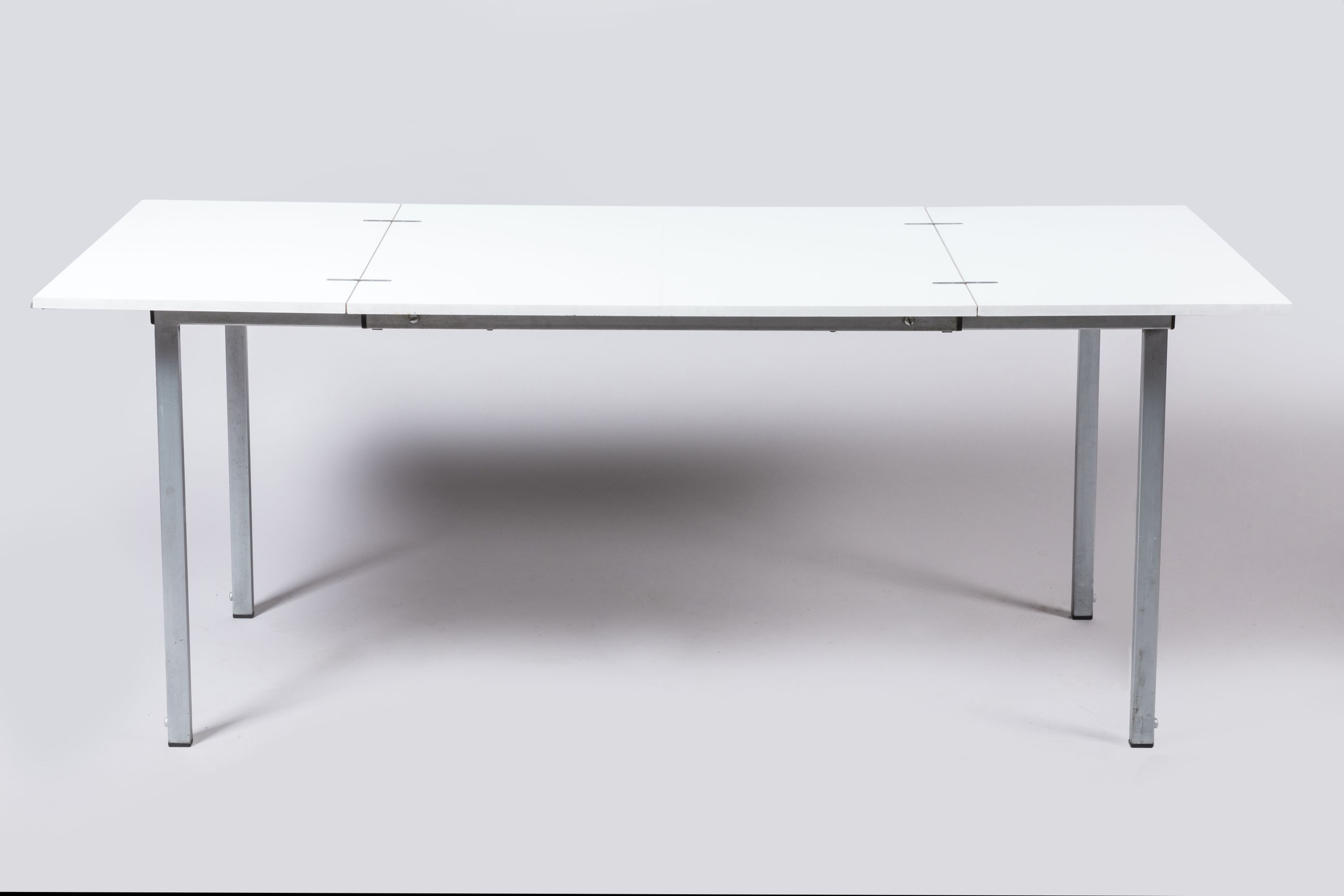 -TABLE DROMADAIRE dépliable, le plateau rectangulaire mélanine blanc, le piètement métallique.