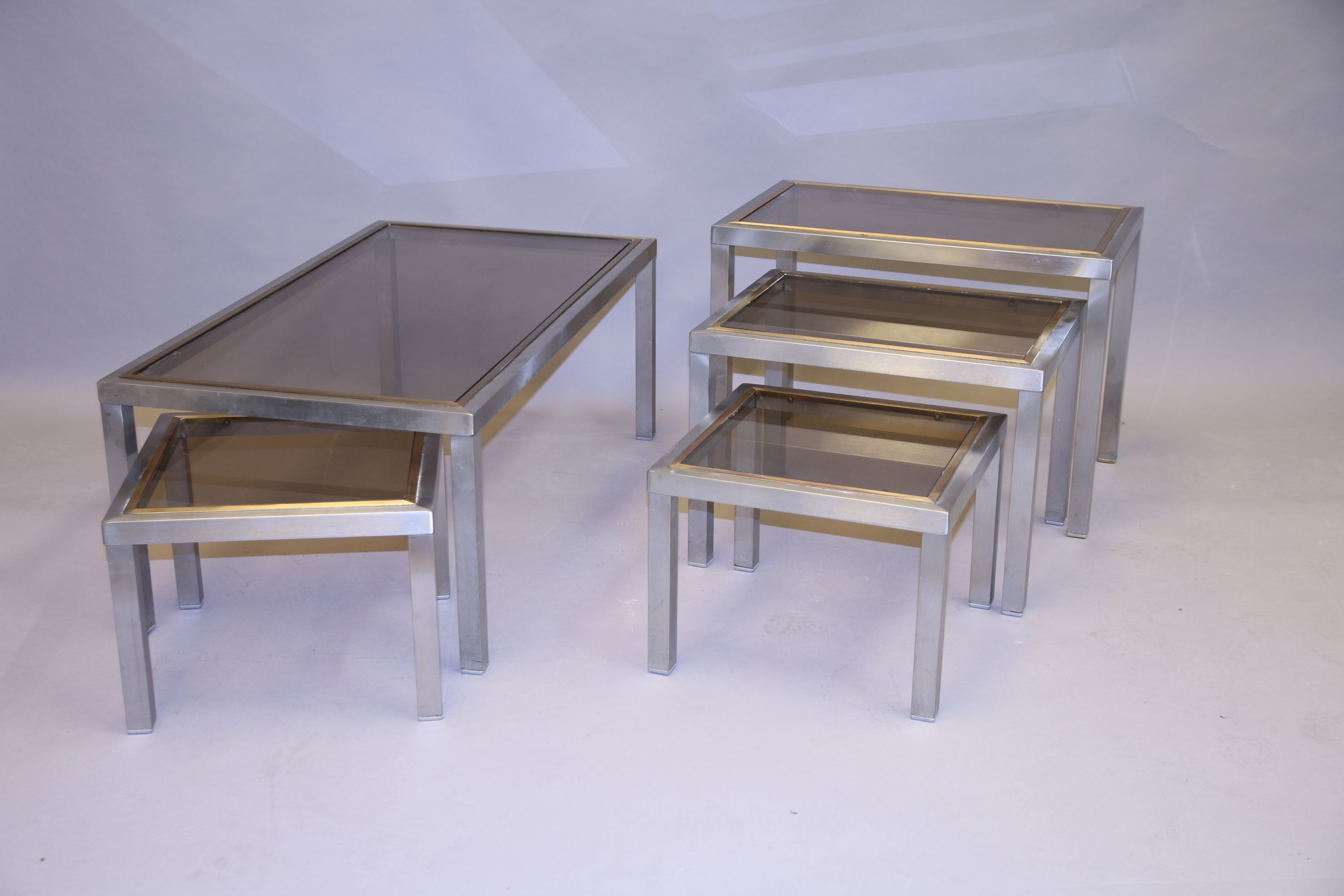 en aluminium, cadre en laiton et plateau de verre fumé de forme rectangulaire.