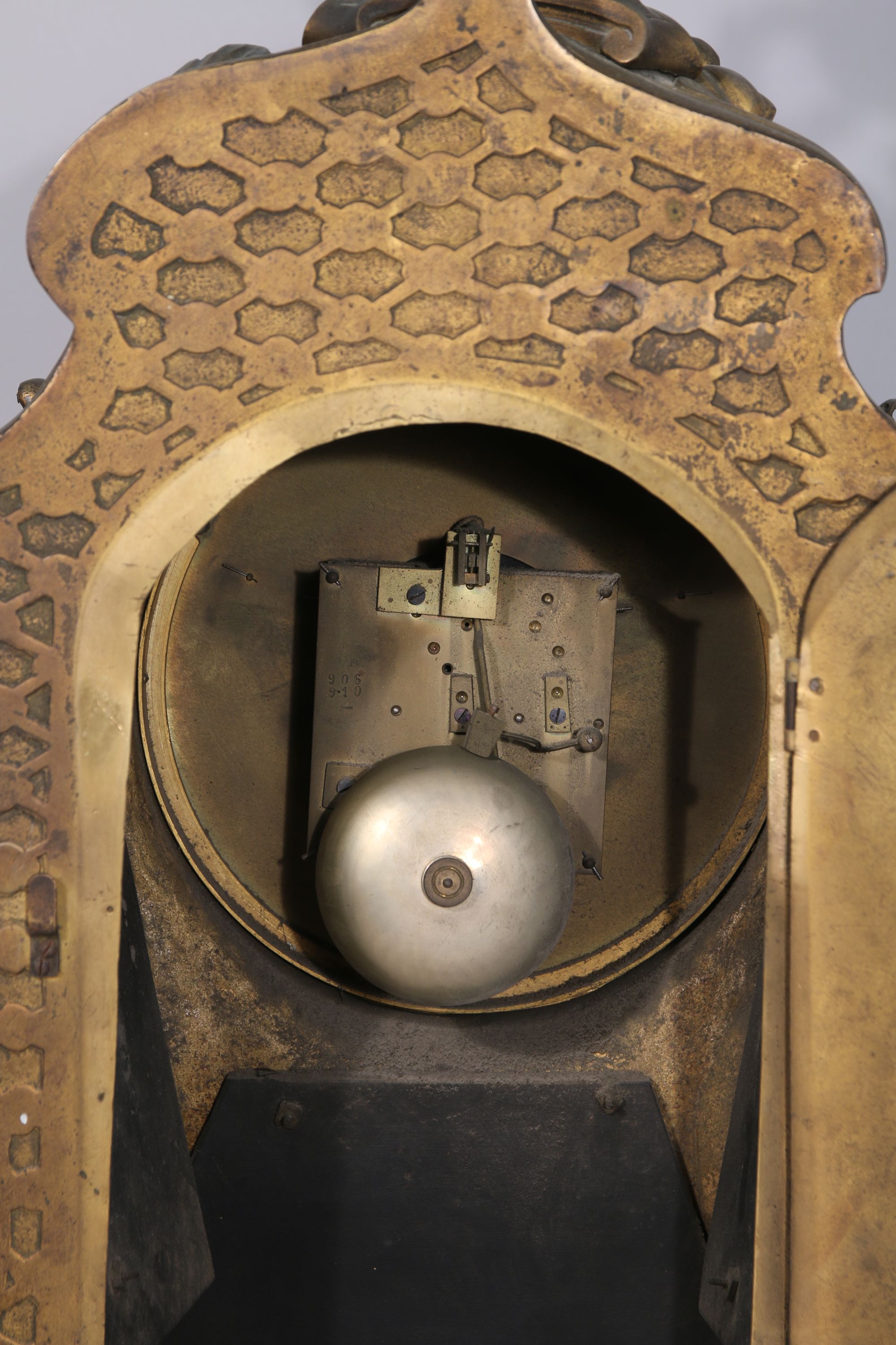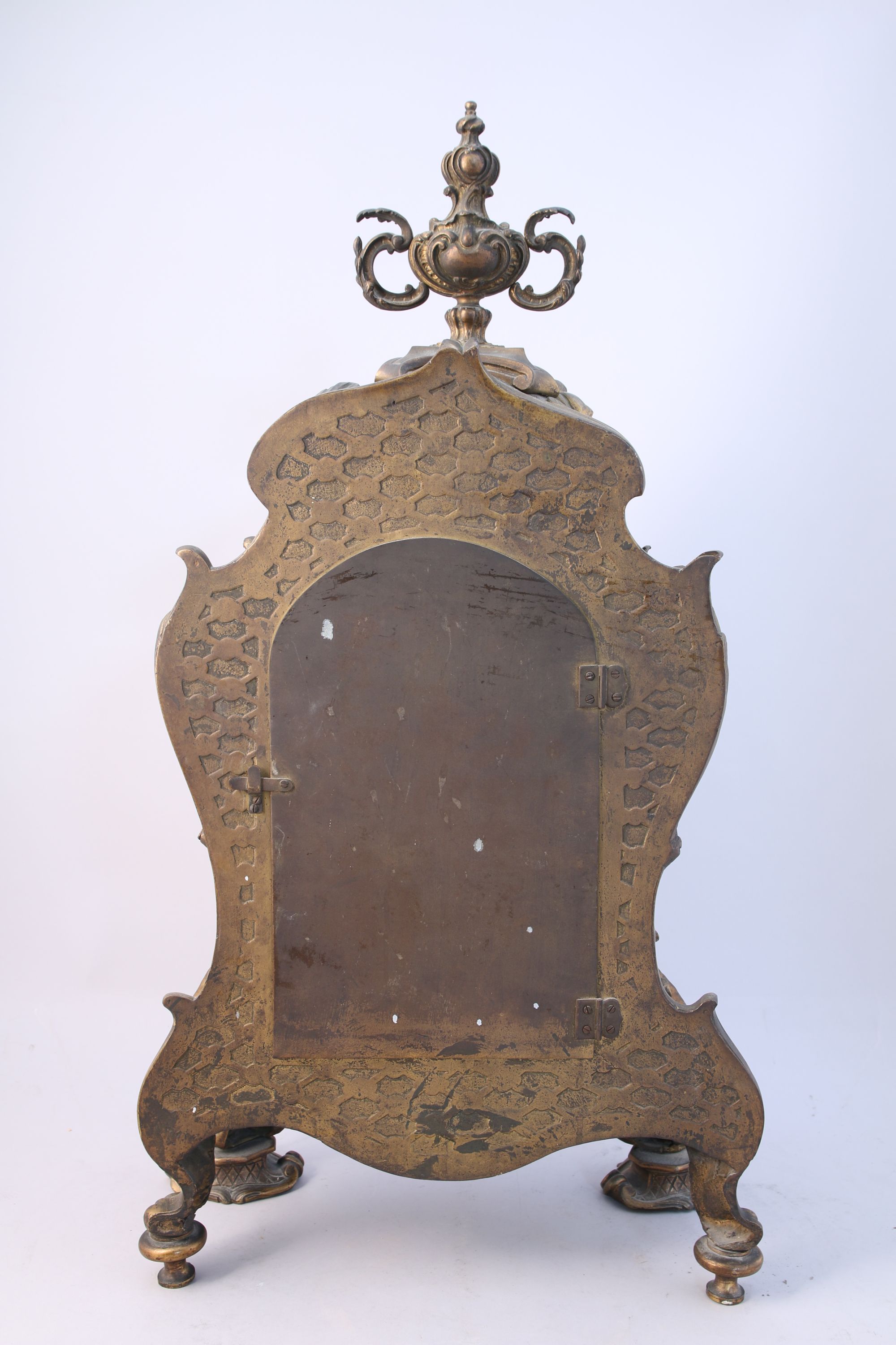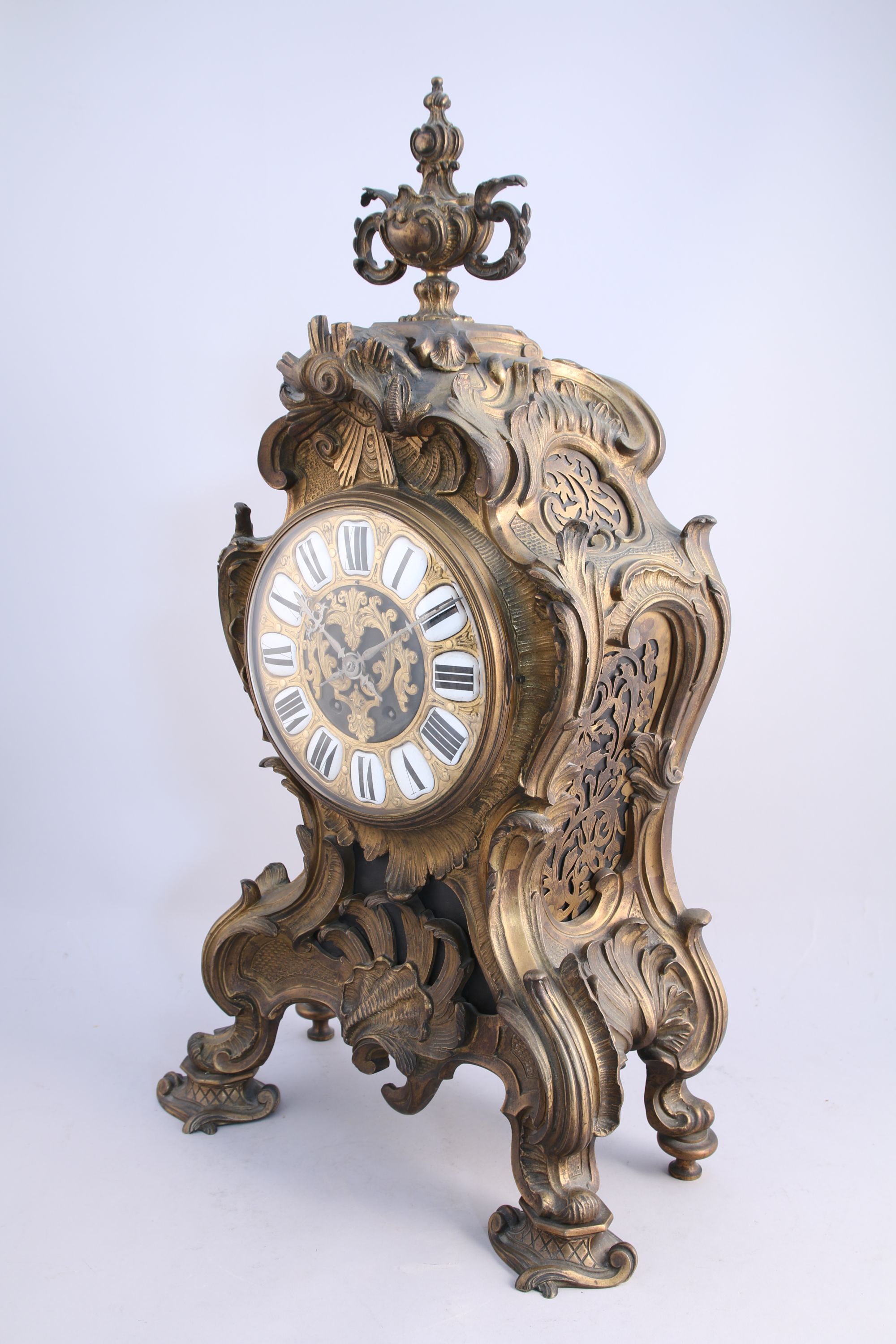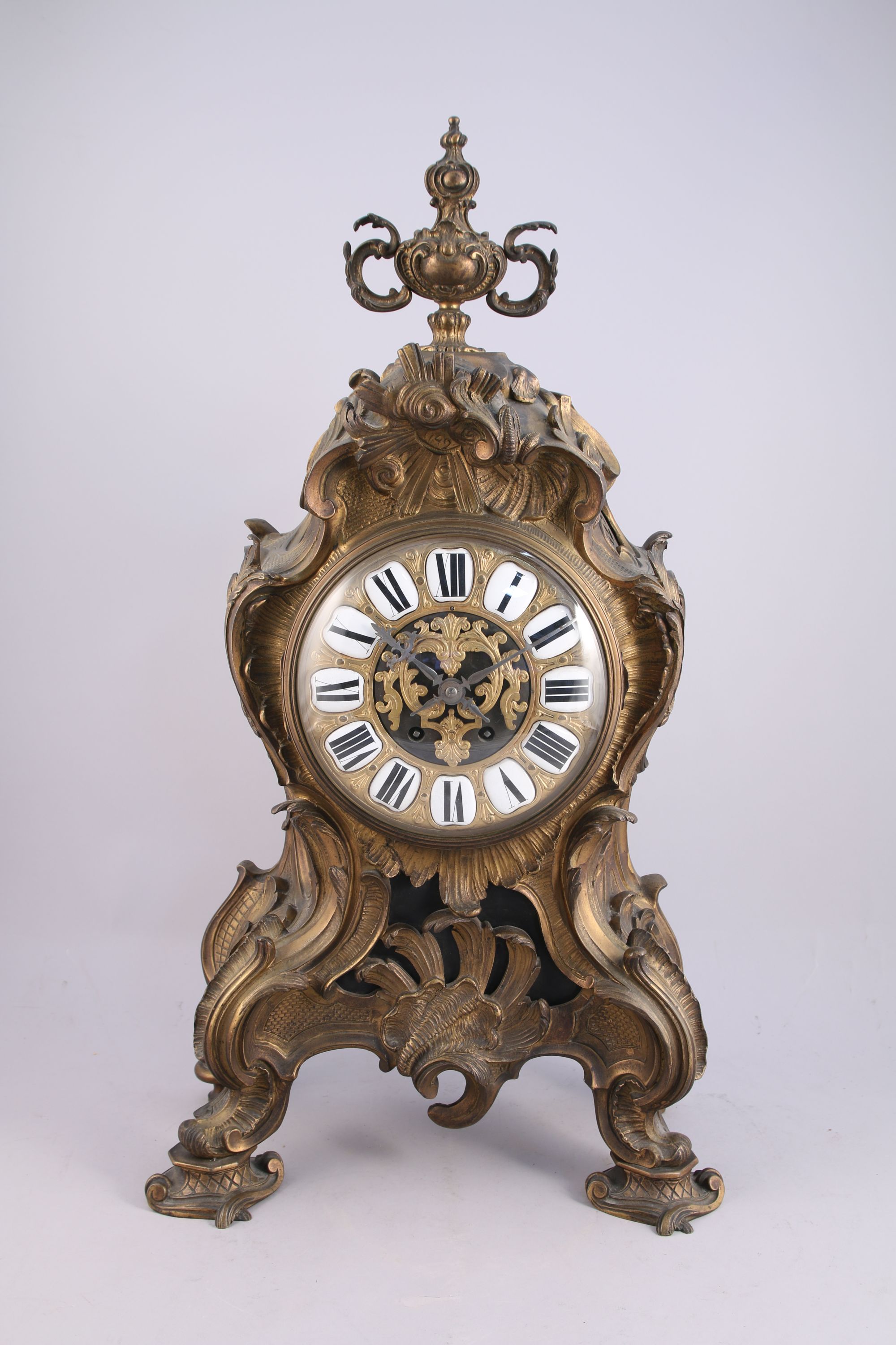 en bronze doré ciselé. Le cadran figurant les heures en chiffres romains dans des cartouches émaillés blanc. Vase sur piédouche à l'amortissement, orné de feuilles d'acanthe et de coquilles, reposant sur quatre pieds à enroulement.