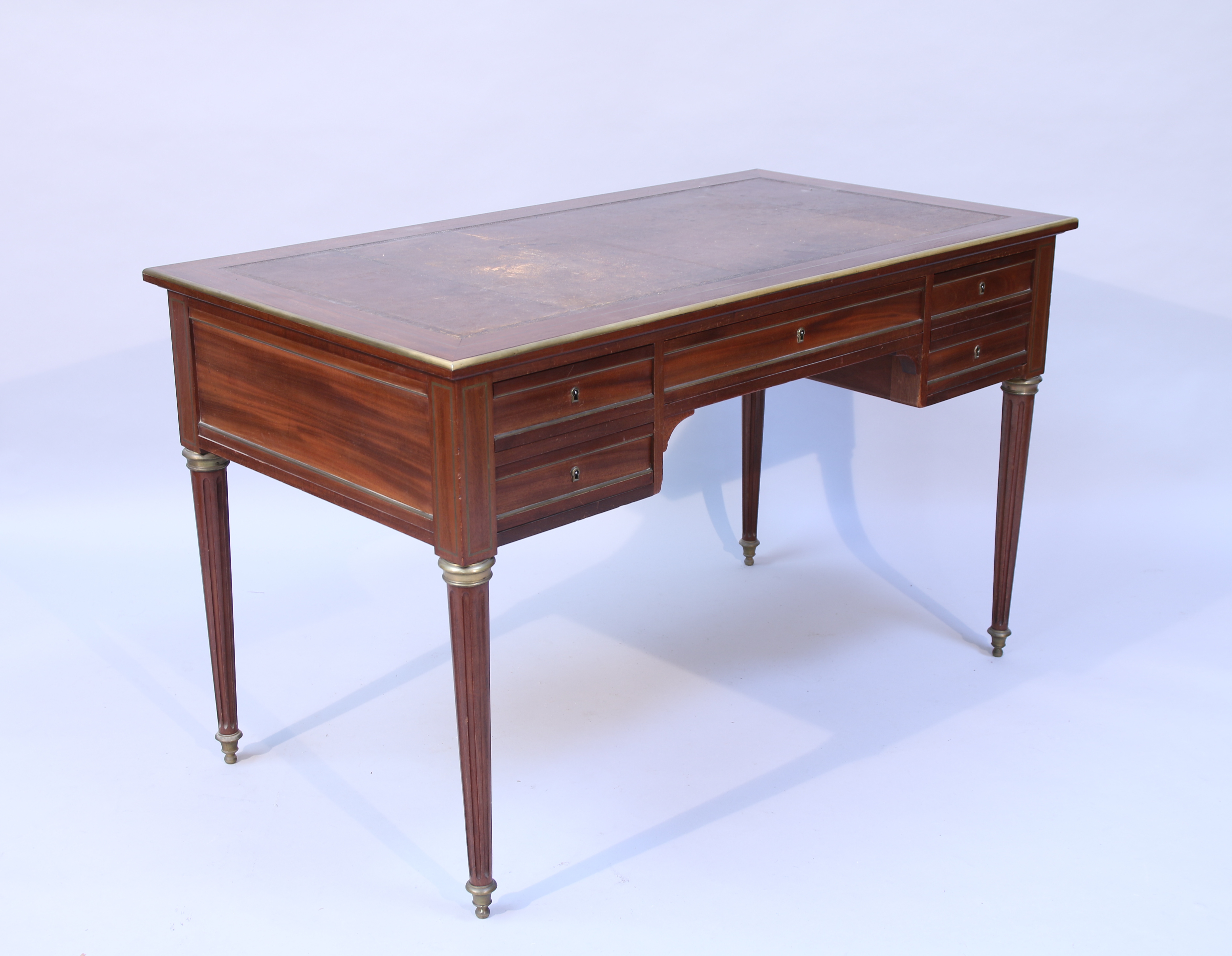 en acajou, ouvrant par quatre tiroirs sur deux rangs. Le plateau ceint d'une lingotière, garni d'un cuir estampé. Piétement fuselé et cannelé, orné de bagues et de sabots en bronze.