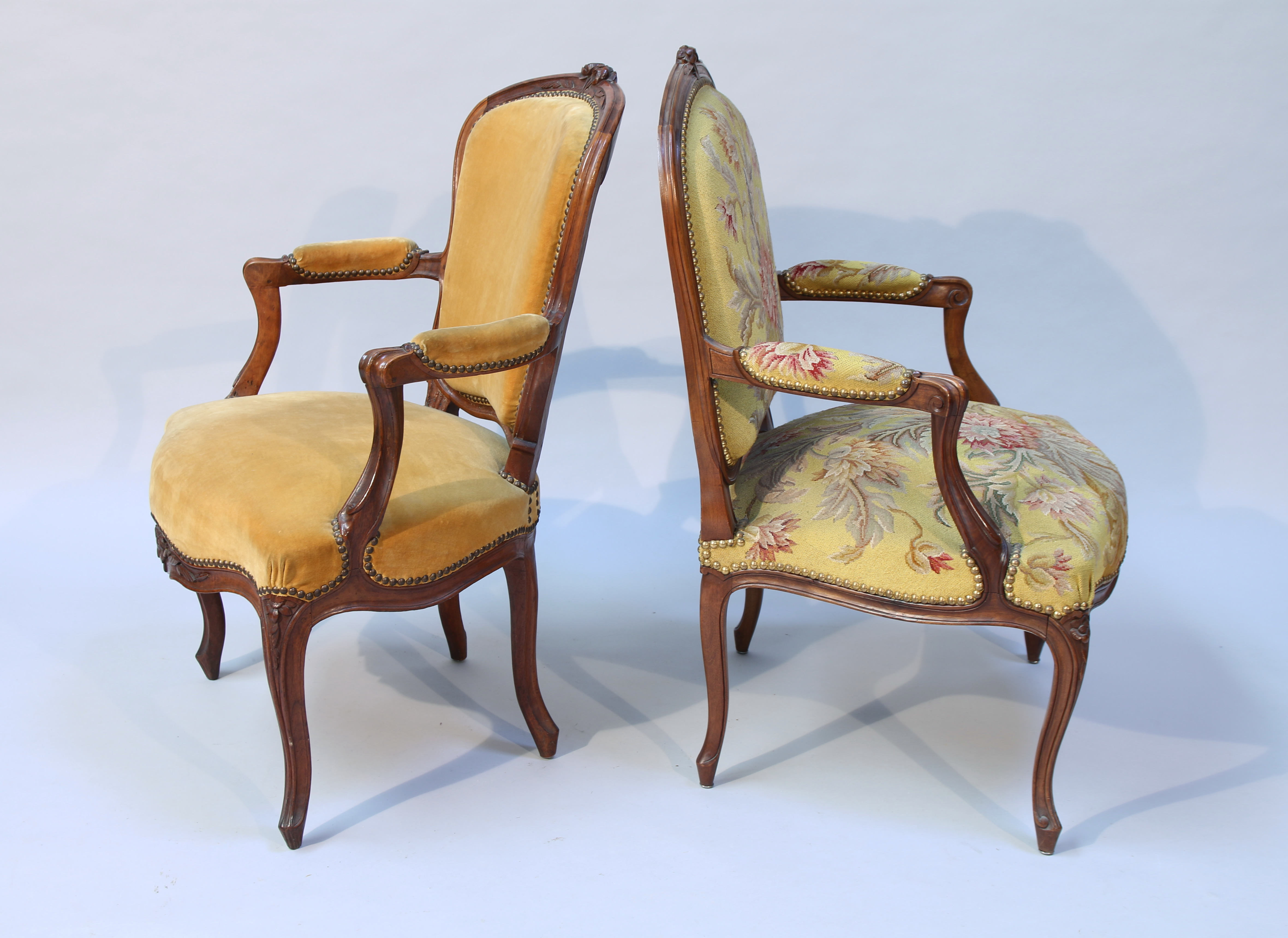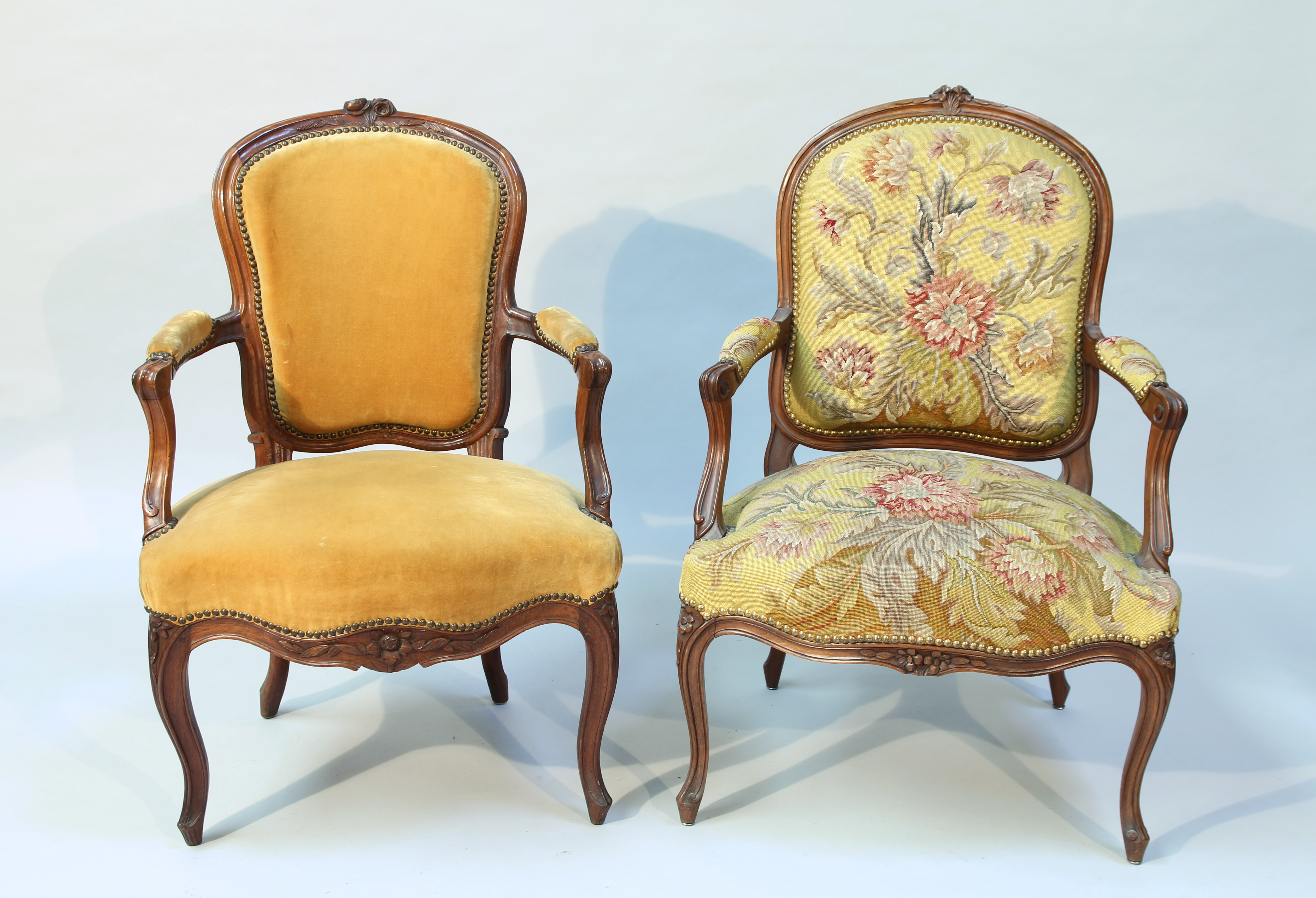 - Le fauteuil en bois mouluré, le dossier droit reposant sur des pieds cambrés. Orné de marguerites sculptées. Recouvert d'un tissu au point au décor de fleurs épanouies. Style Louis XV, fin XIXe - début XXe siècle. Haut. 96, Larg. 65, Prof. 62cm.