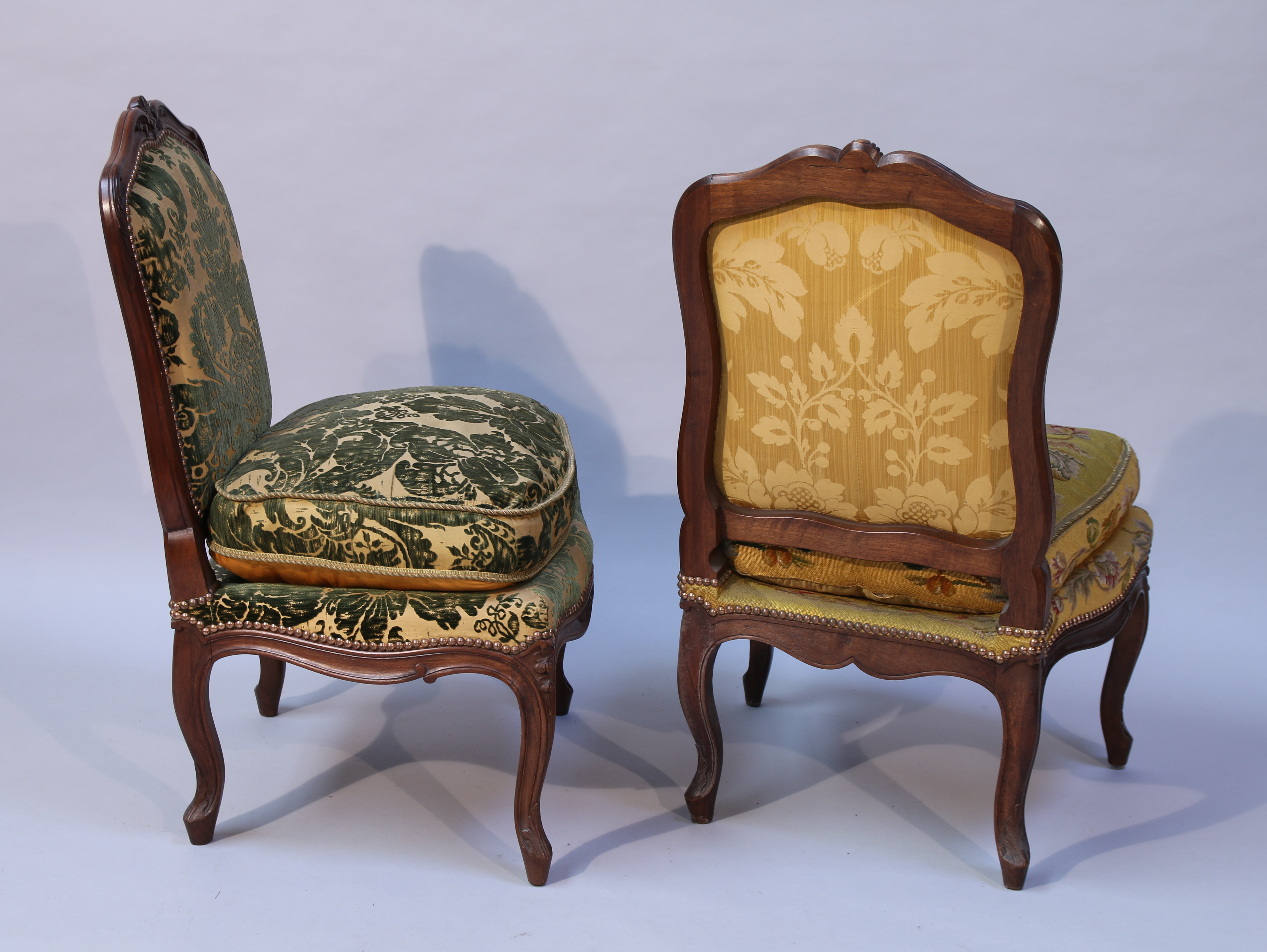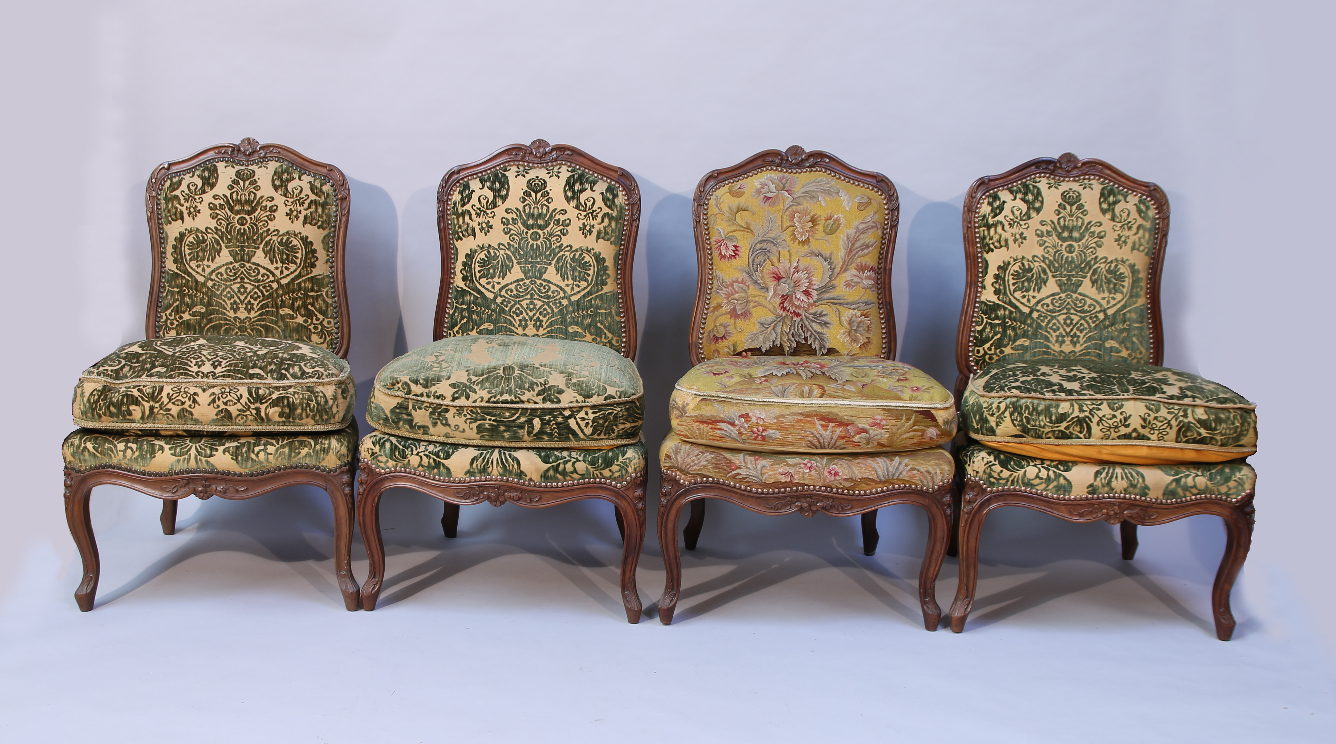 Les chaises basses à dossier plat en bois mouluré et sculpté de fleurs, épaulements feuillagés, reposant sur quatre pieds cambrés sculptés à l'avant et à l'arrière. Trois chaises recouvertes de velours vert et garnies de coussins, une chaise recouverte d'un tissu au point.