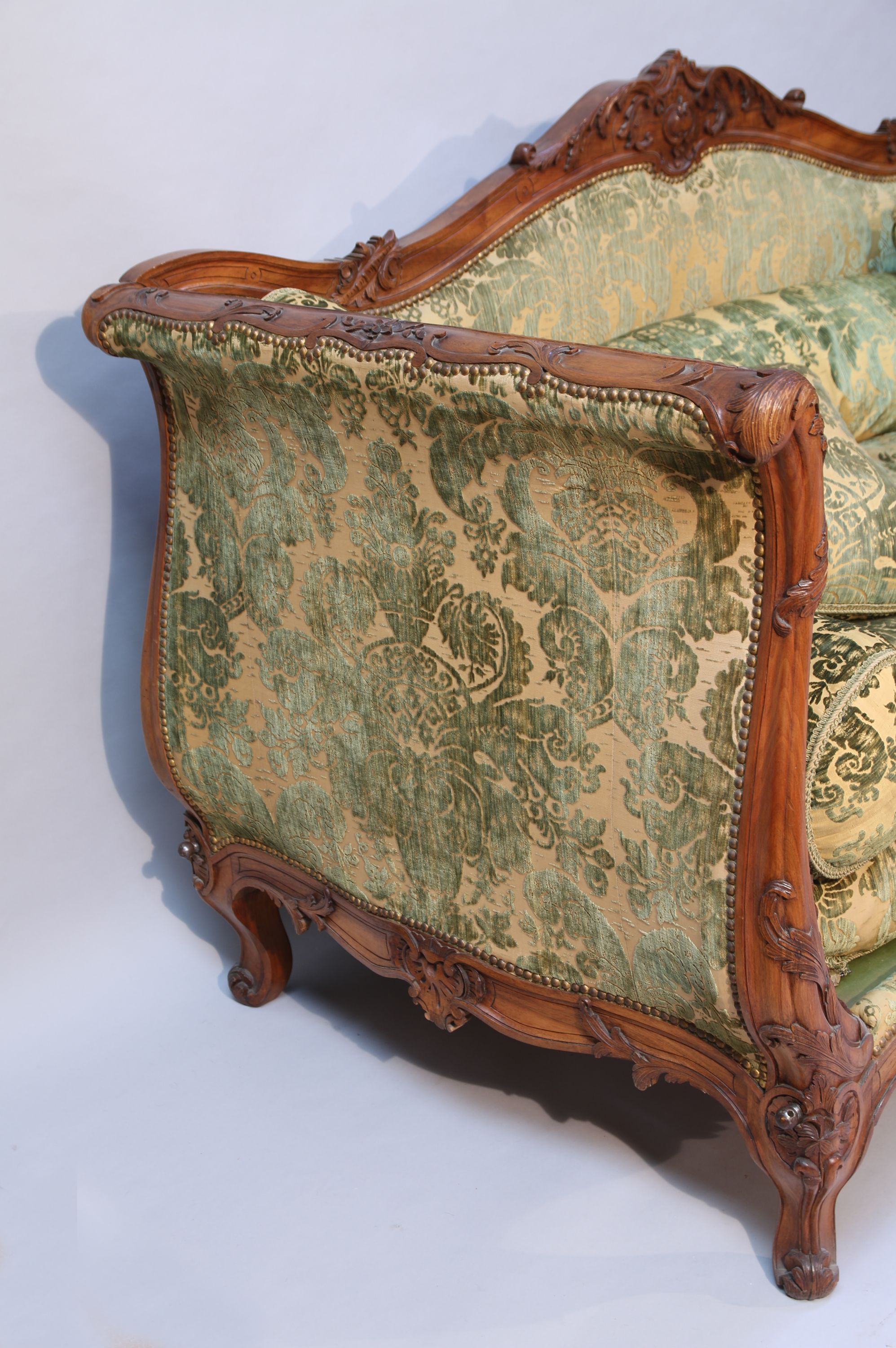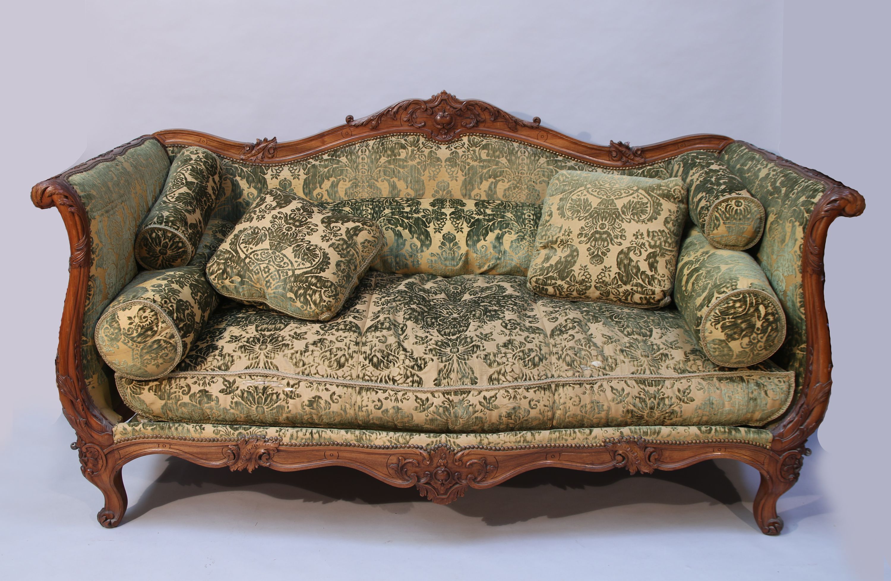 Le canapé en bois mouluré et sculpté de fleurettes et feuillages. Les chevets à crosses. La ceinture chantournée au cul de lampe orné de branchages. Reposant sur quatre pieds cambrés. Garni de coussins en velours vert (petits accidents).