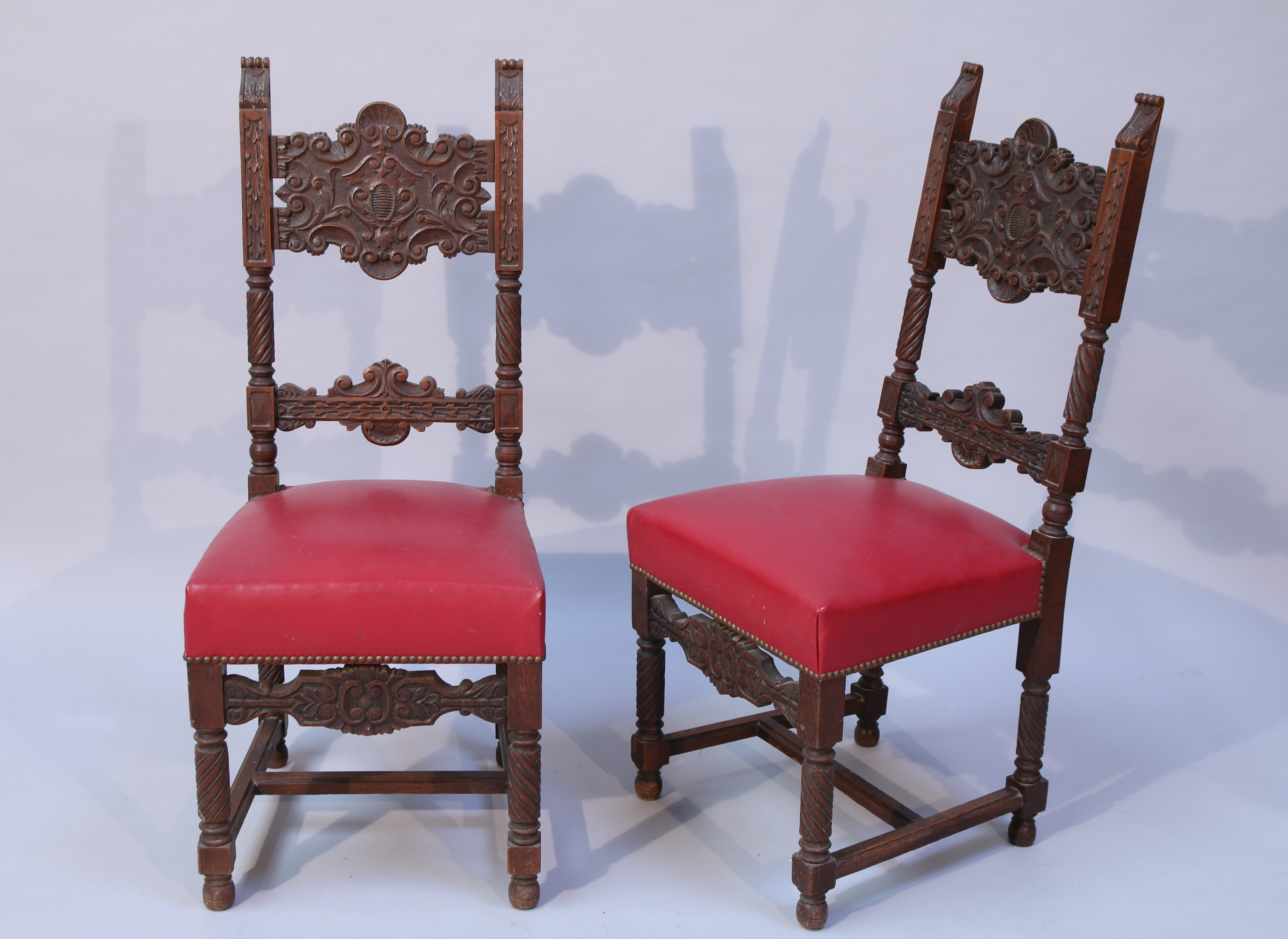 en chêne richement sculpté d'enroulements feuillagés, acanthes, perles, agrafes coquilles et colonnes torses. Elles reposent sur quatre pieds réunis par une entretoise en "H".