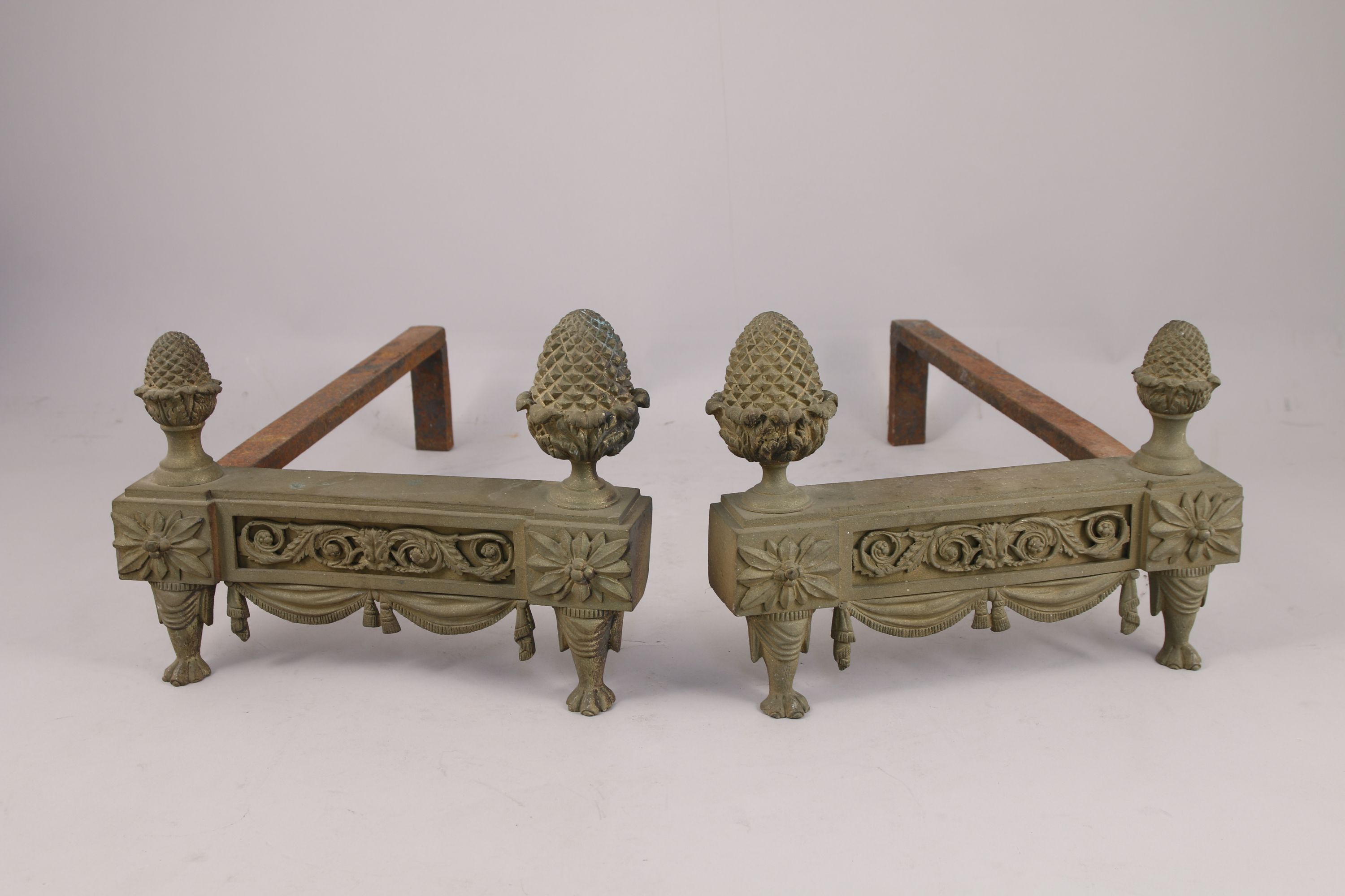 de forme rectangulaire en laiton à décor de deux pommes de pin, frise de rinceaux, fleurons et draperies. Ils reposent sur deux pieds griffe.