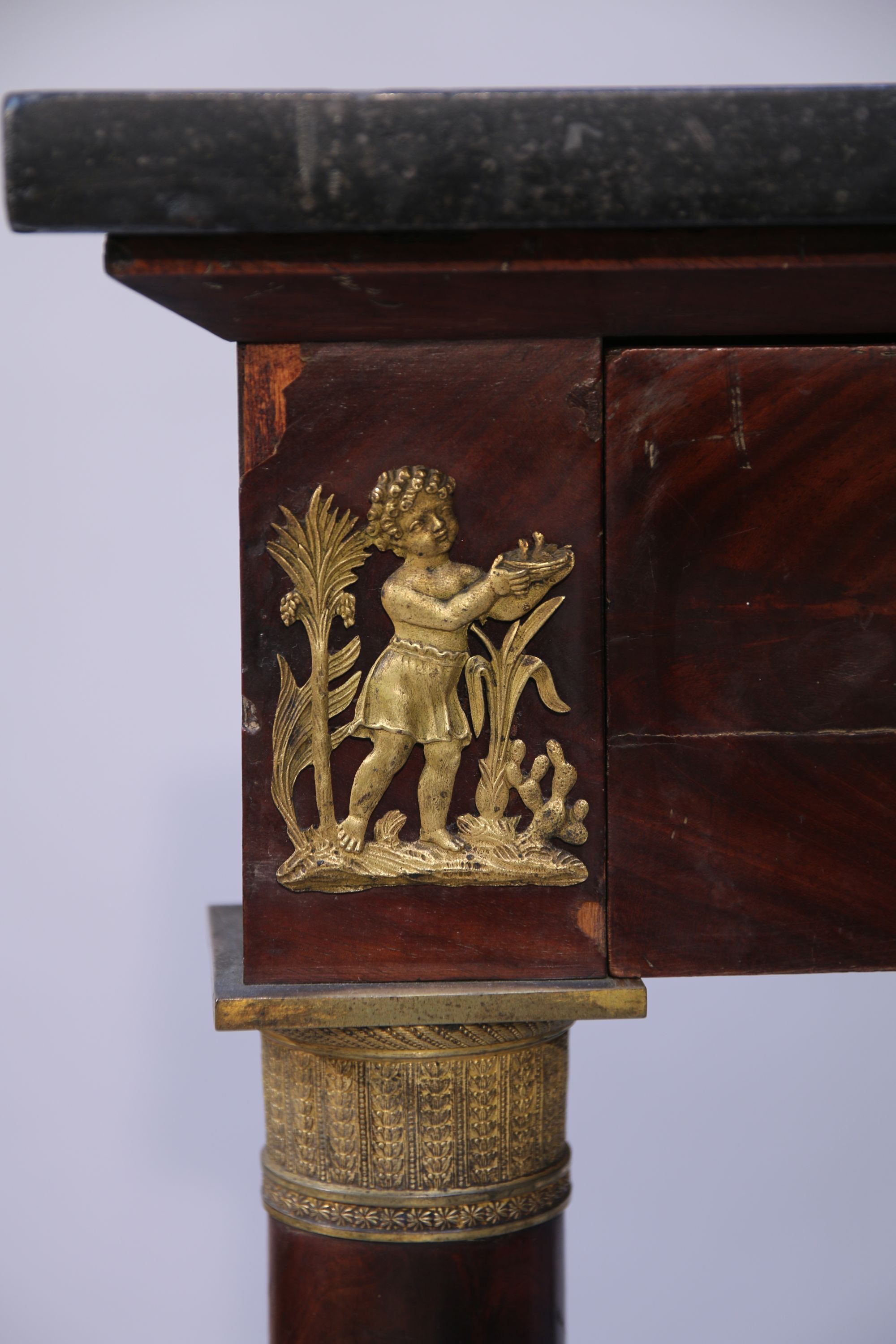et placage d'acajou ouvrant en façade par un tiroir en ceinture. Montants antérieurs en colonne, postérieurs en pilastre reposants sur une plinthe. Ornementation de bronzes ciselés et dorés tels que chapiteaux et bases des colonnes, entrée de serrure ornée de cornes d'abondance à l'ananas, et appliques ajourées: un putto figurant une allégorie de l'Amérique et un putto bachique. Dessus de marbre granit belge.
