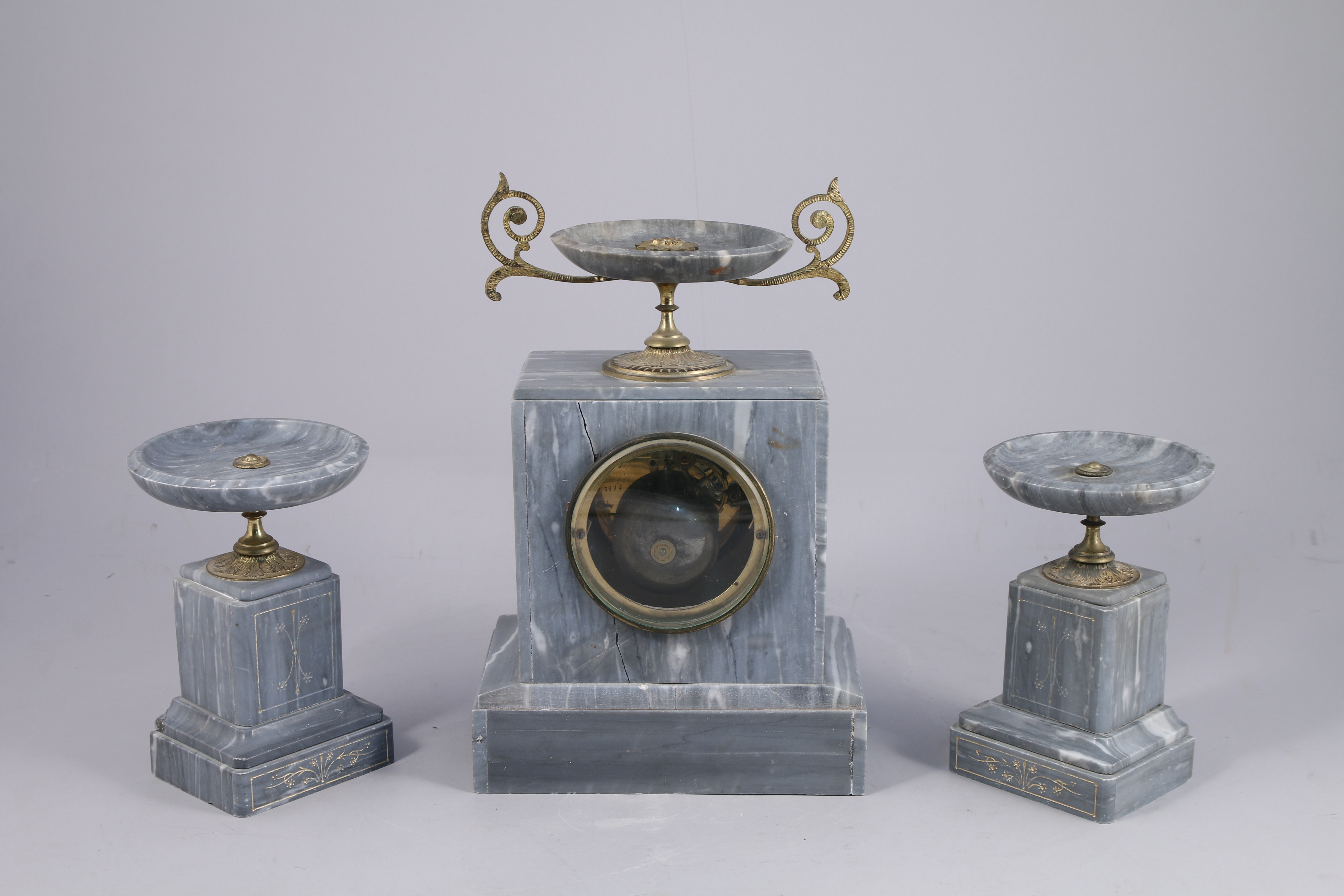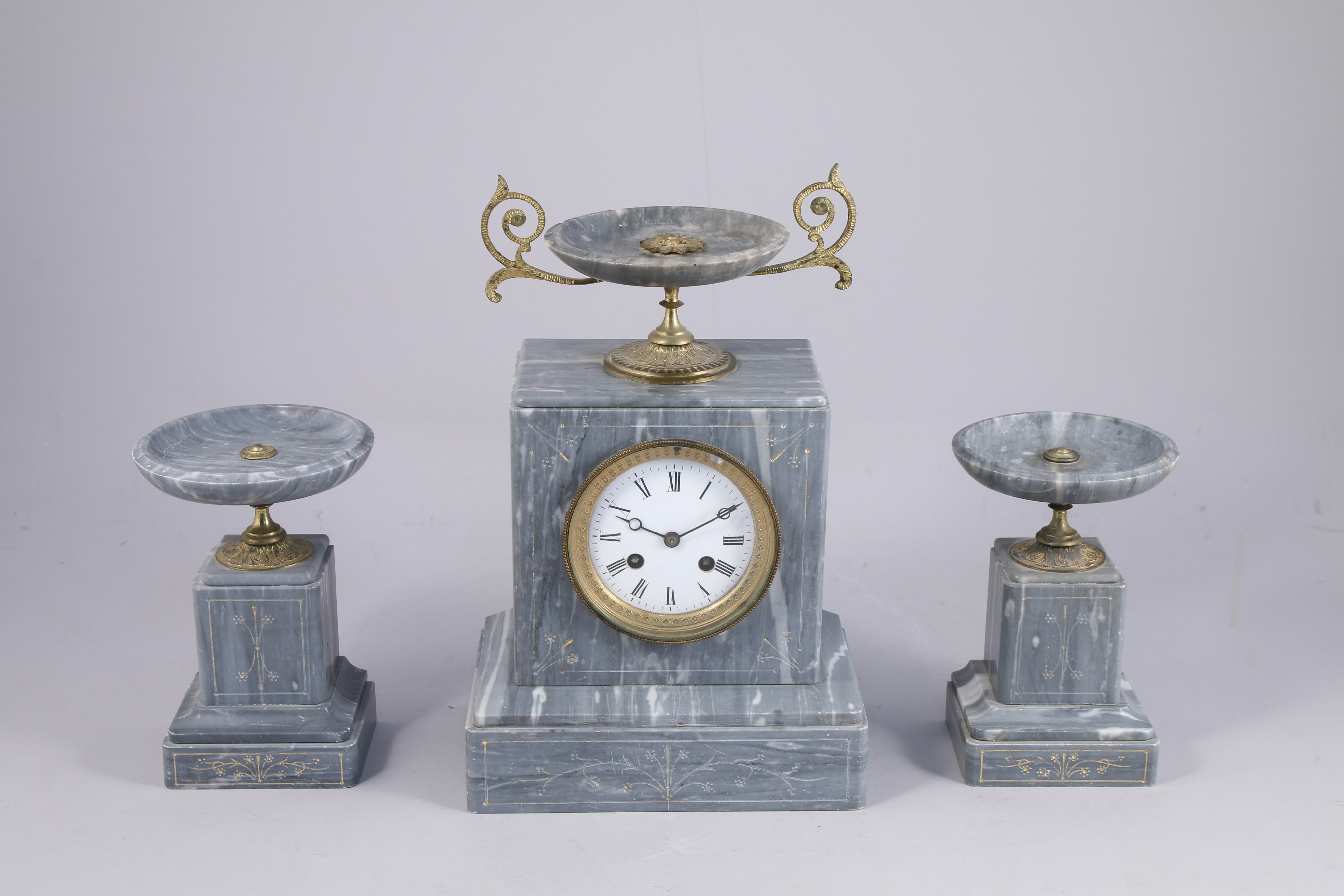 - GARNITURE DE CHEMINÉE en marbre bleu Turquin gravé de motifs feuillagés stylisés. Elle se compose d'une PENDULE borne sommée d'une coupe et de deux COUPES. Bases de forme rectangulaire. Haut. 33,5 cm. Larg. 21,5 cm. (manque le balancier)