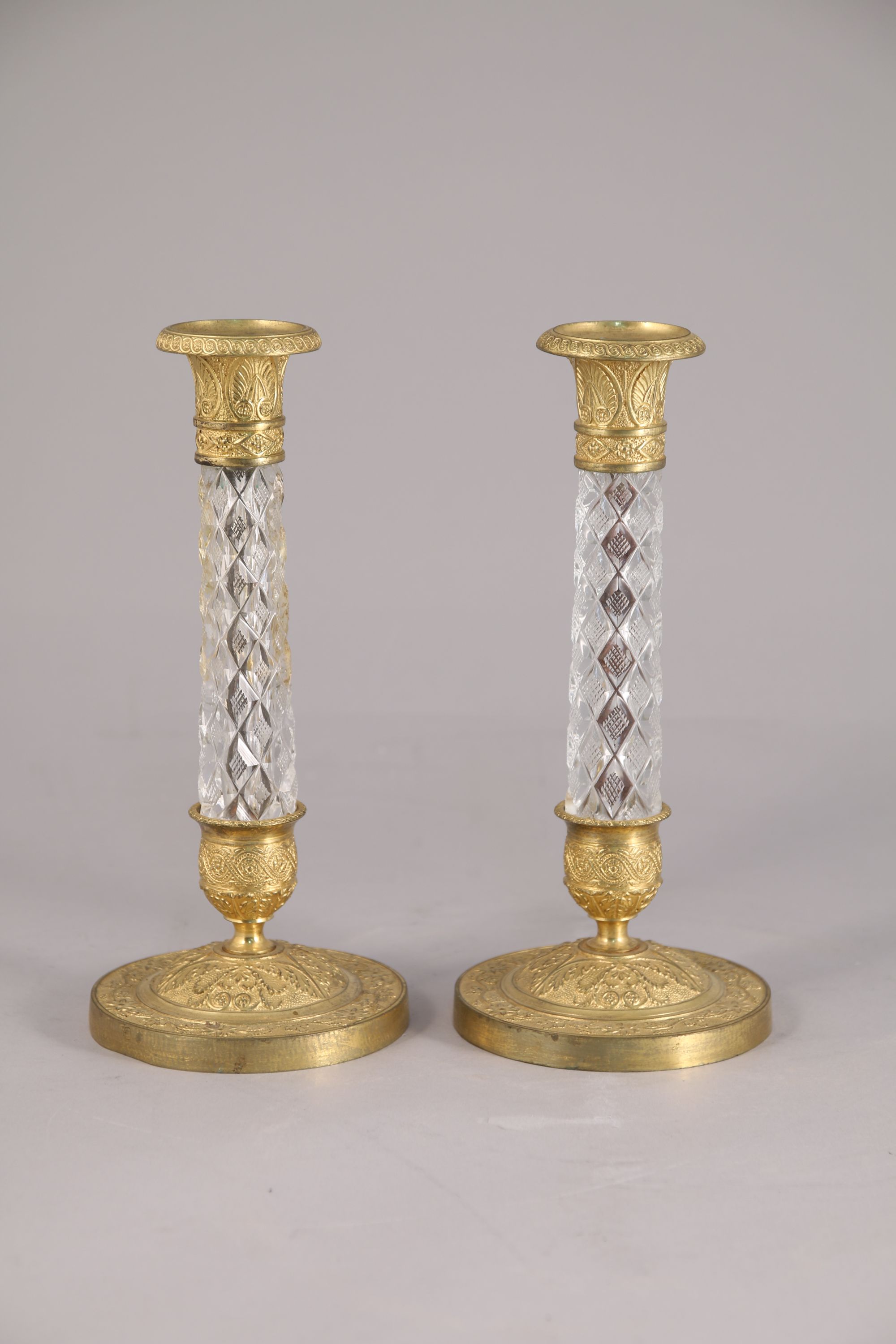 en bronze doré et fût en cristal taillé de losanges. Décor de palmettes, entrelacs, acanthes, volutes et fleurons.