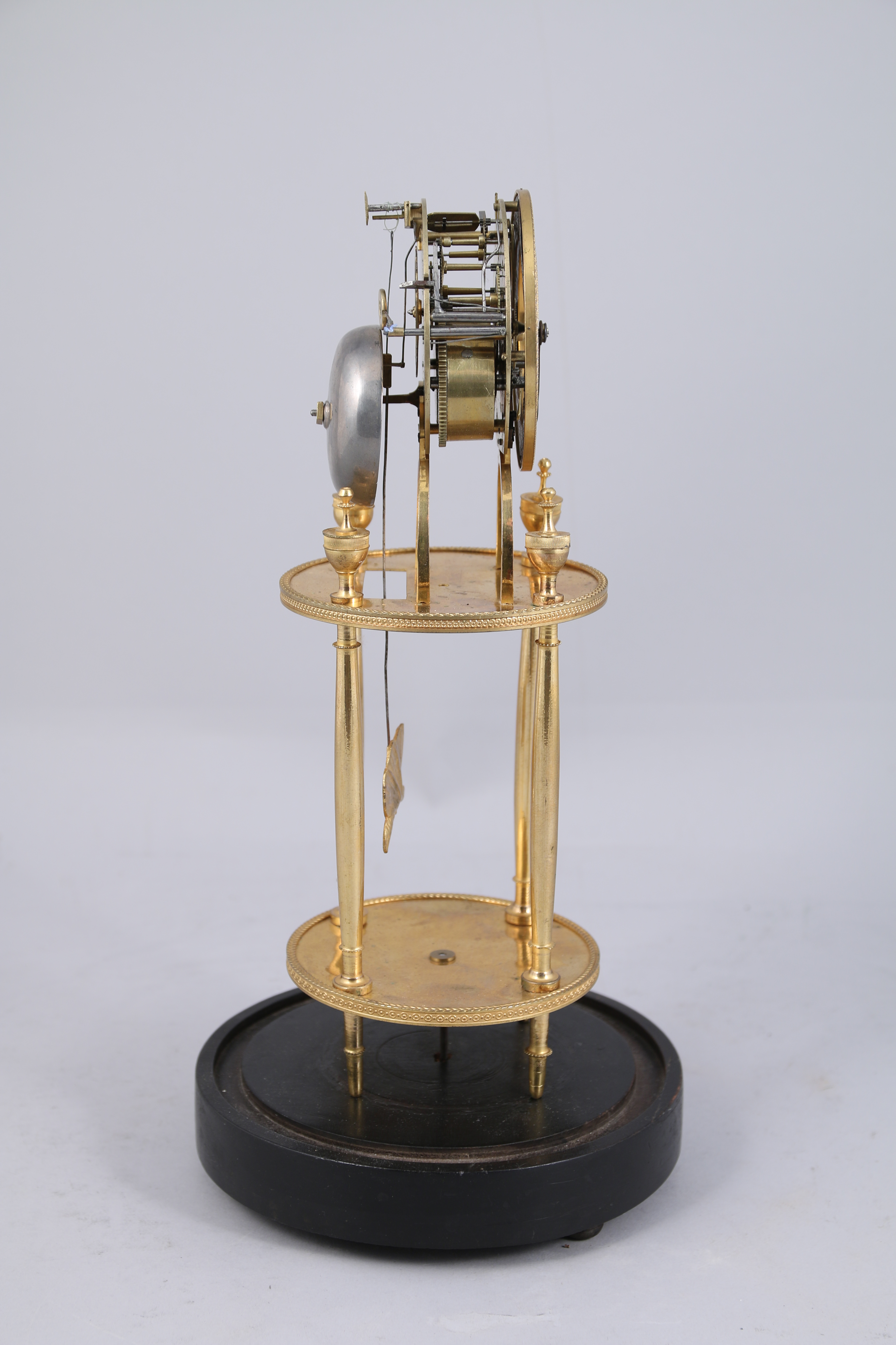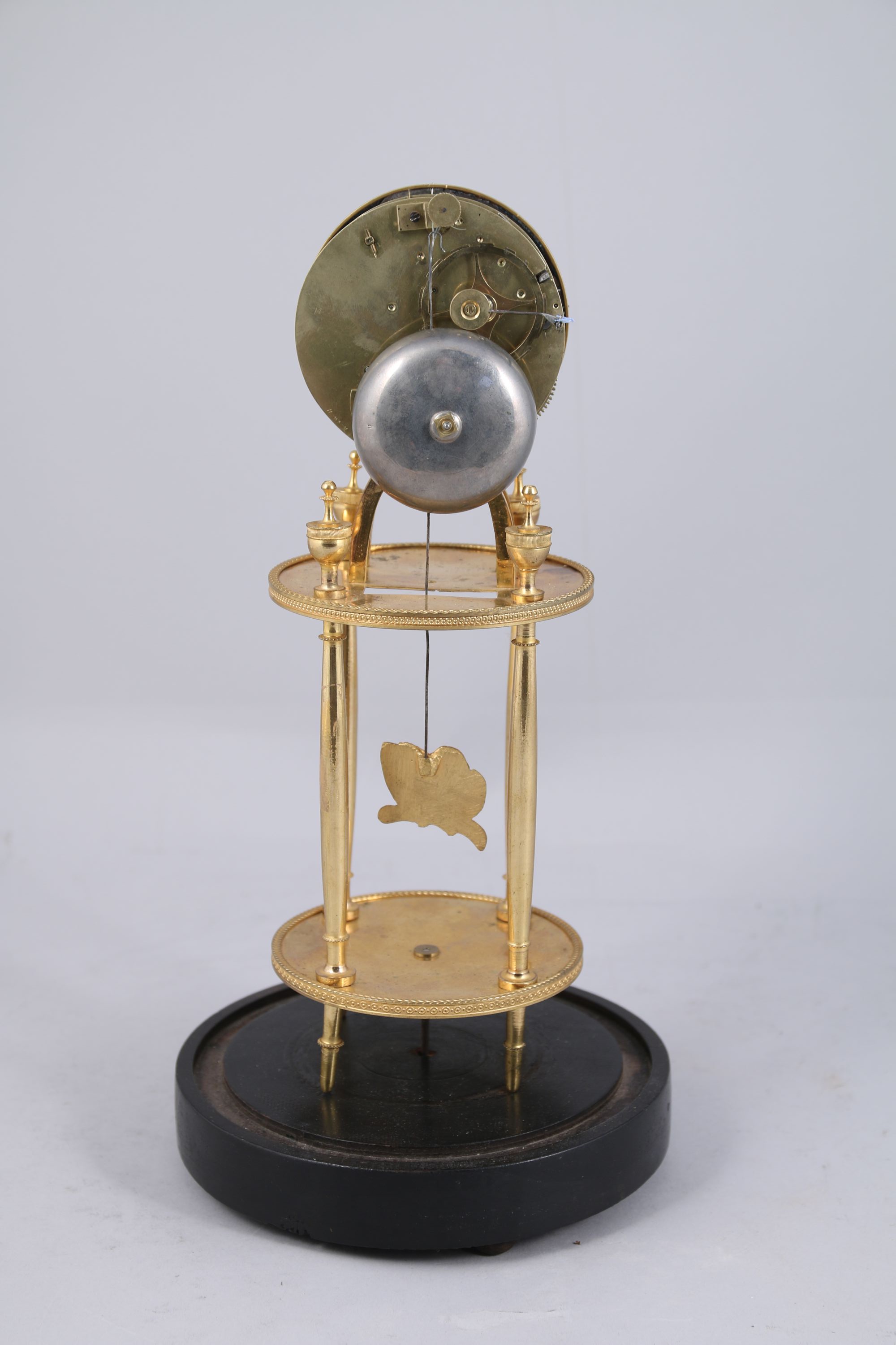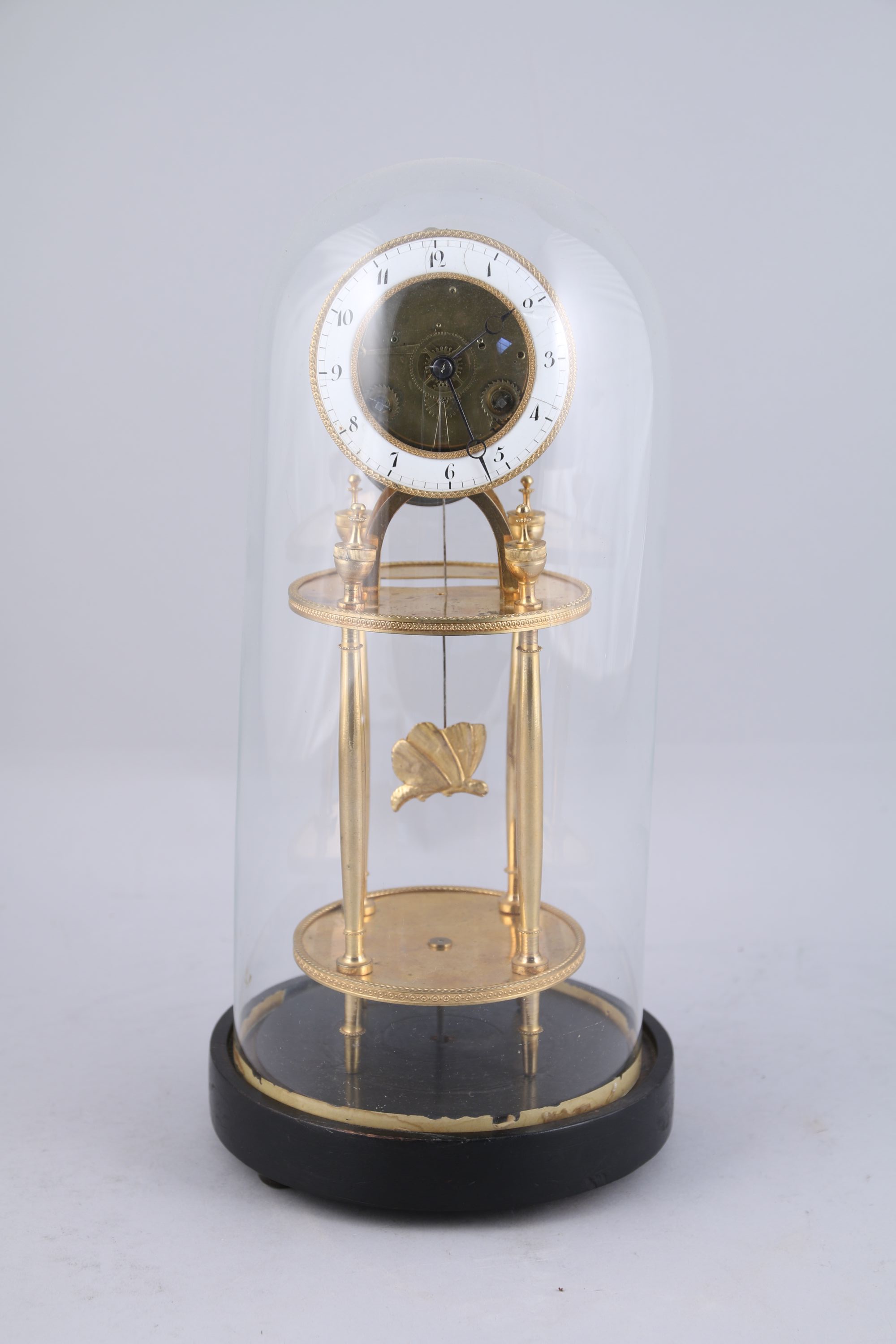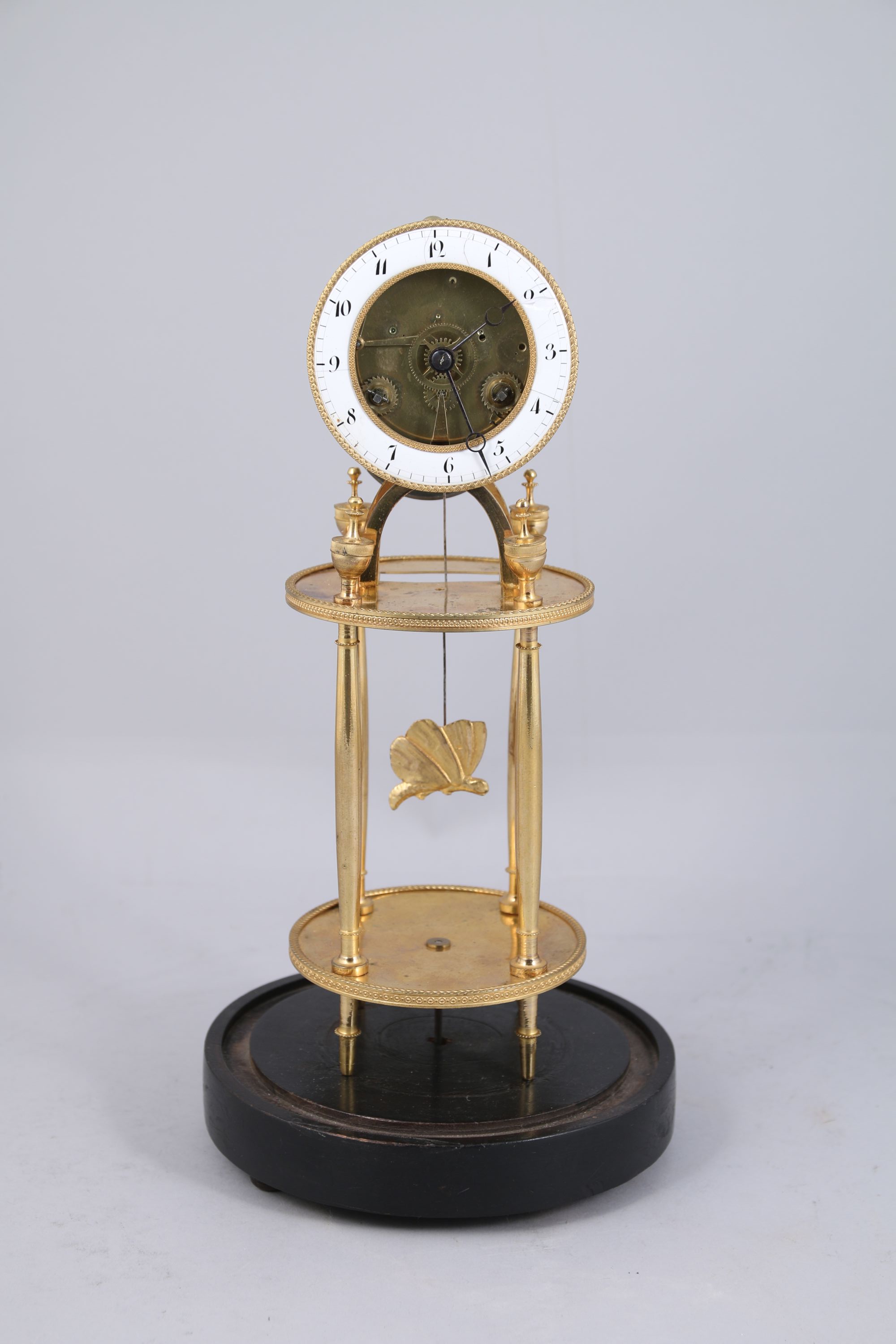 Le cadran circulaire émaillé blanc, les heures en chiffres arabes autour d'un chemin de fer. Le mouvement reposant sur quatre colonnettes reliées par deux étages circulaires, surmontées de pots à feu. Entre ces cercles superposés le balancier prend la forme d'un papillon. Suspension à fil.