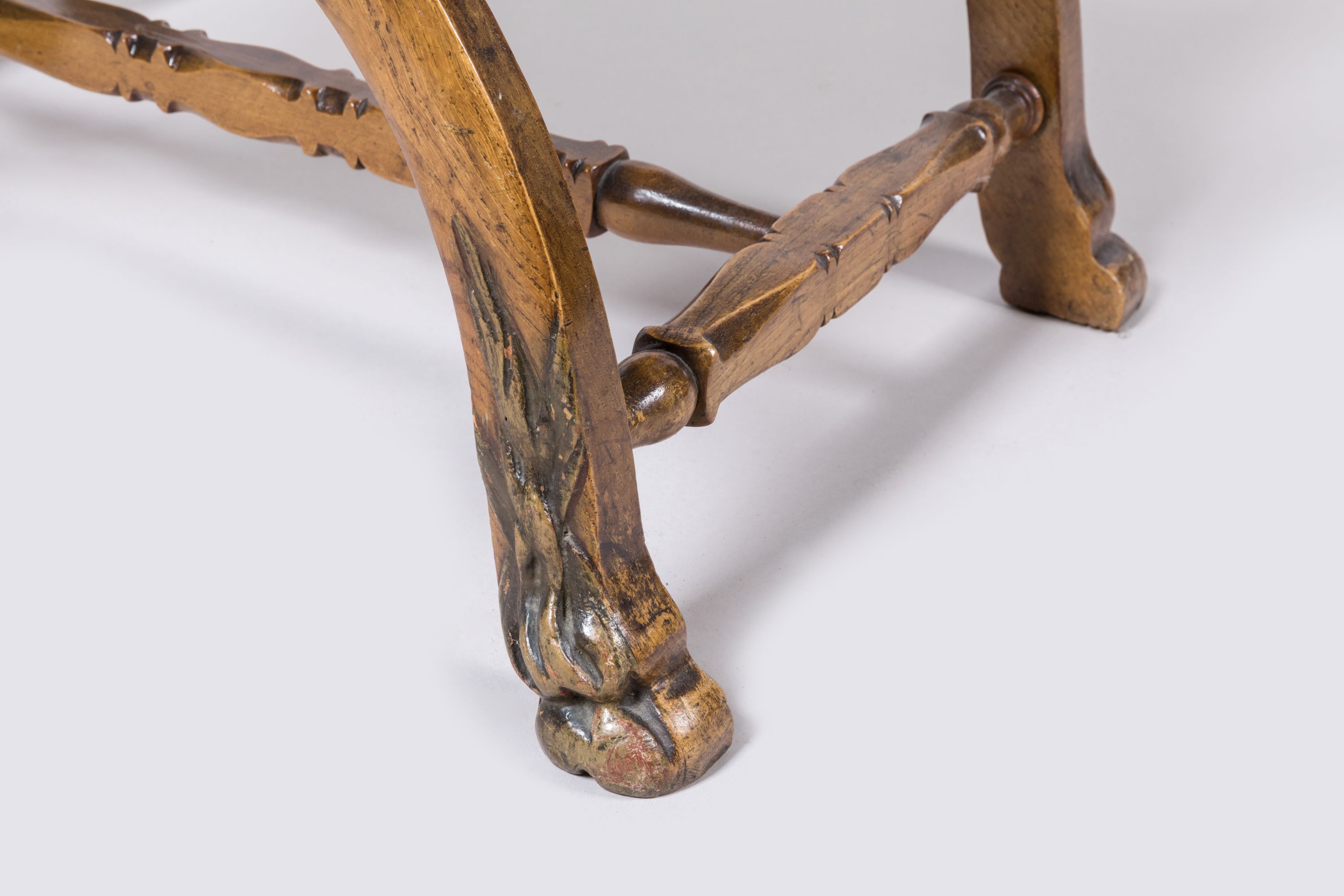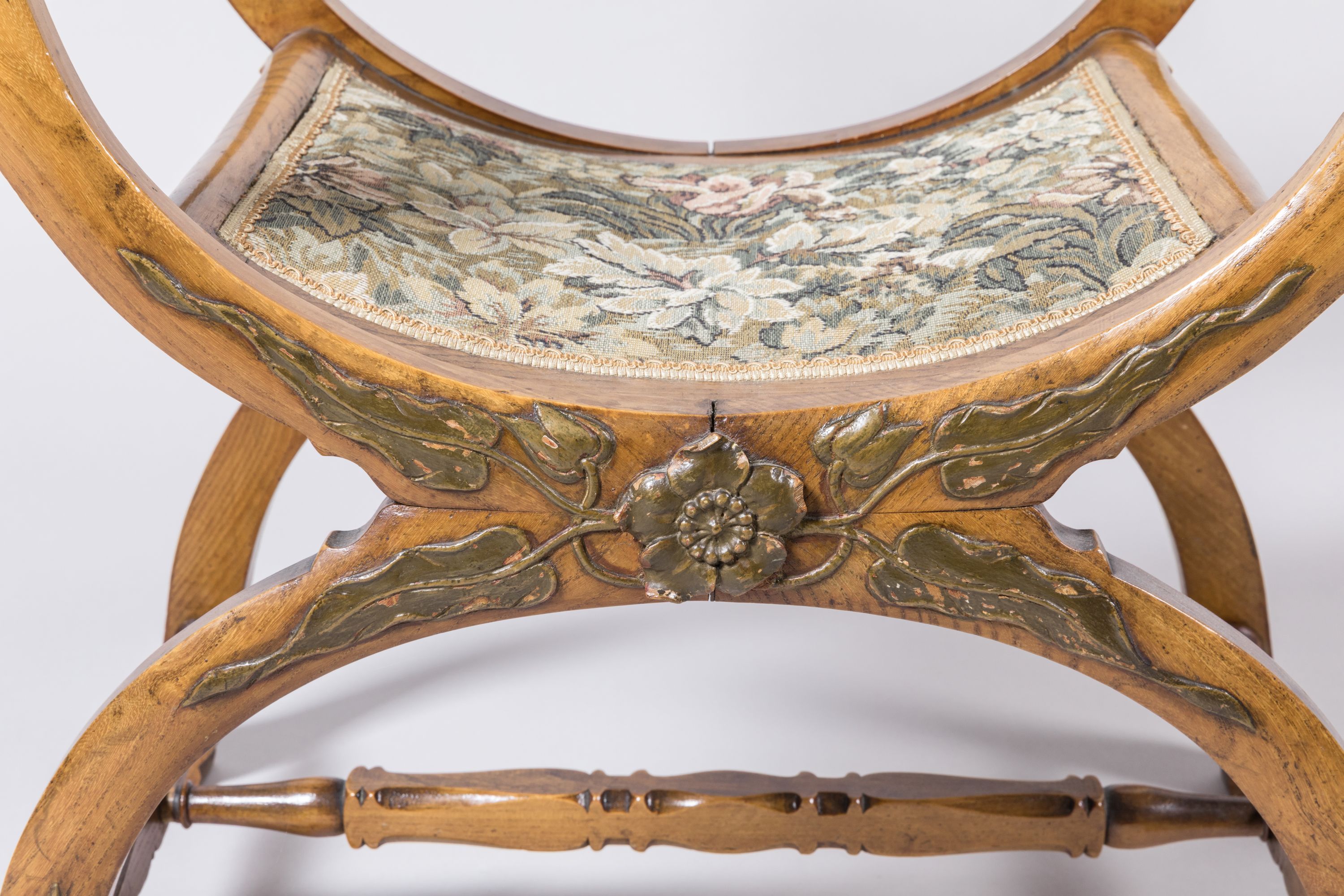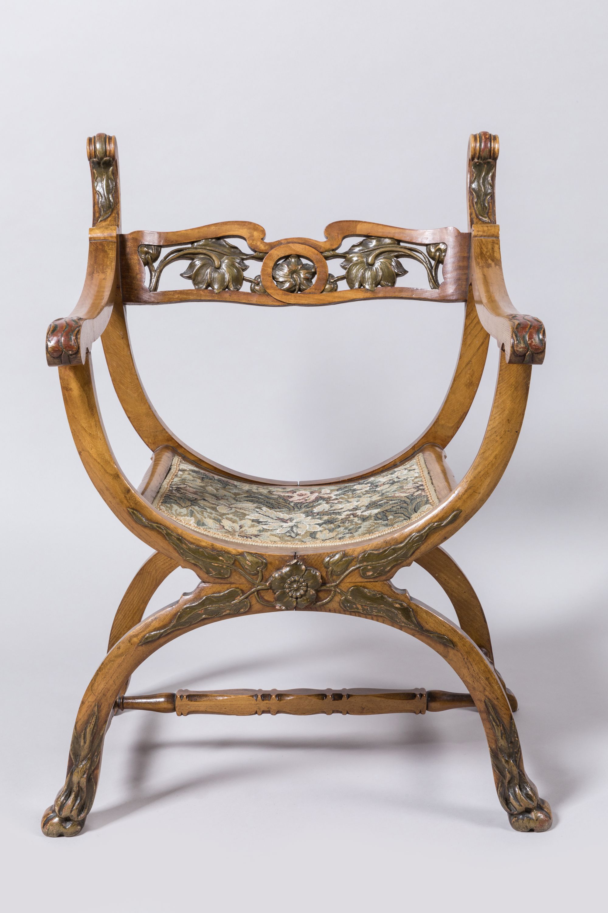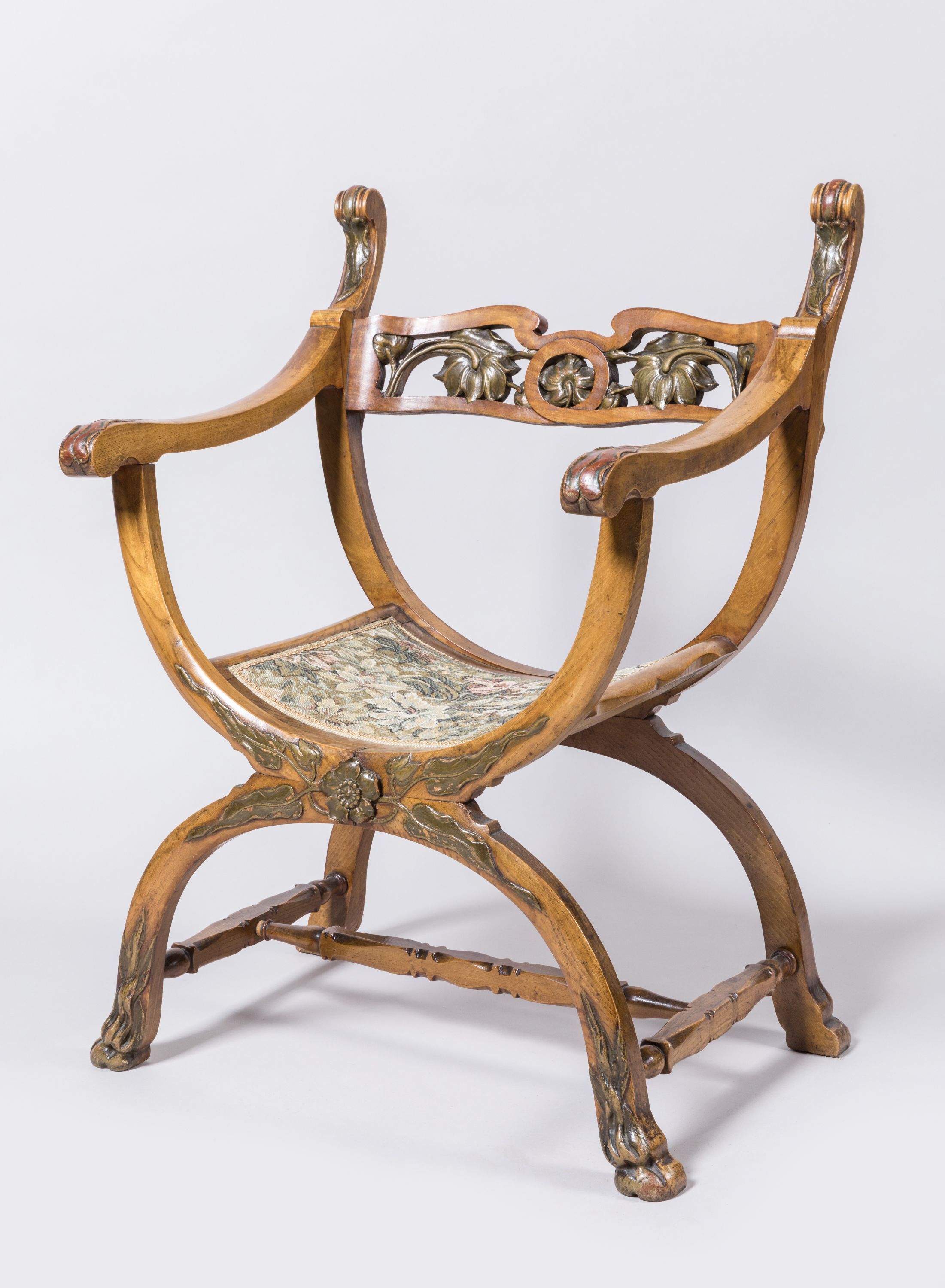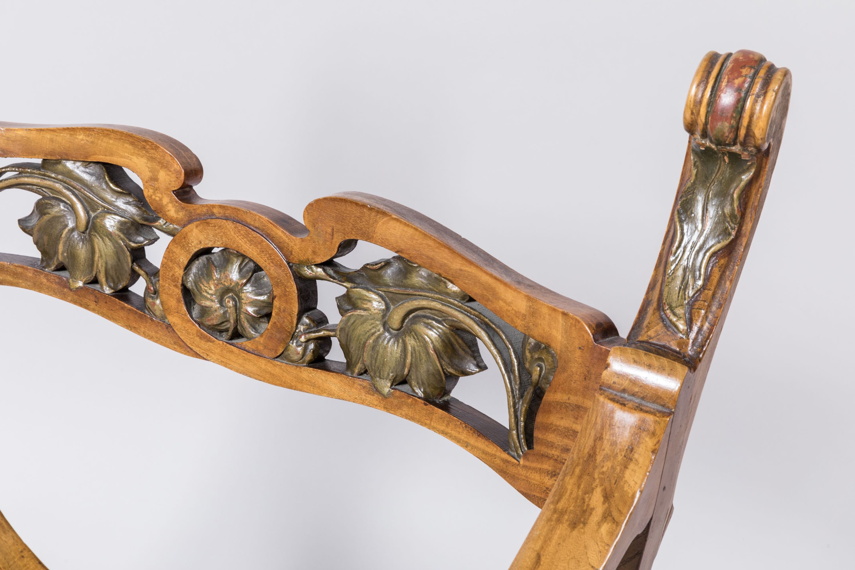 en bois clair sculpté et ajouré de fleurs et feuillages laqués or. Il repose sur quatre pieds réunis par une entretoise en H.