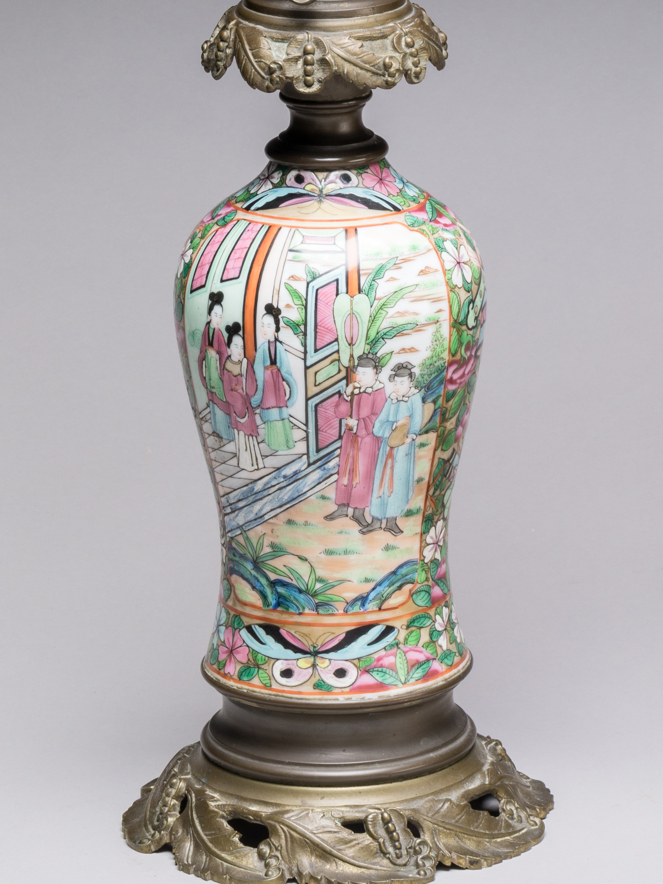 en porcelaine émaillée polychrome de scènes de palais, fleurs et objets mobiliers dans le goût de la Chine. Monture en bronze à décor de plumes. Cheminées et globes (accidents)