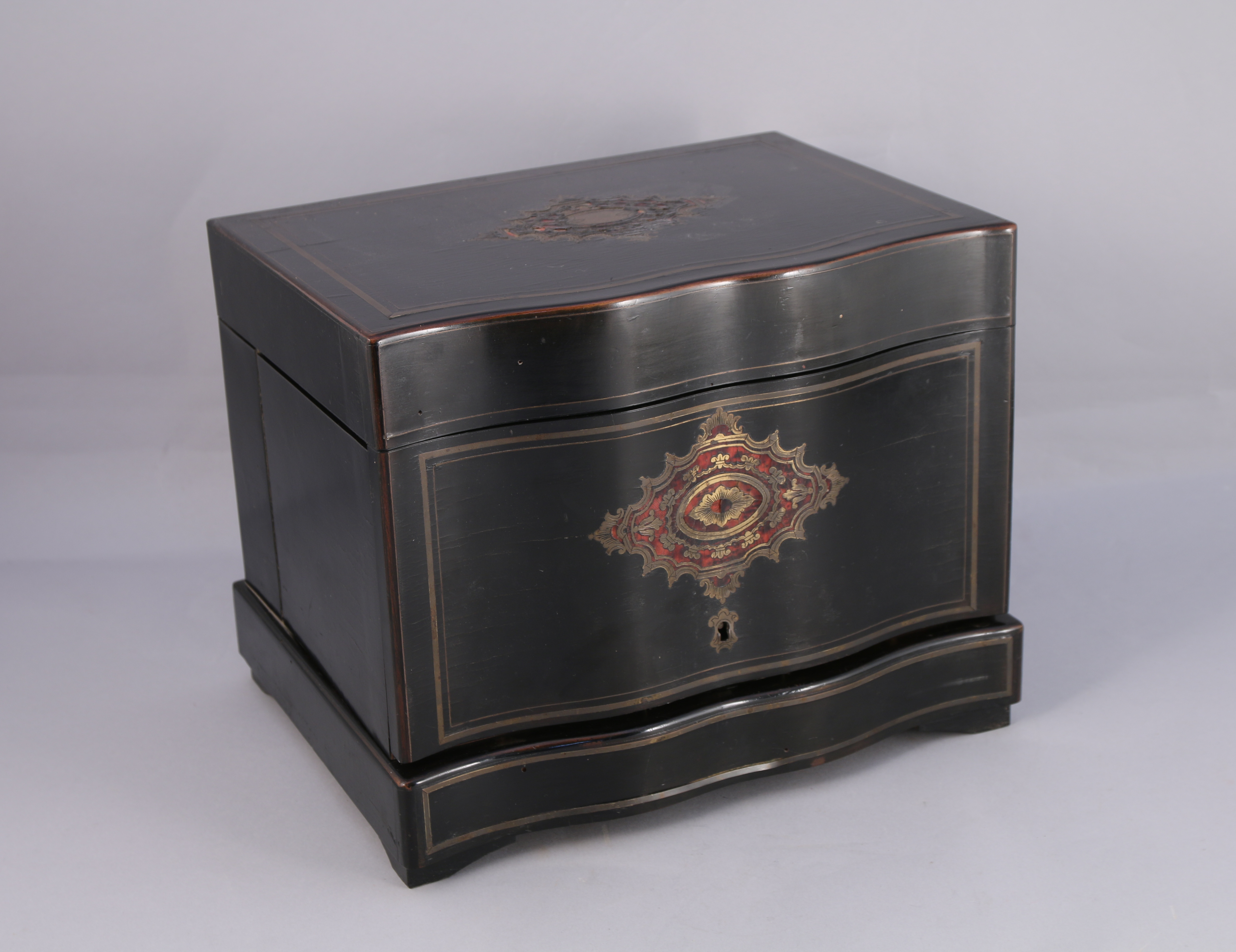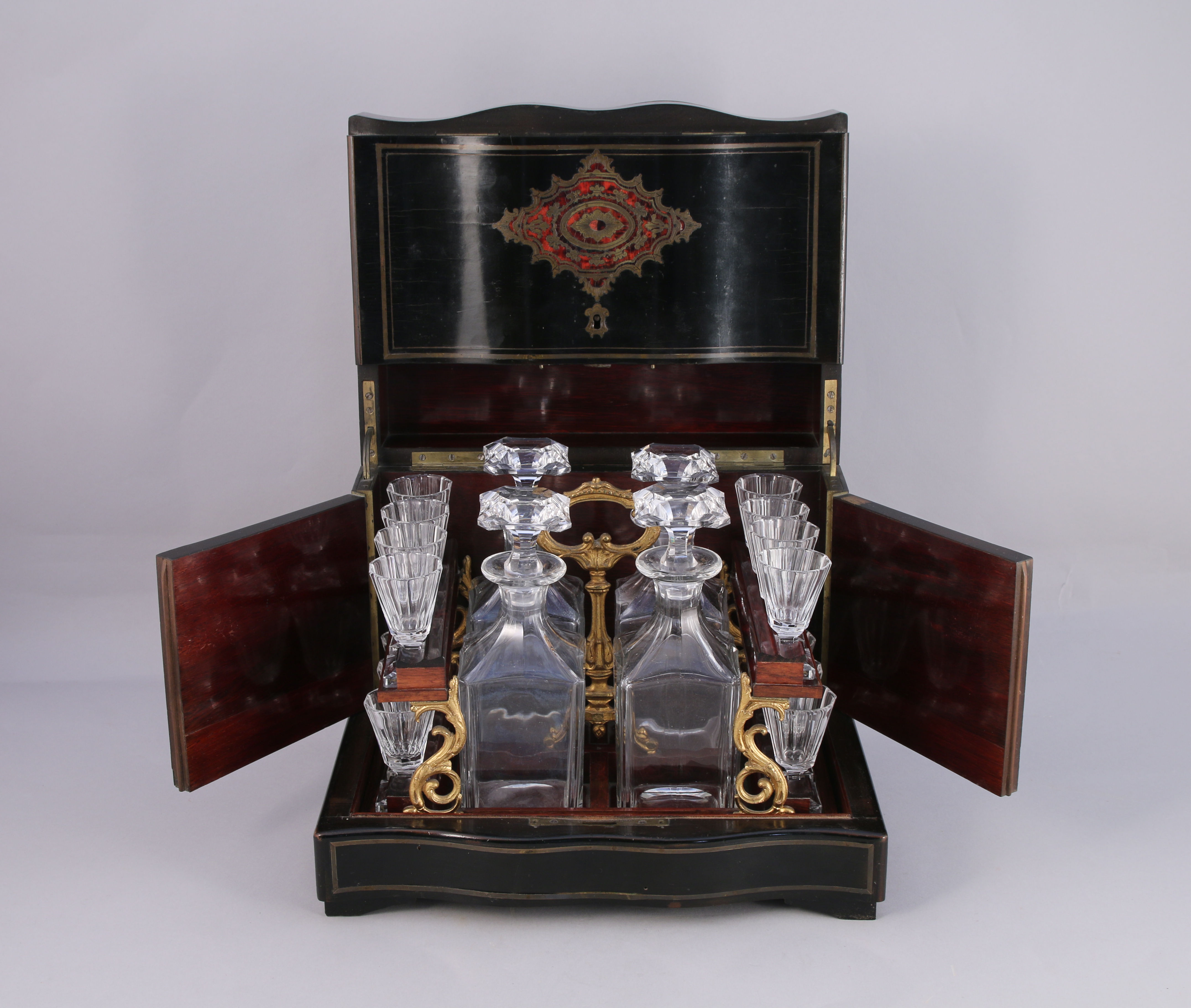 en placage de bois noirci et filets de laiton à décor de marqueterie dite boulle en partie de laiton et écaille d'imitation. L'intérieur plaqué de bois teinté rouge contient 16 verres et quatre carafons en cristal.