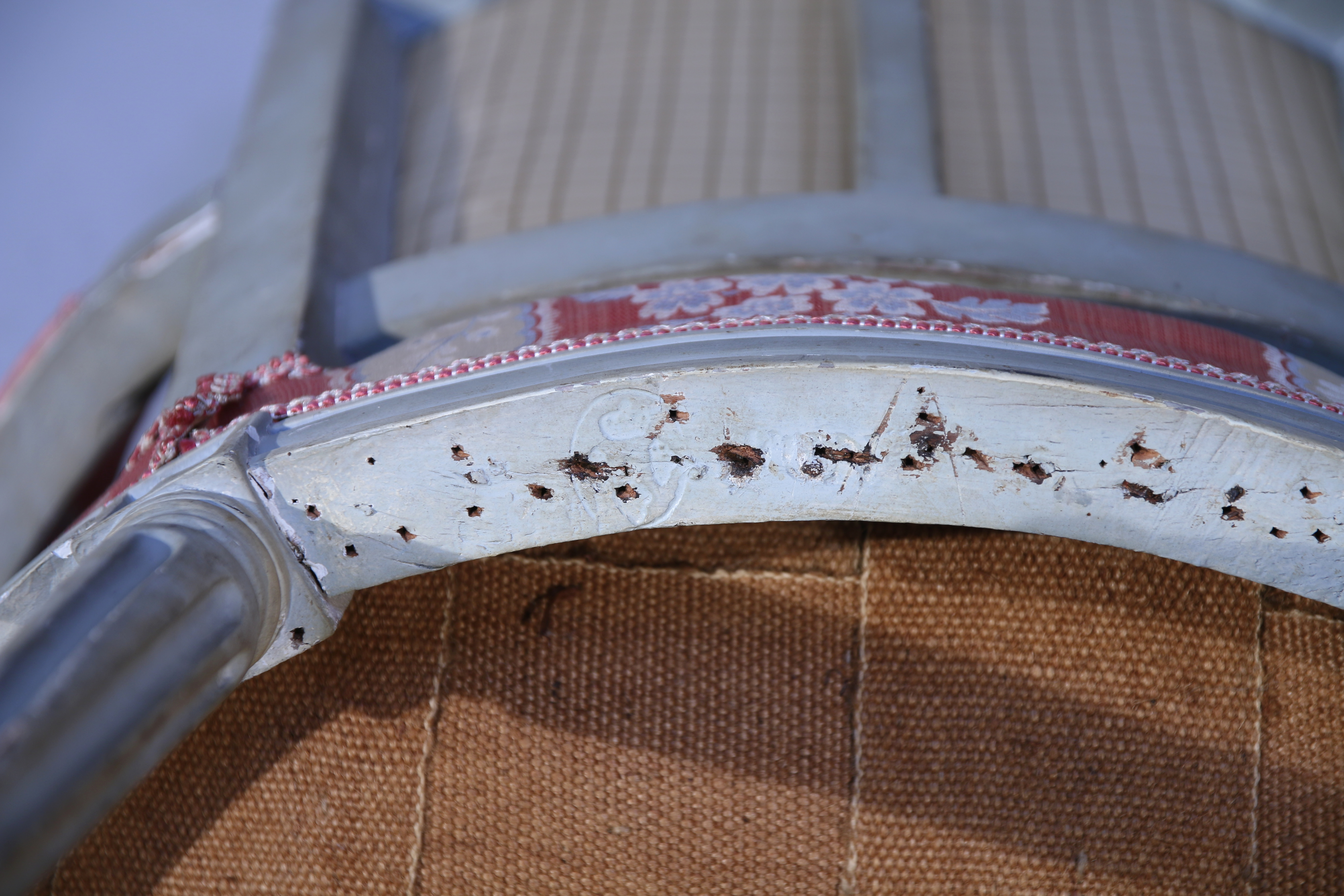 en hêtre mouluré, sculpté et laqué blanc. Le dossier en chapeau de gendarme. Il repose sur quatre pieds fuselés et cannelés. Porte la marque au feu du château de Fontainebleau.