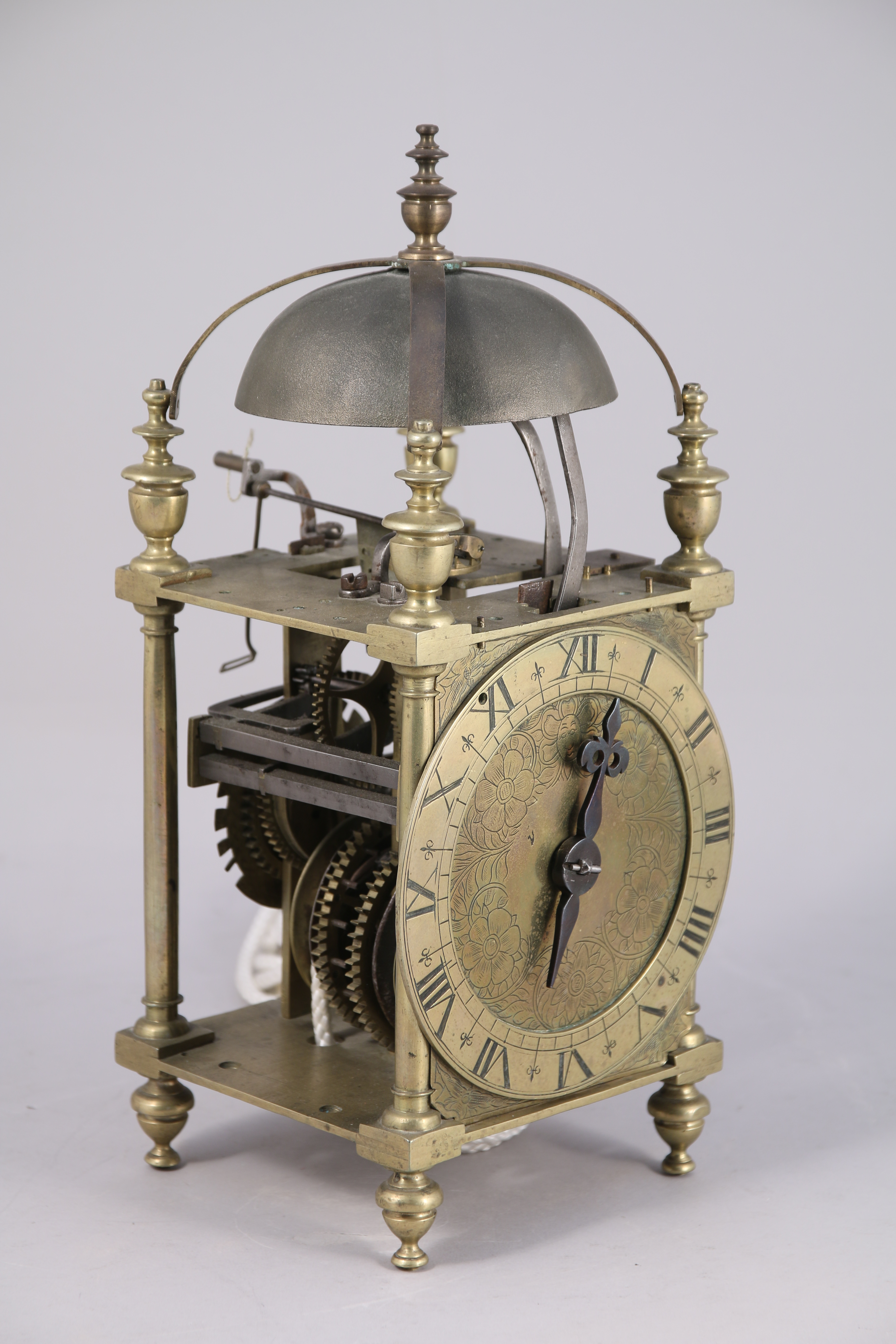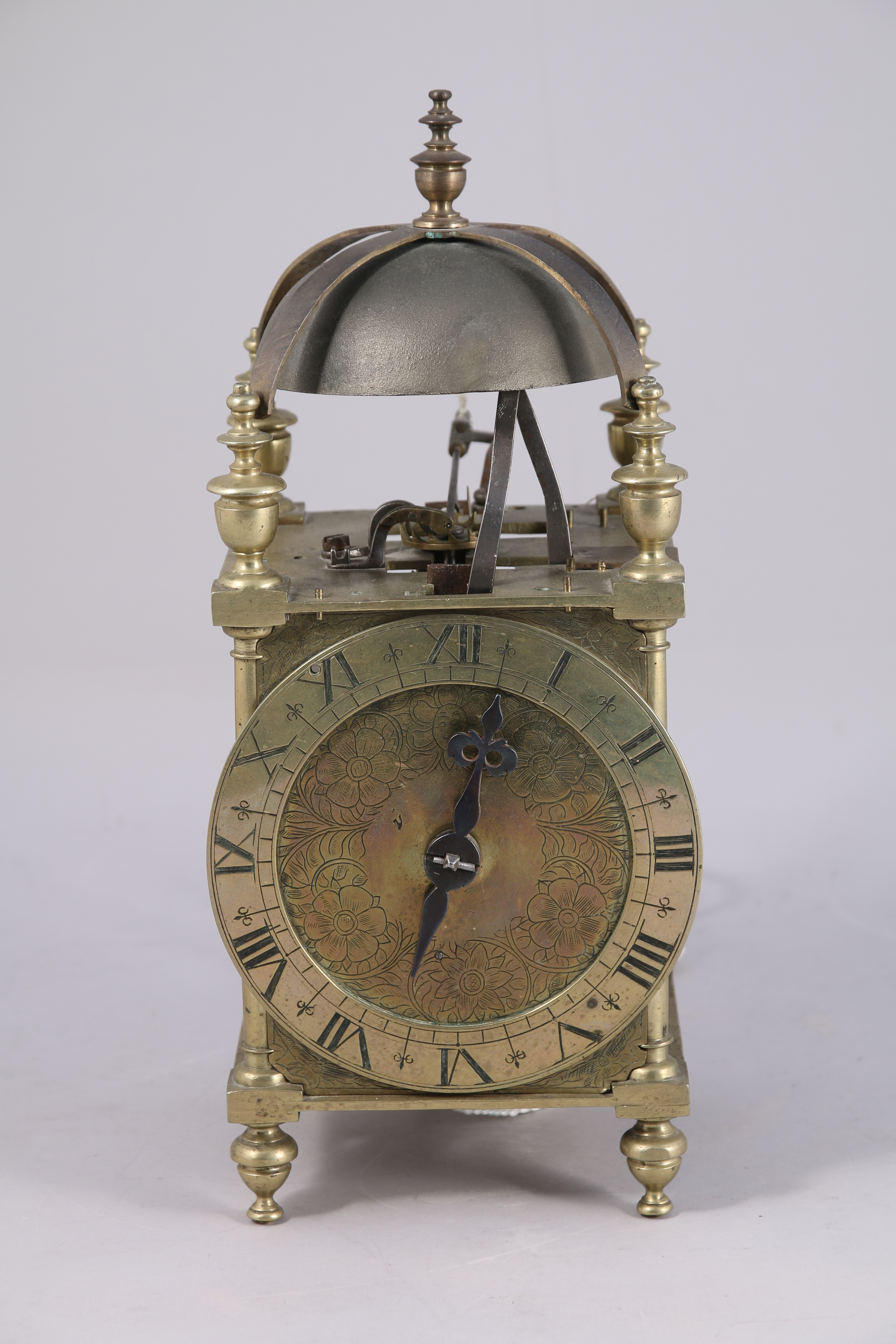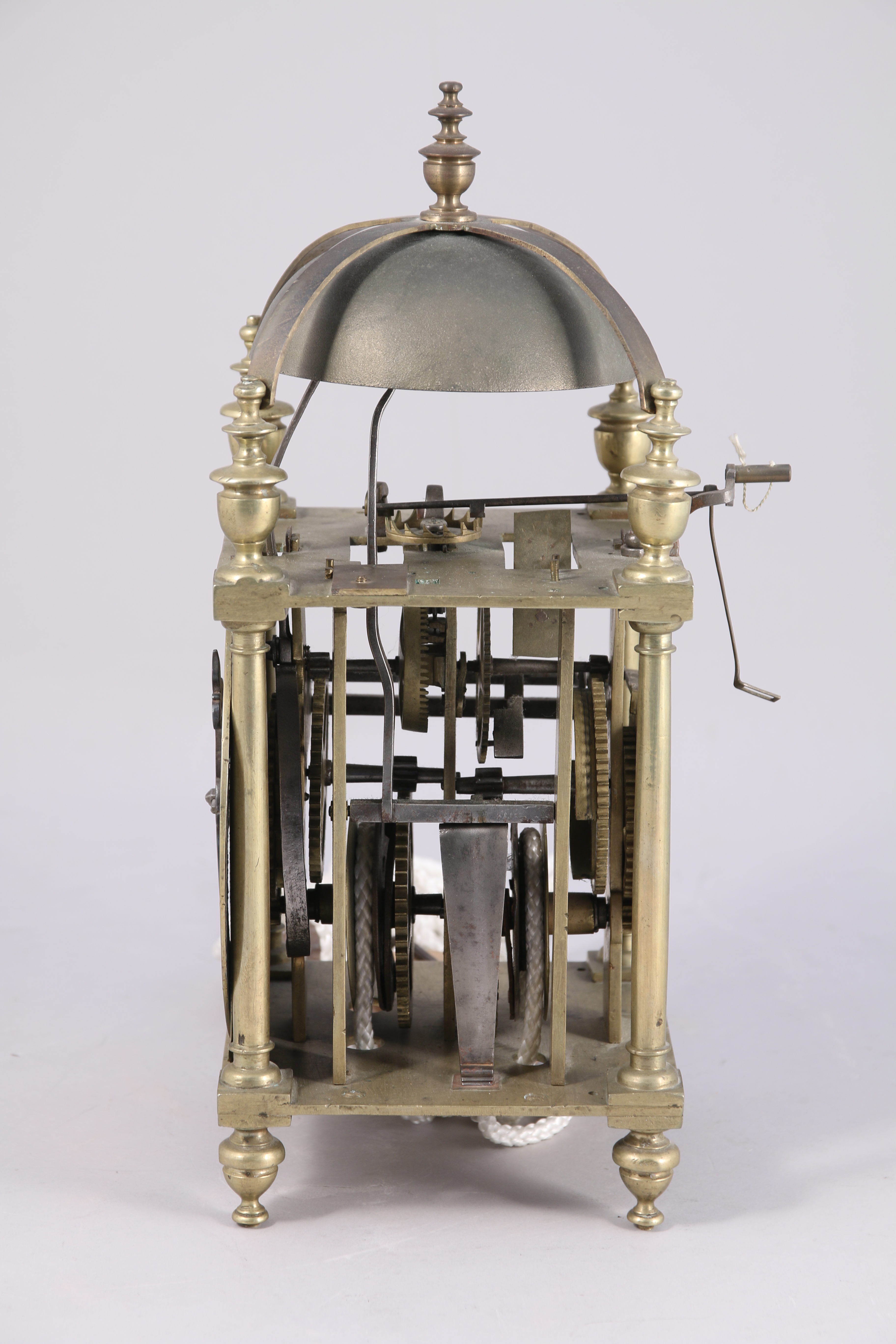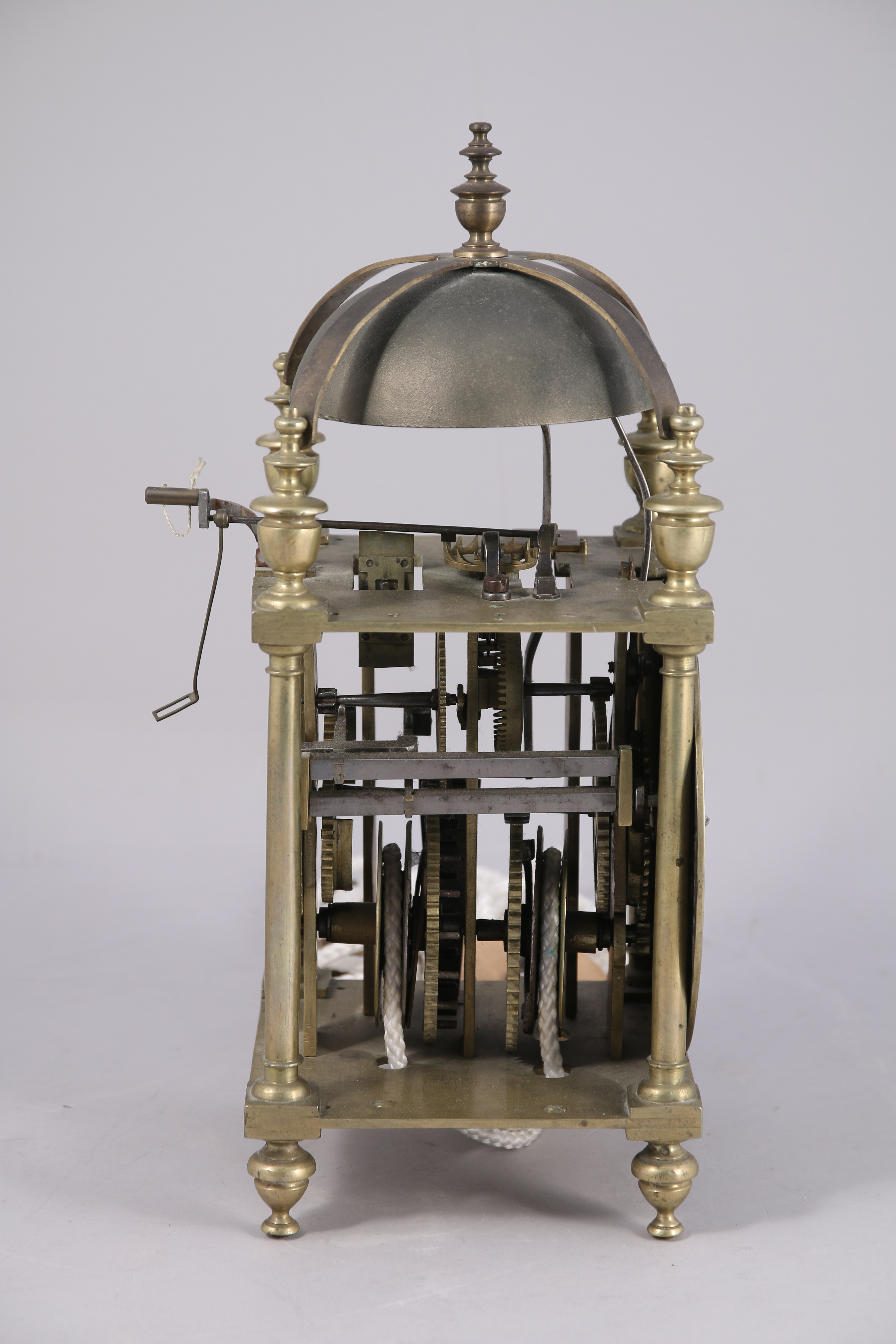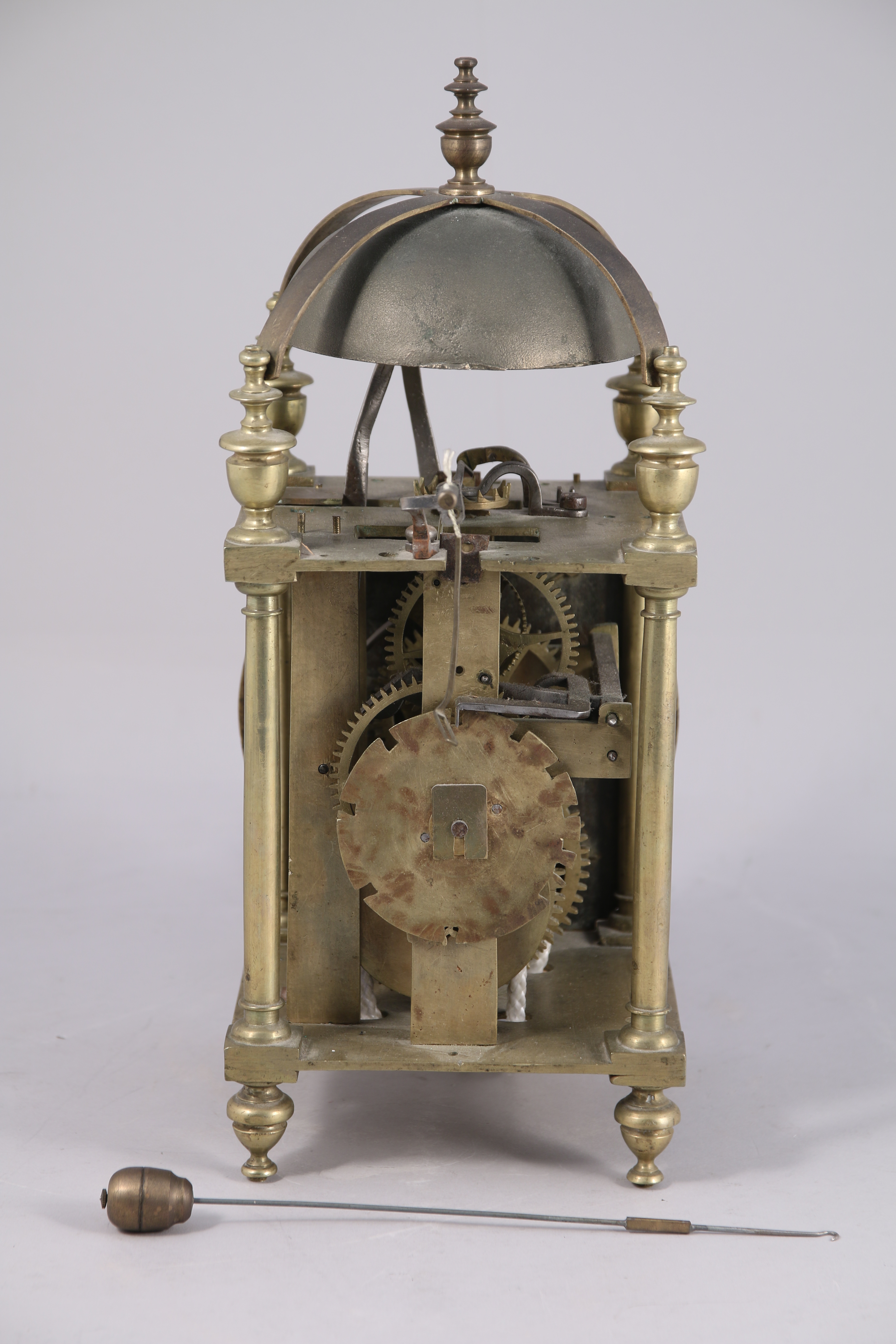 en laiton, dans une cage encadrée par quatre colonnes terminées par des vases balustres supportant le timbre et reposant sur quatre pieds toupies. Le cadran à une aiguille gradué des minutes avec les heures en chiffres romains séparés par des fleurs de lys.