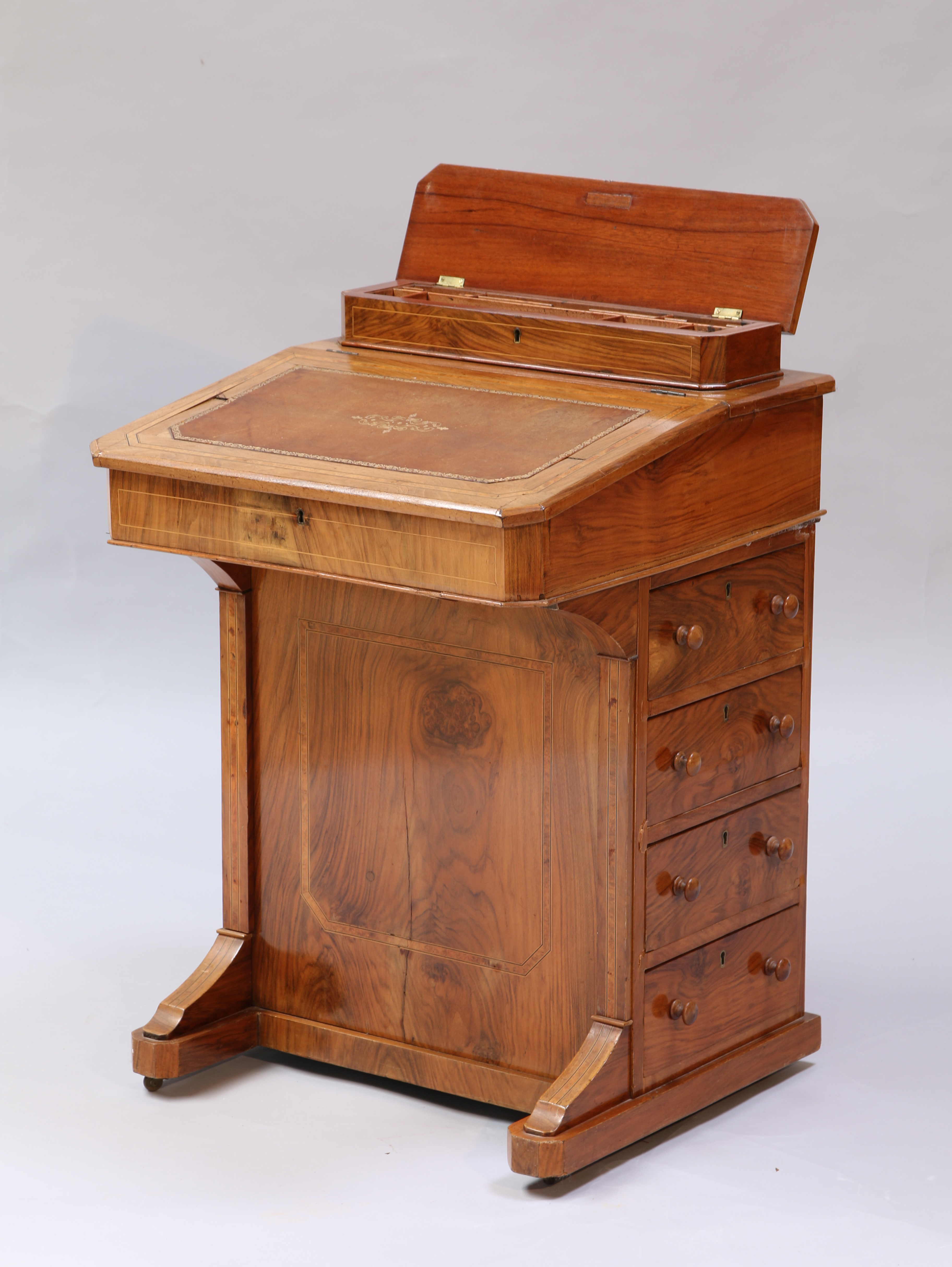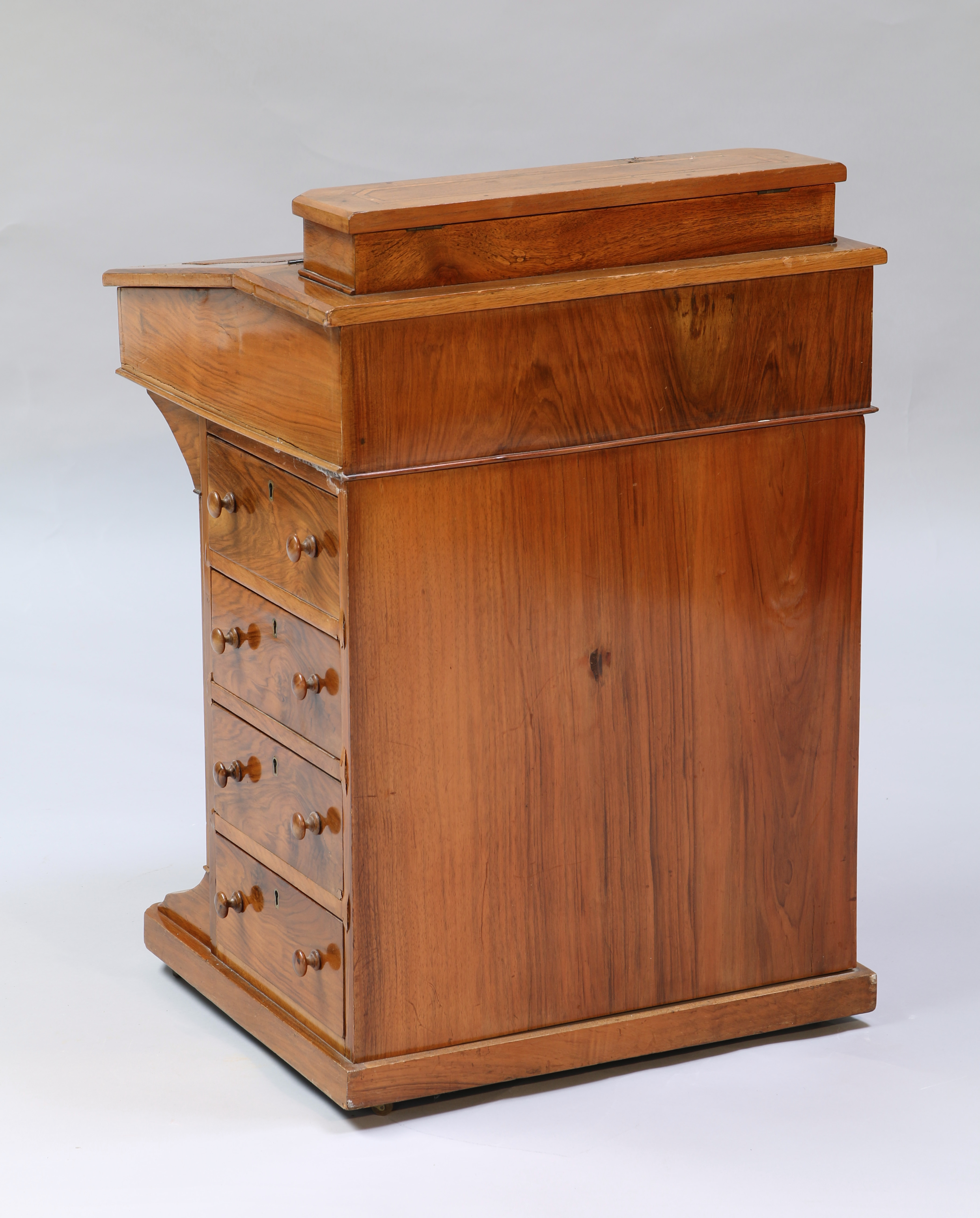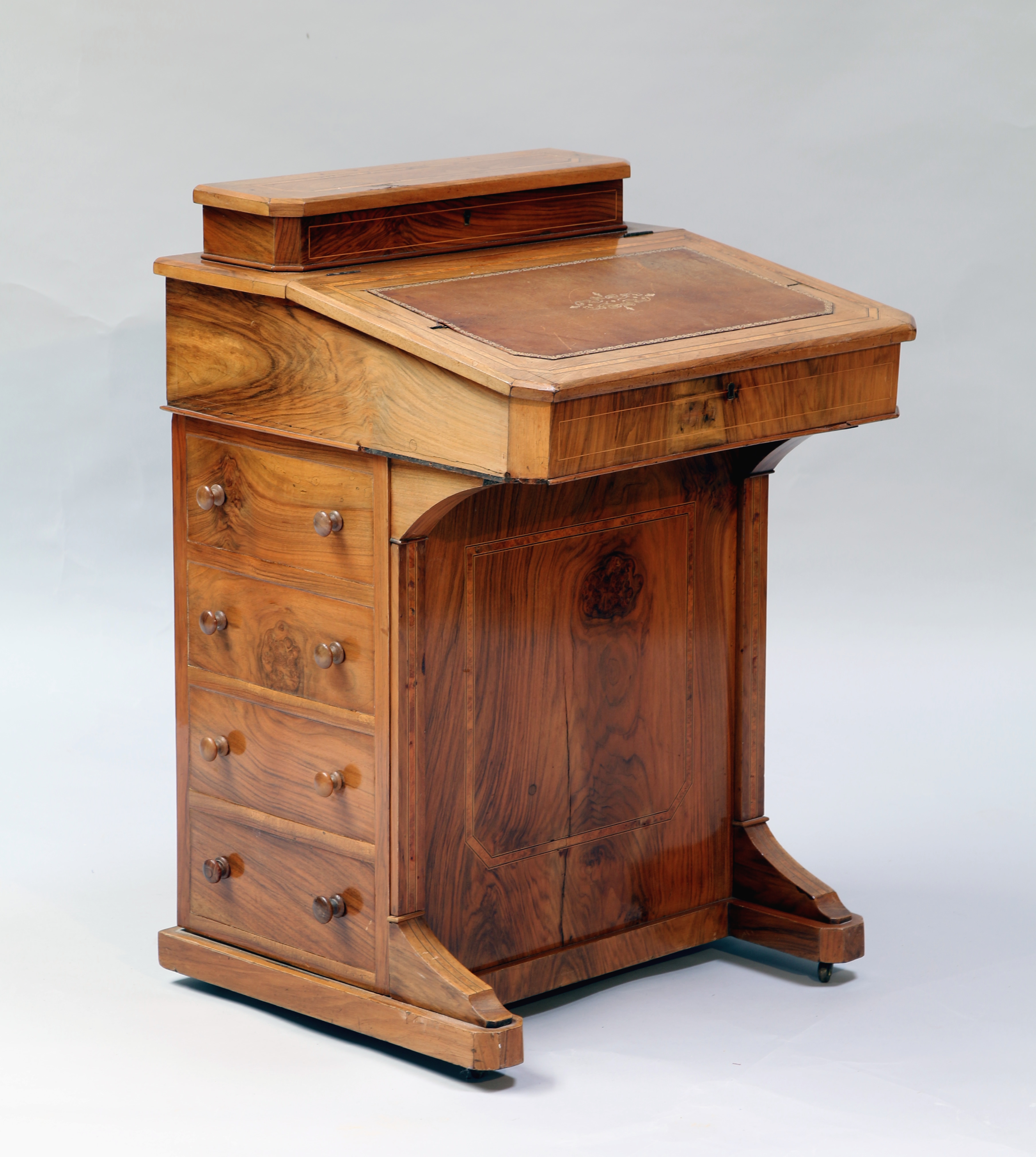d'encadrements de loupe et filets de bois clair et sombre. Il est surmonté d'un gradin et ouvre par un abattant foncé d'un cuir fauve et par quatre tiroirs sur le côté droit. Il repose sur quatre roulettes.