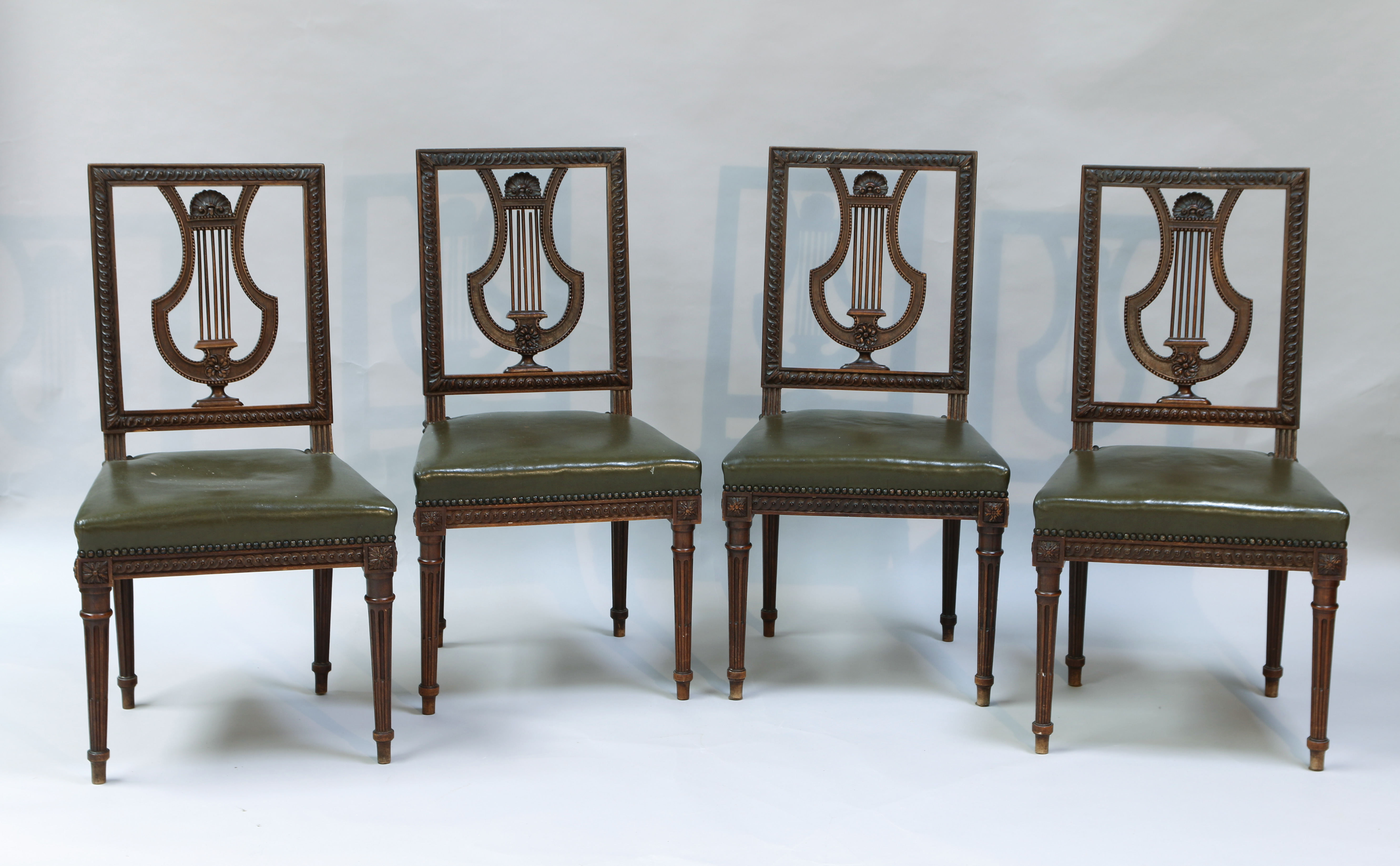 Le dossier ajouré d'une lyre enrichie de rais de perle, fleuron et coquille. Le dossier et la ceinture ornés de frises d'entrelacs. Dés de raccordement à fleurons. Elles reposent sur quatre pieds fuselés, cannelés et rudentés.