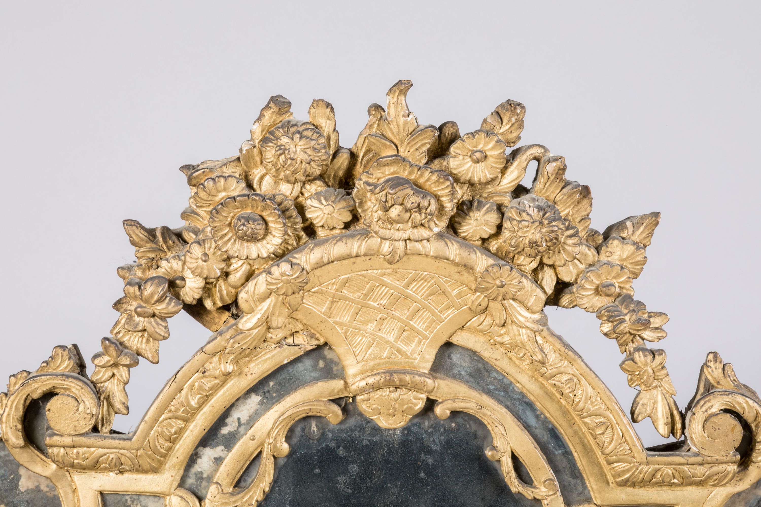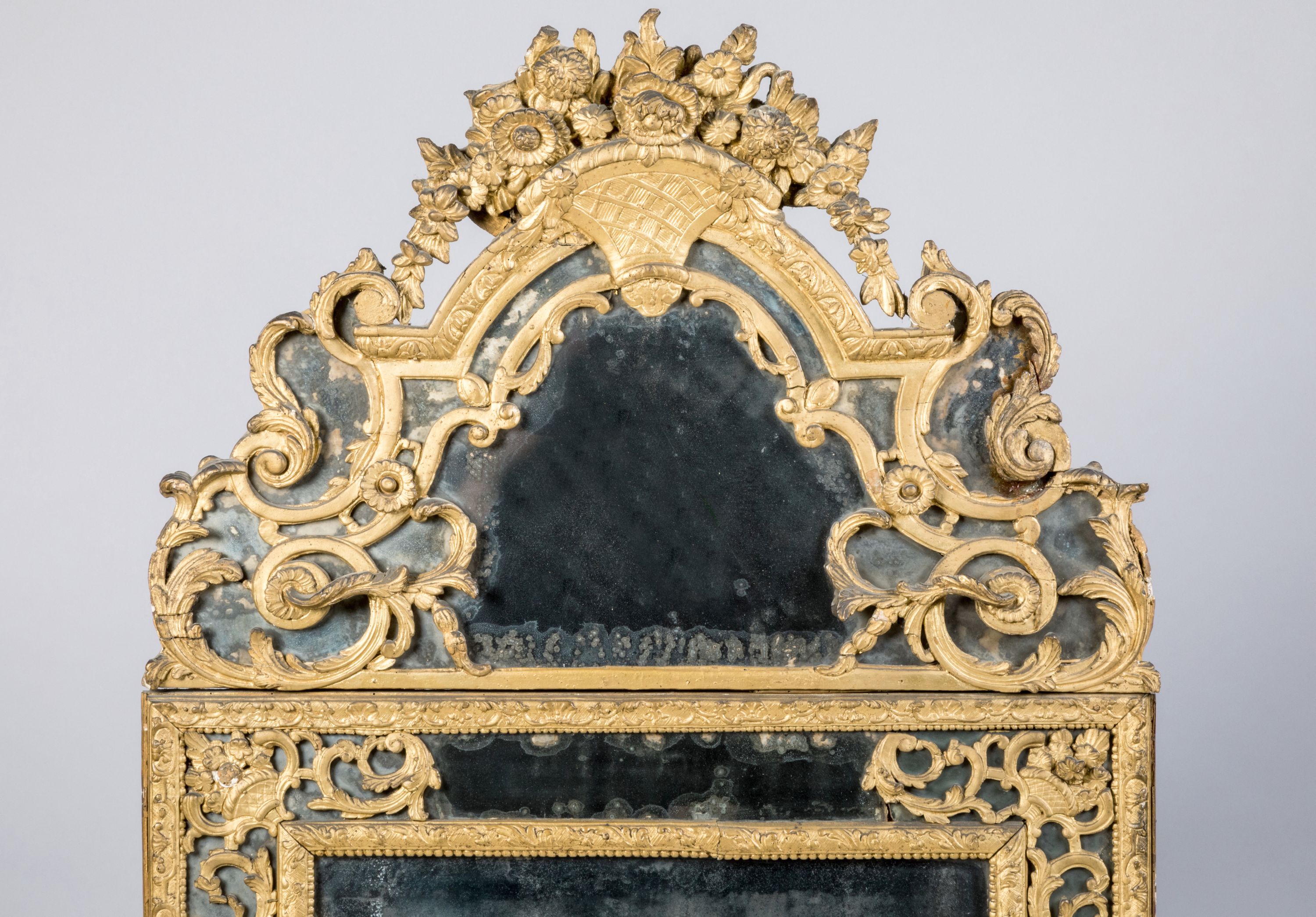 en bois sculpté, stuqué et repeint or. Il reçoit un riche décor de paniers fleuris, enroulement et acanthes.