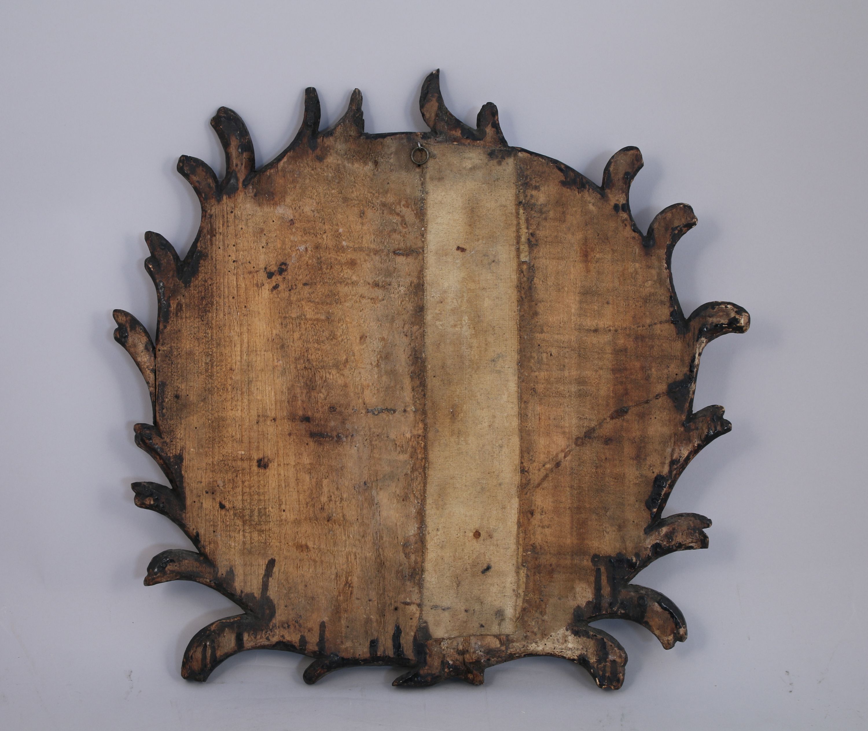 en bois sculpté et teinté figurant un personnage de profil: pour l'un un saint et pour l'autre une sainte. Ils s'inscrivent dans une couronne de palmes.