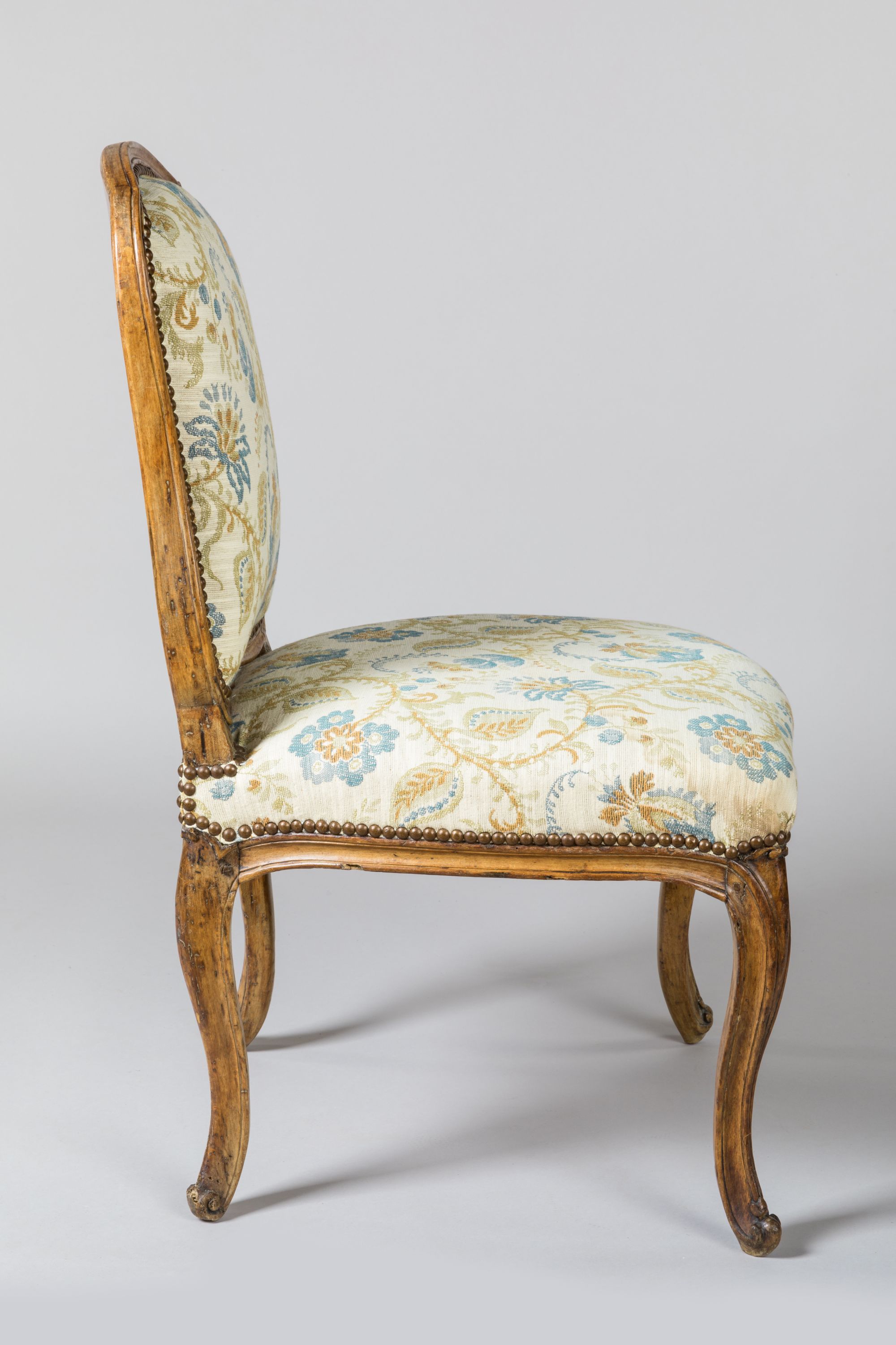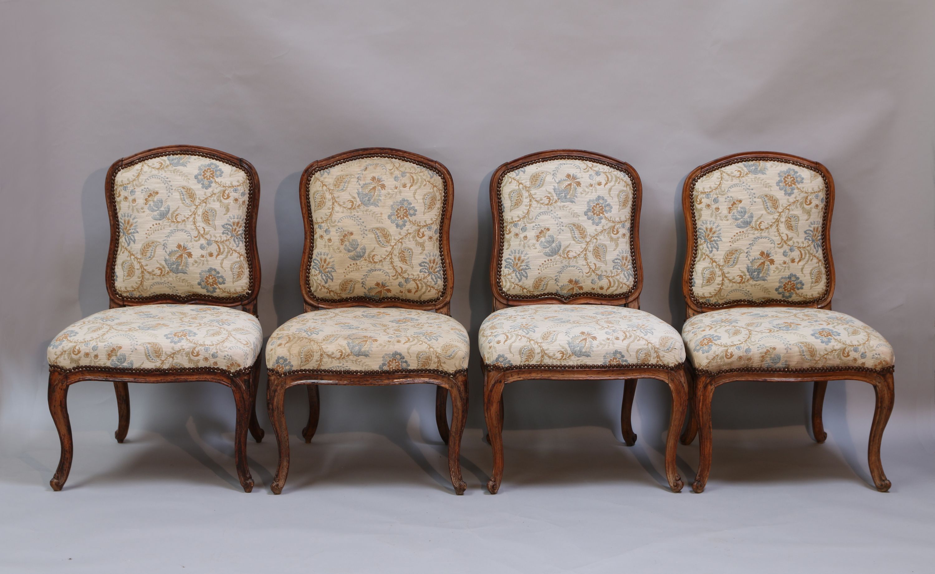 SUITE de QUATRE CHAISES à dossier à la reine, en hêtre mouluré et sculpté. Garniture à motifs de fleurs indiennes. Elles reposent sur quatre pieds cambrés à enroulement.
