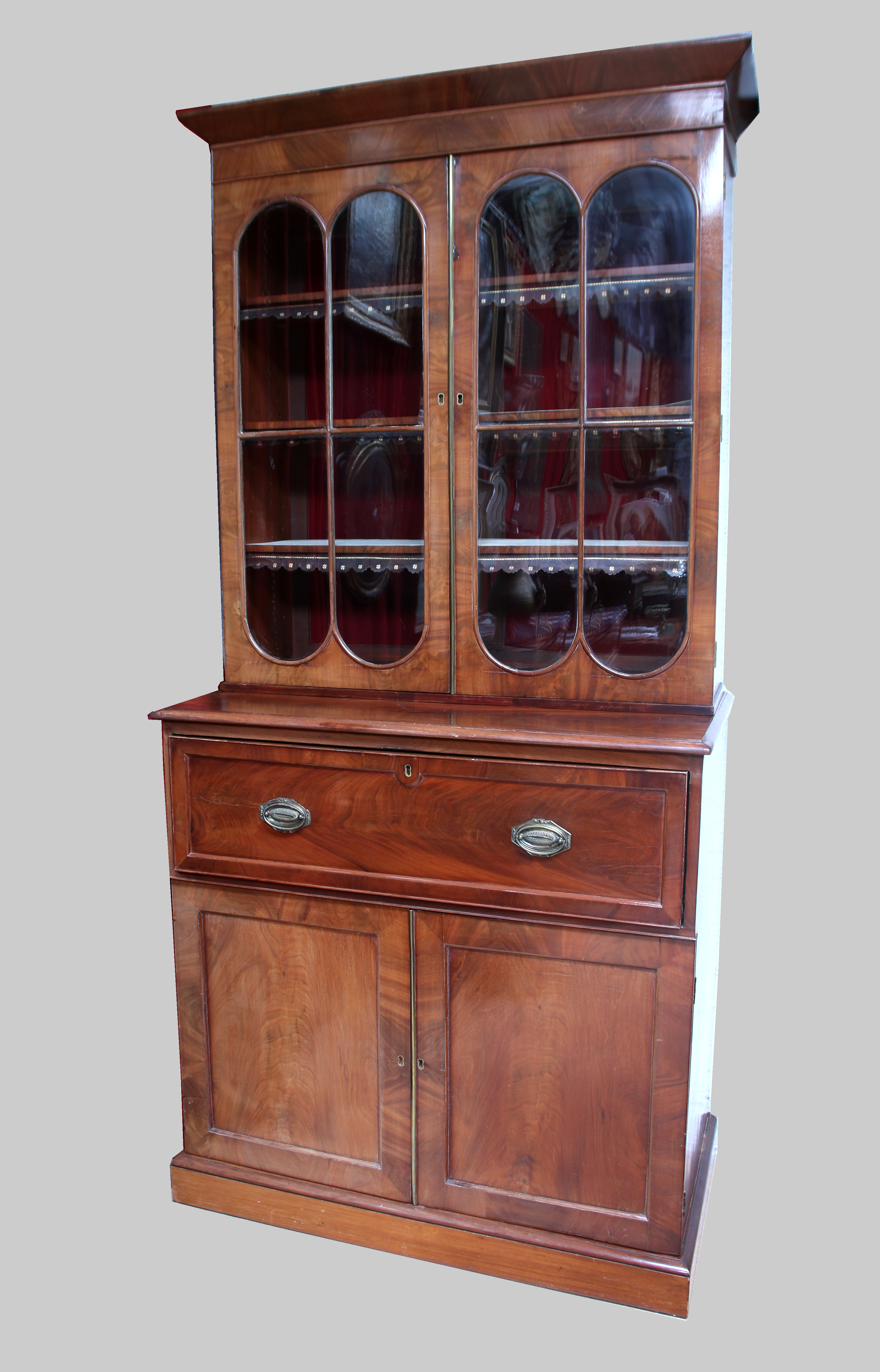 à abattant de forme rectangulaire. Il ouvre à deux portes dans le corps supérieur et deux portes dans la partie basse, est muni d'un abattant en ceinture découvrant un pupitre gainé de cuir, un tiroir central et huit tiroirs latéraux. Le corps supérieur présente des vitres en arc bilobé séparées par un croisillon, découvrant trois étagères décorées d'un cuir chantourné de lobes et gaufré à décor de fleurettes. Garnitures et baguettes de fermeture en laiton doré gravé sur les anneaux de tirage "WJ".