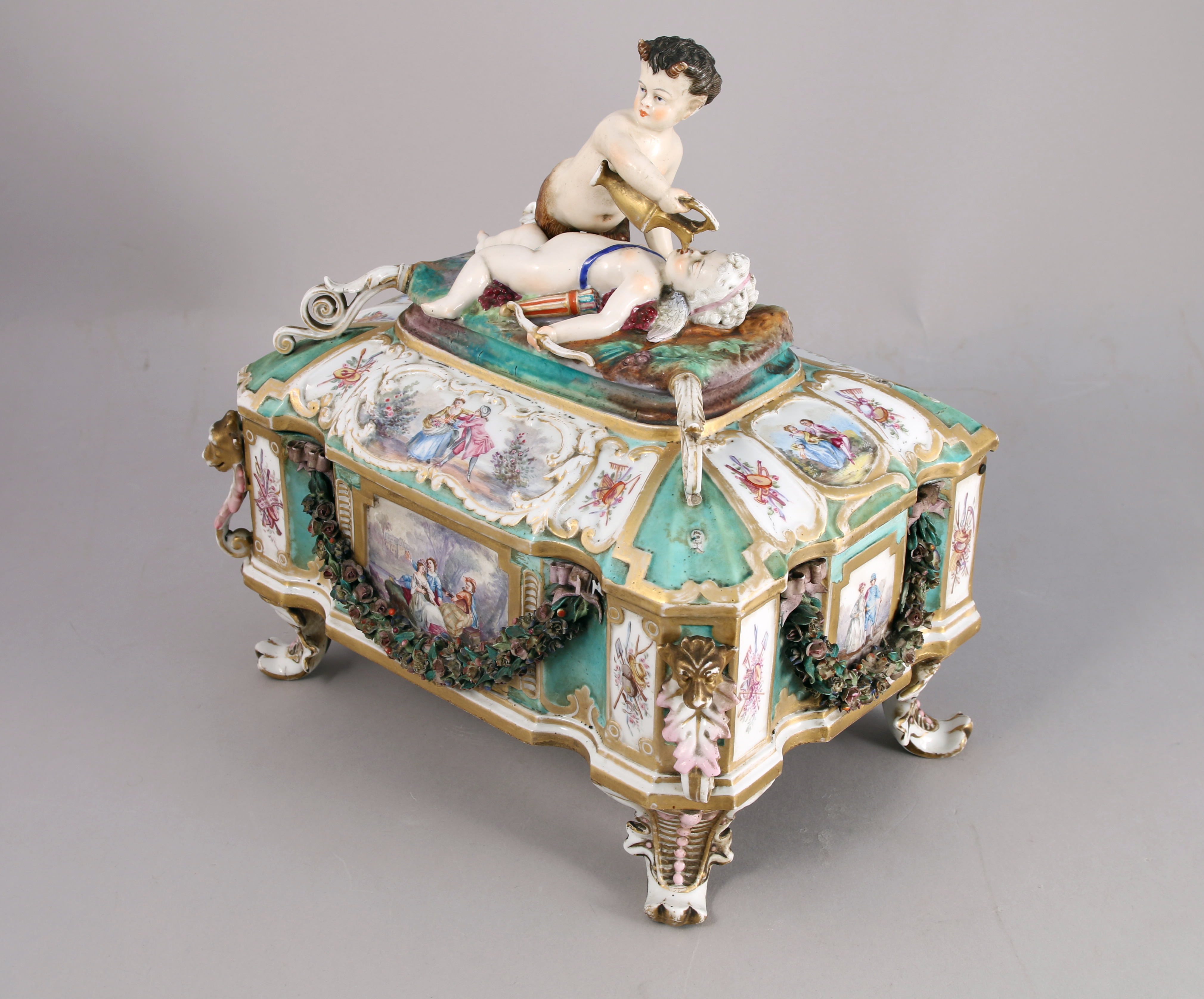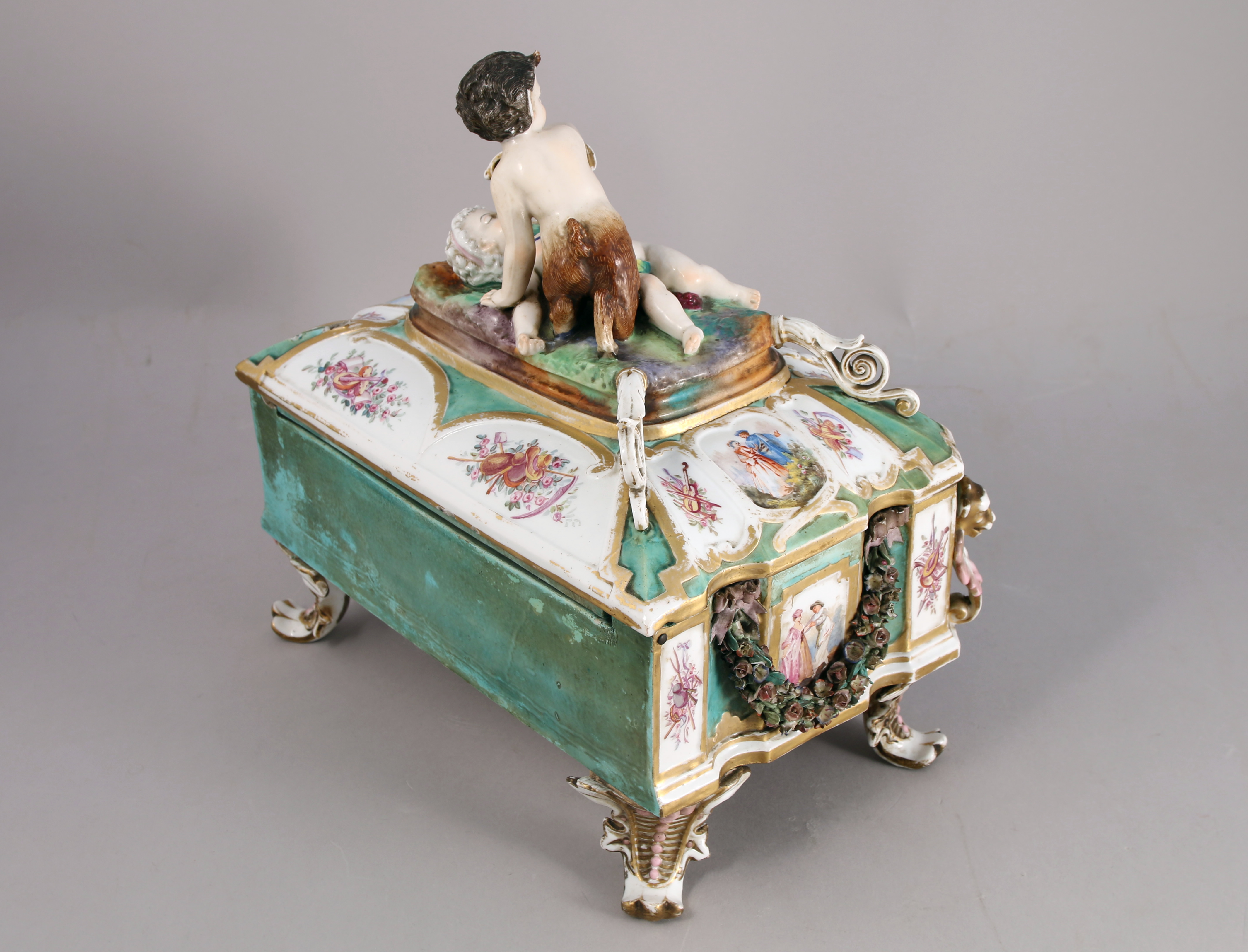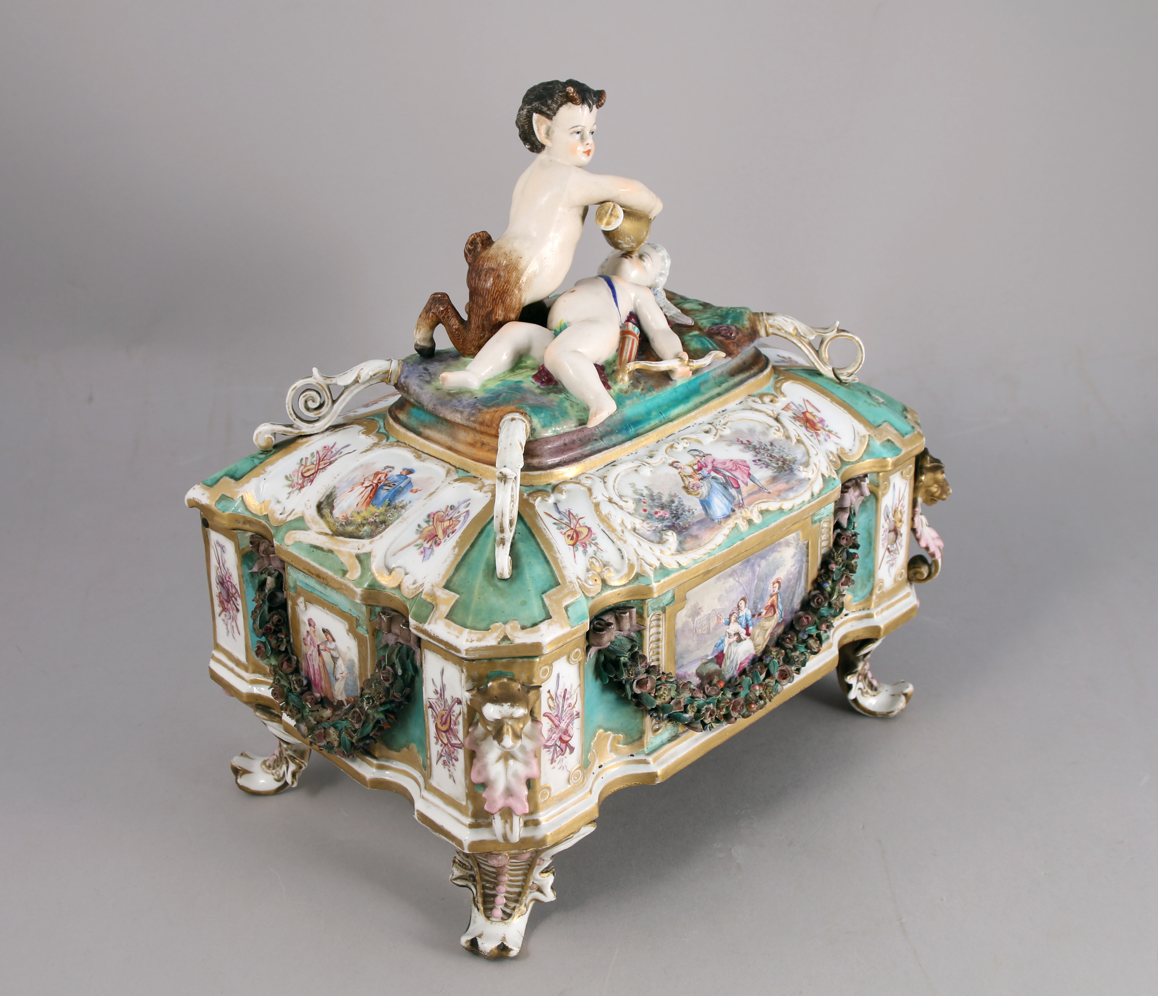 en porcelaine polychrome et doré. De forme rectangulaire à pans coupés le coffret repose sur quatre pieds mouvementés ; il est décoré de scènes amoureuses peintes dans des cartouches entourés de guirlandes fleuries en appliques. Le couvercle, articulé par une charnière, est surmonté d'un groupe en biscuit figurant un petit satyre dionysiaque enivrant t un amour ailé assoupi. Marques aux sabres surmontant une étoile.