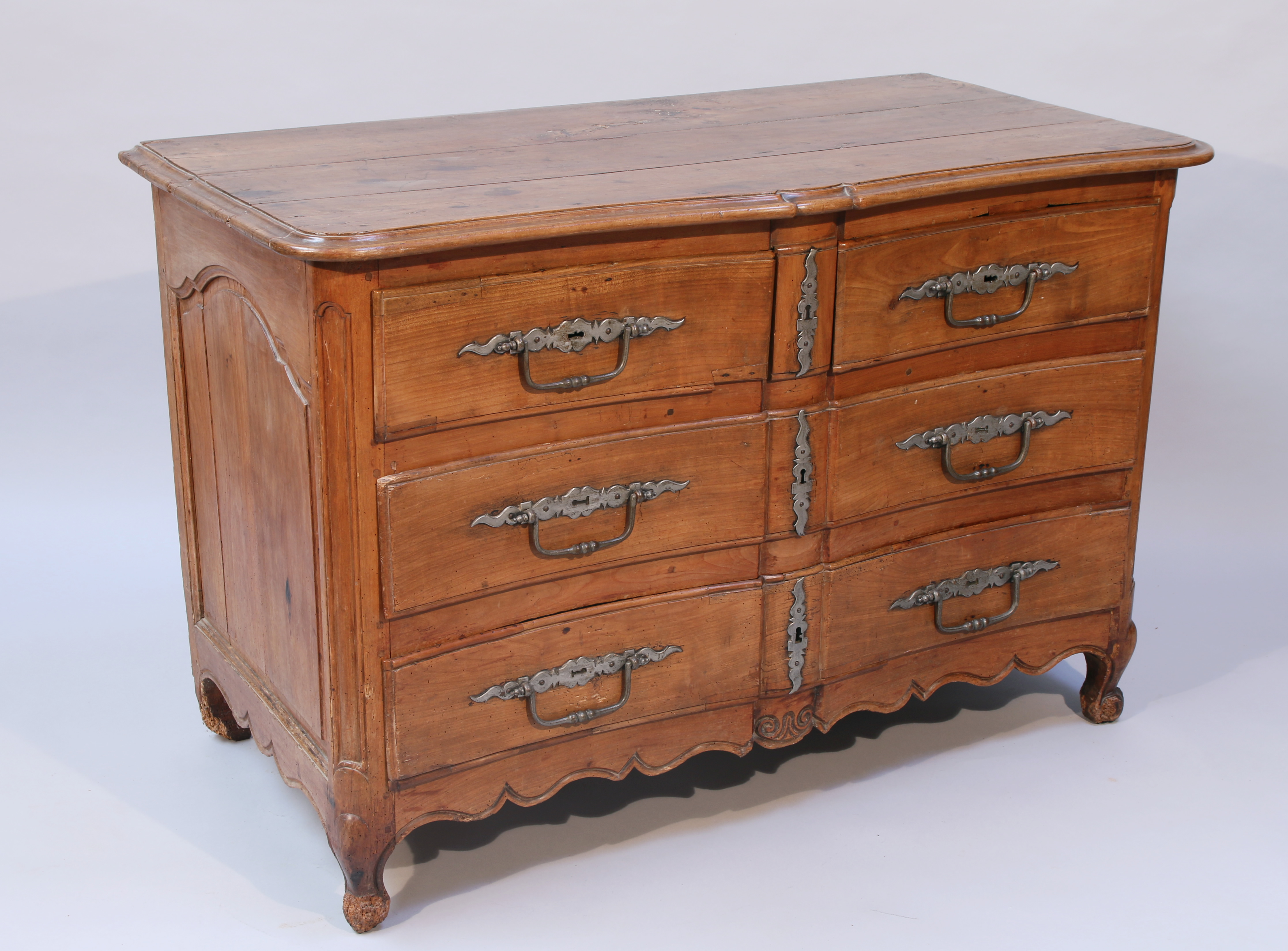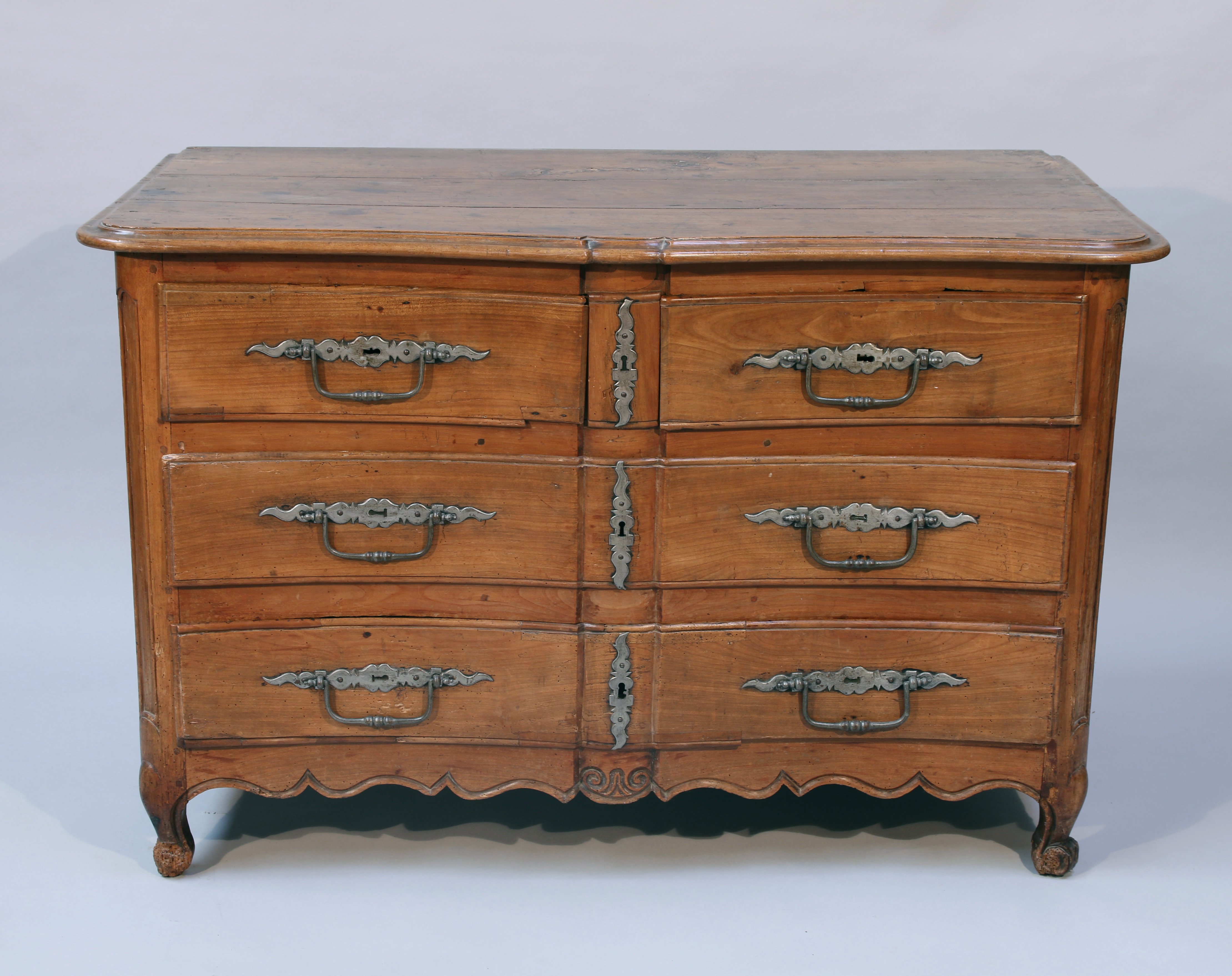 mouluré et sculpté ouvrant en façade par quatre tiroirs sur trois rangs. Garnitures en fer telles que poignées mobiles et entrées de serrure. Traverses basses chantournées. Elle repose sur quatre pieds, les antérieurs à enroulements. Plateau de bois.