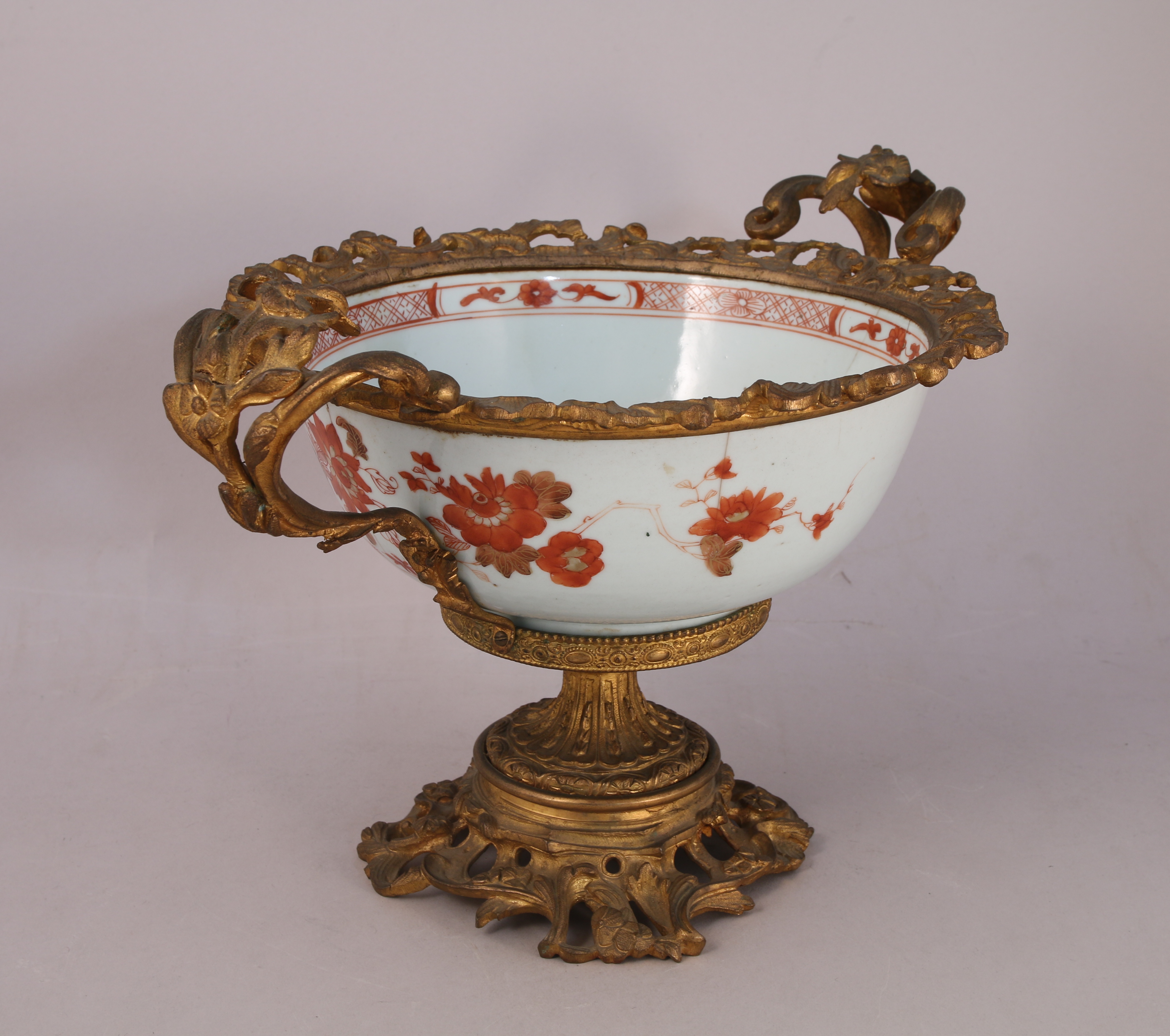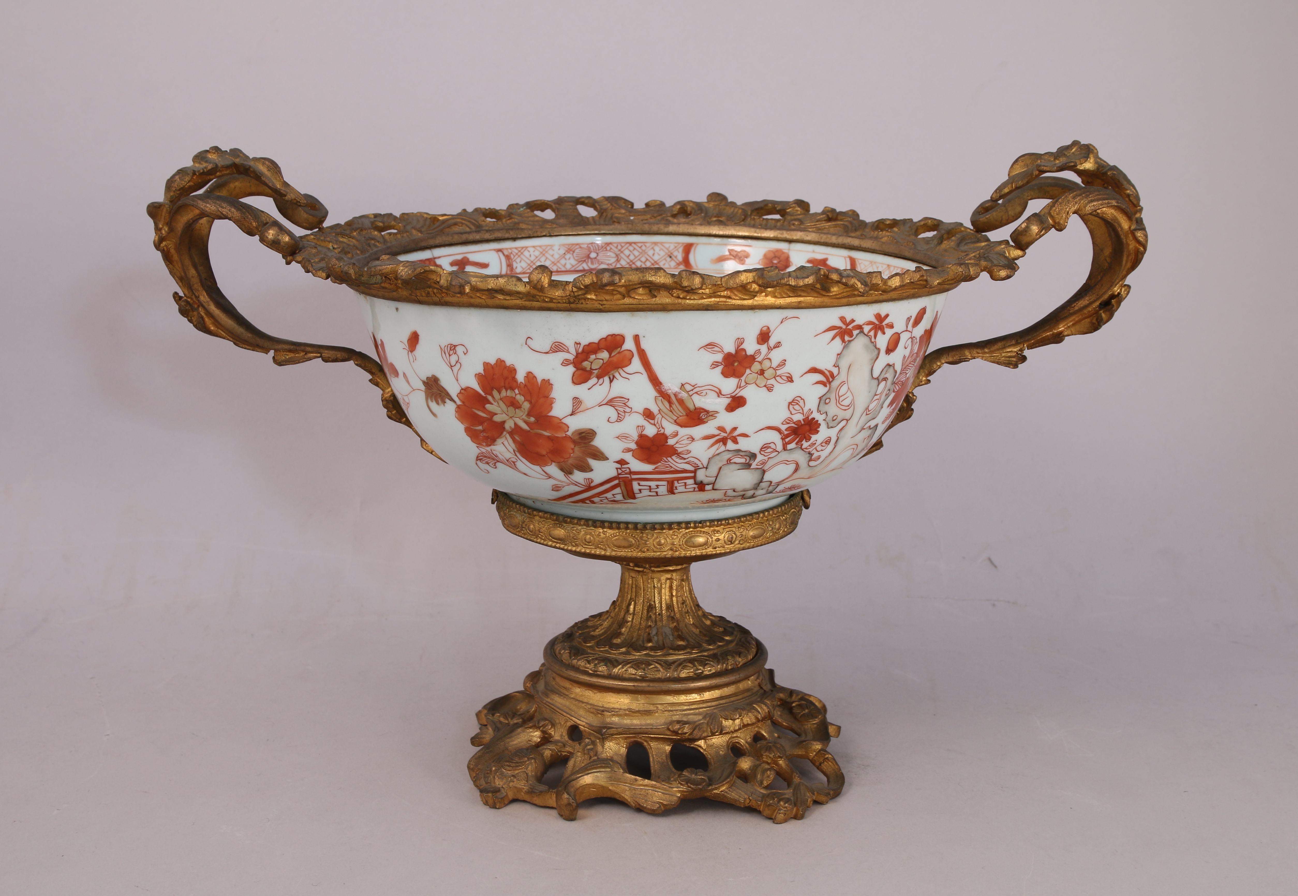 décorée en camaïeu orange et or d'un paysage à la barrière et au rocher percé. Monture en bronze ciselé et doré à décor rocaille feuillagé ajouré. Anses latérales fleuries, piédouche.