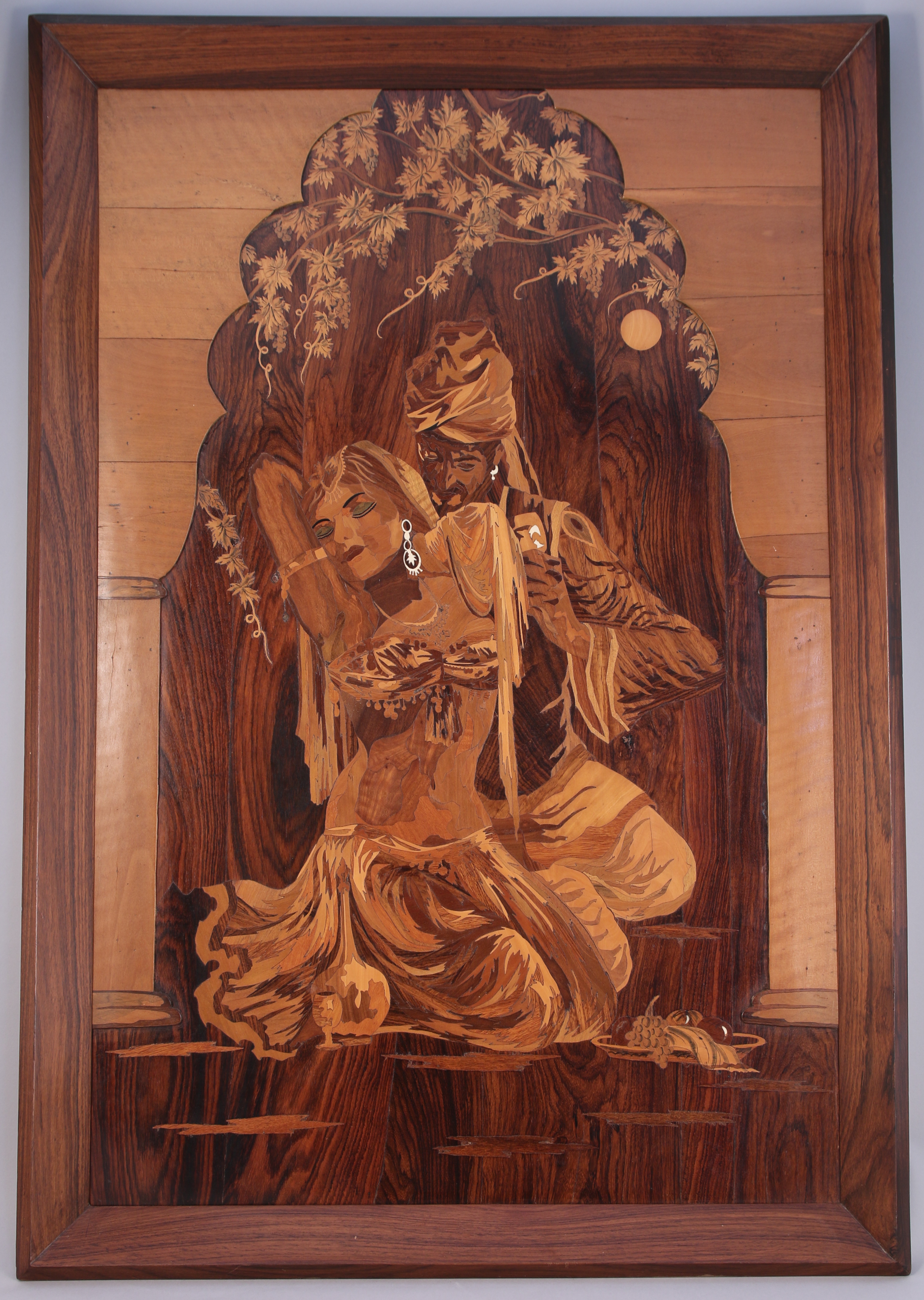 Panneau en marqueterie de bois exotique et incrustation d'os dans son encadrement.