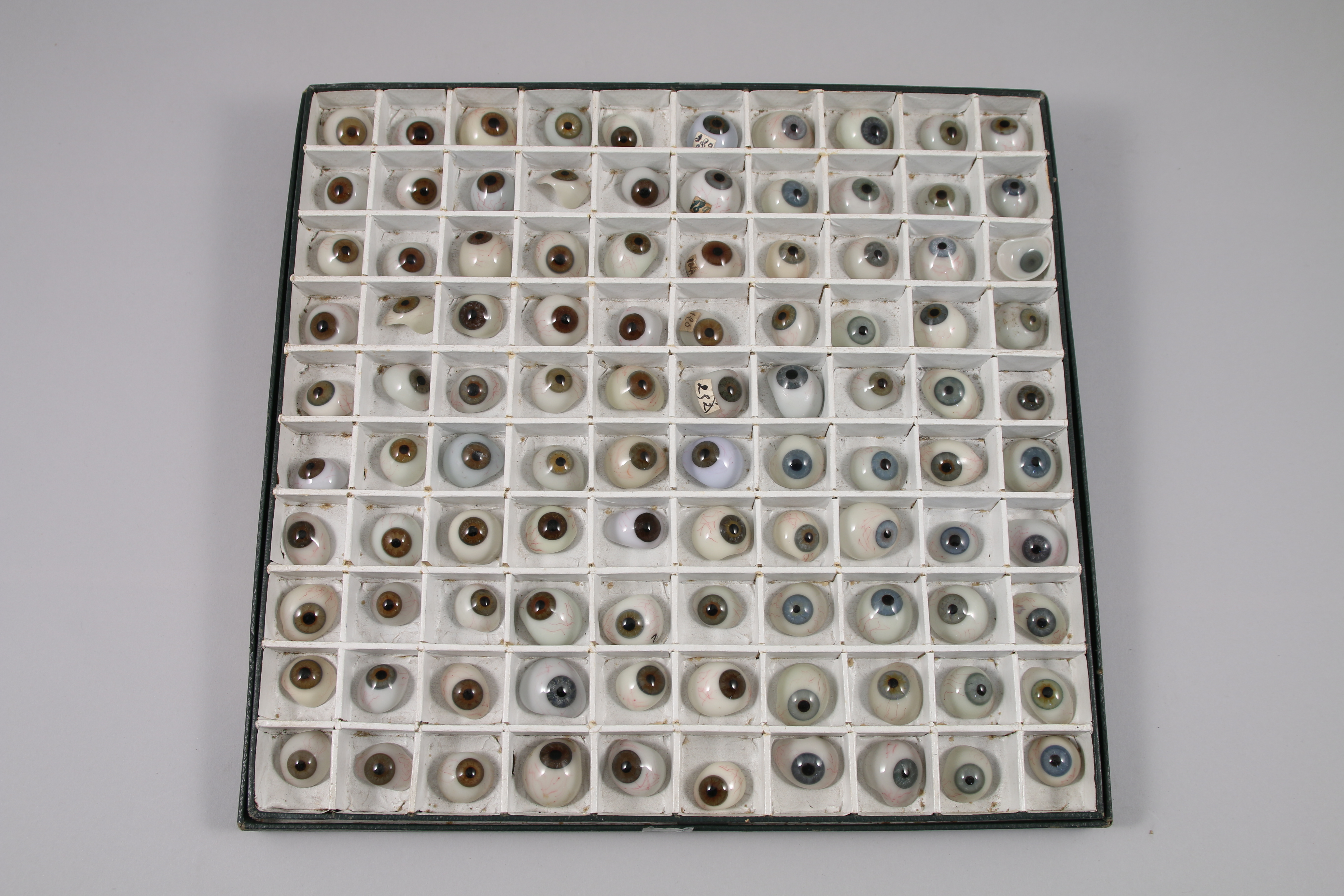 Environ une centaine de GLOBES OCULAIRES, simple ou double coque, dans un ou plusieurs coffrets gainés de chagrin. Les globes en verre teinté de différentes tailles, nuances de couleurs aux petits vaisseaux sanguins peints sur la conjonctive reproduisent l'iris grâce à des pigments de toutes teintes. Les formes des prothèses en demi-coquille sont irrégulières. Les tailles et couleurs diverses ont vocation à s'adapter aux patients ayant subi une énucléation au sortir de la première guerre mondiale.