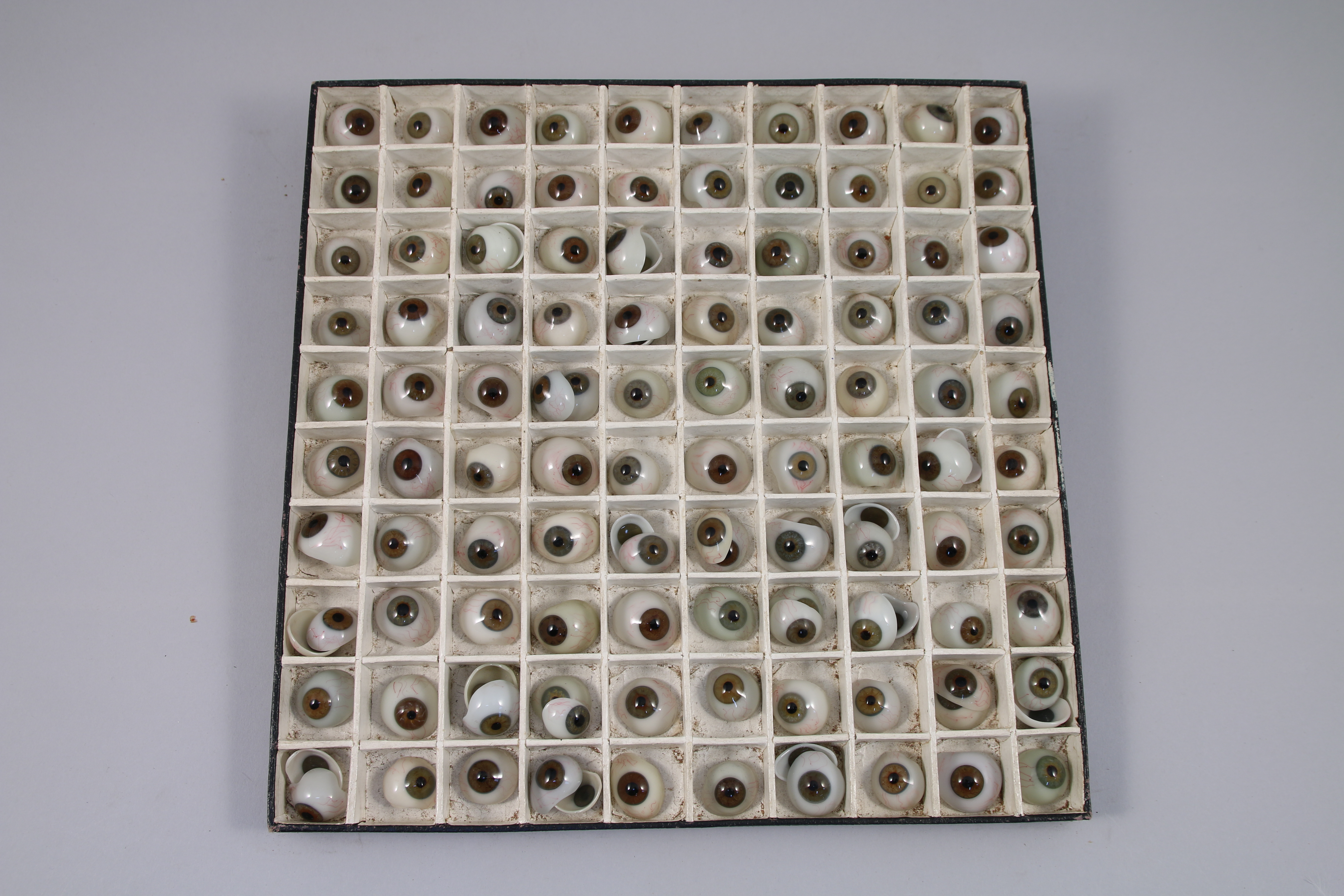 Environ une centaine de GLOBES OCULAIRES, simple ou double coque, dans un ou plusieurs coffrets gainés de chagrin. Les globes en verre teinté de différentes tailles, nuances de couleurs aux petits vaisseaux sanguins peints sur la conjonctive reproduisent l'iris grâce à des pigments de toutes teintes. Les formes des prothèses en demi-coquille sont irrégulières. Les tailles et couleurs diverses ont vocation à s'adapter aux patients ayant subi une énucléation.