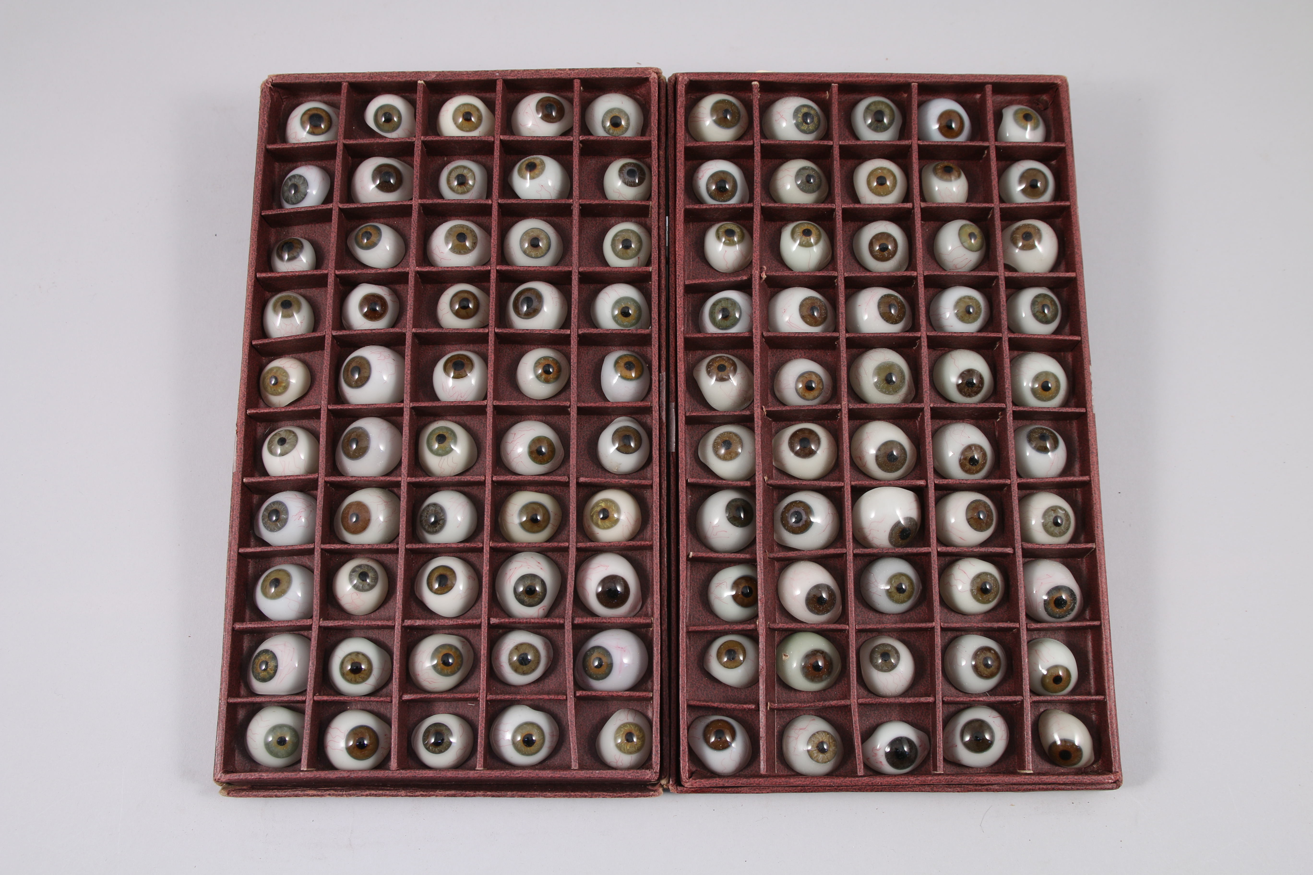 Environ une centaine de GLOBES OCULAIRES, simple ou double coque, dans un ou plusieurs coffrets gainés de chagrin. Les globes en verre teinté de différentes tailles, nuances de couleurs aux petits vaisseaux sanguins peints sur la conjonctive reproduisent l'iris grâce à des pigments de toutes teintes. Les formes des prothèses en demi-coquille sont irrégulières. Les tailles et couleurs diverses ont vocation à s'adapter aux patients ayant subi une énucléation au sortir de la première guerre mondiale.