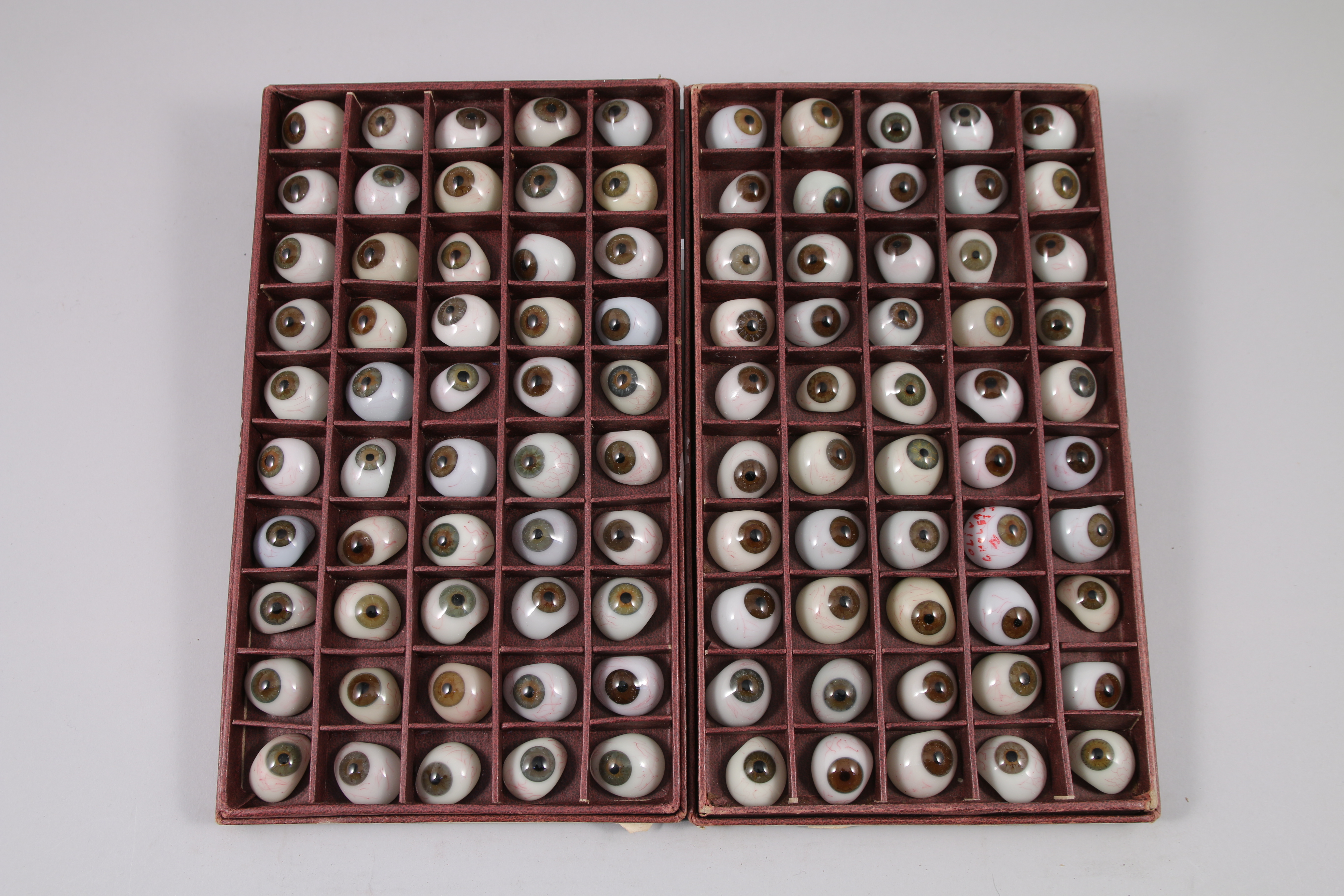Environ une centaine de GLOBES OCULAIRES, simple ou double coque, dans un ou plusieurs coffrets gainés de chagrin. Les globes en verre teinté de différentes tailles, nuances de couleurs aux petits vaisseaux sanguins peints sur la conjonctive reproduisent l'iris grâce à des pigments de toutes teintes. Les formes des prothèses en demi-coquille sont irrégulières. Les tailles et couleurs diverses ont vocation à s'adapter aux patients ayant subi une énucléation au sortir de la première guerre mondiale.