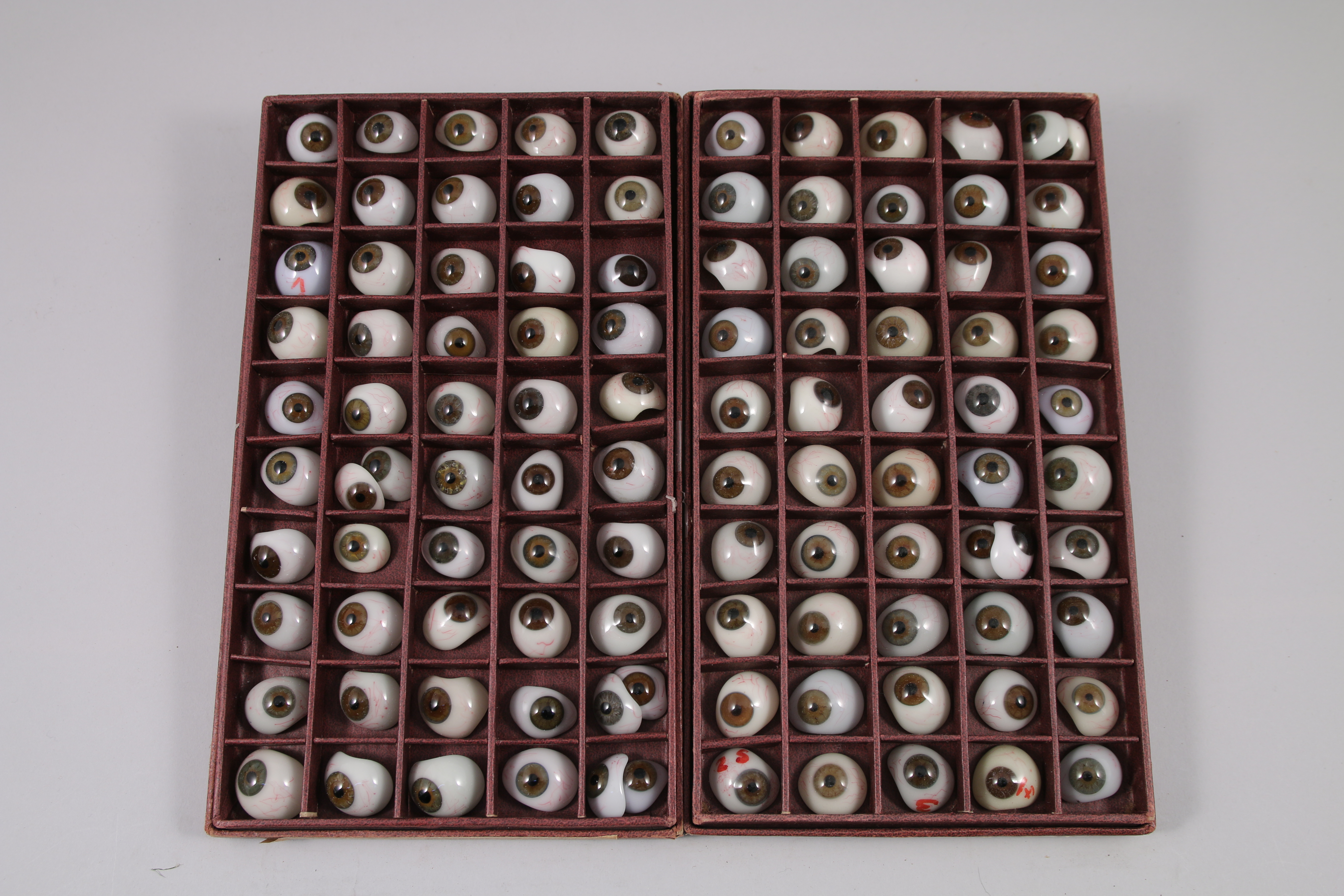 Environ une centaine de GLOBES OCULAIRES, simple ou double coque, dans un ou plusieurs coffrets gainés de chagrin. Les globes en verre teinté de différentes tailles, nuances de couleurs aux petits vaisseaux sanguins peints sur la conjonctive reproduisent l'iris grâce à des pigments de toutes teintes. Les formes des prothèses en demi-coquille sont irrégulières. Les tailles et couleurs diverses ont vocation à s'adapter aux patients ayant subi une énucléation au sortir de la première guerre mondiale.