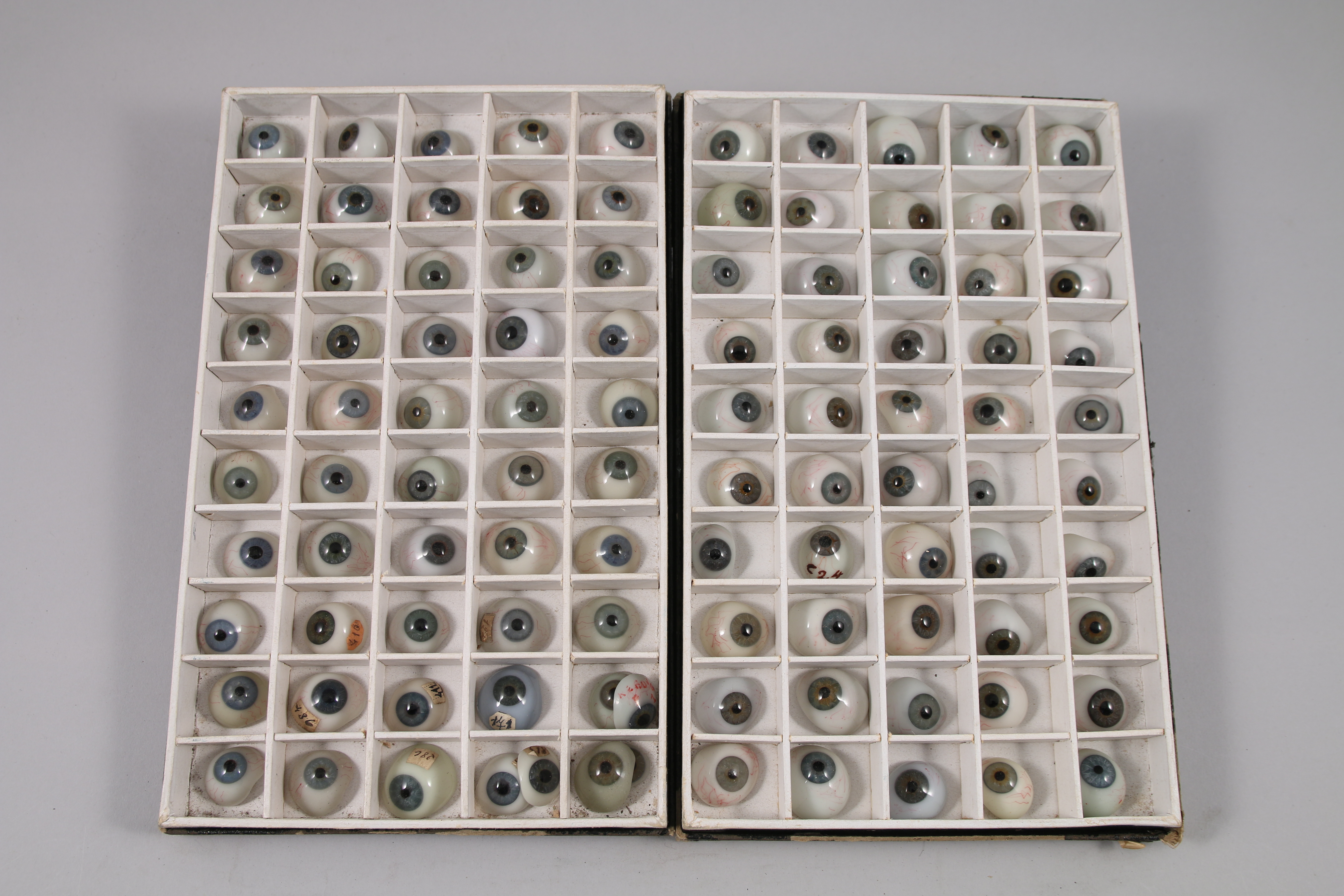 Environ une centaine de GLOBES OCULAIRES, simple ou double coque, dans un ou plusieurs coffrets gainés de chagrin. Les globes en verre teinté de différentes tailles, nuances de couleurs aux petits vaisseaux sanguins peints sur la conjonctive reproduisent l'iris grâce à des pigments de toutes teintes. Les formes des prothèses en demi-coquille sont irrégulières. Les tailles et couleurs diverses ont vocation à s'adapter aux patients ayant subi une énucléation au sortir de la première guerre mondiale.