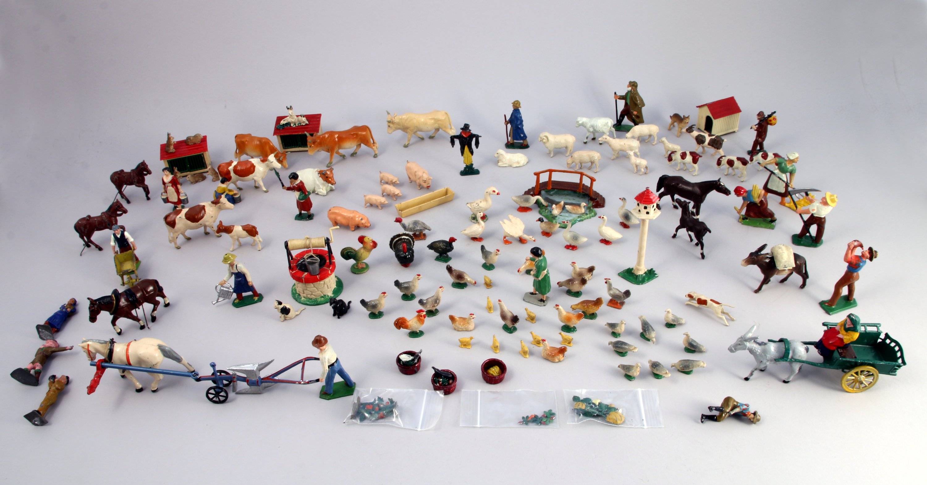 Réunion de PLOMBS CREUX, environ 100 PIÈCES, sur le thème de la FERME, en majorité de la maison BLANCHERIE FRÈRES dont: vaches, chevaux, chèvres personnages, lapins et clapiers, chats, chiens, poules, oies dindon, cochons, mare et pont, puit, pigeons...