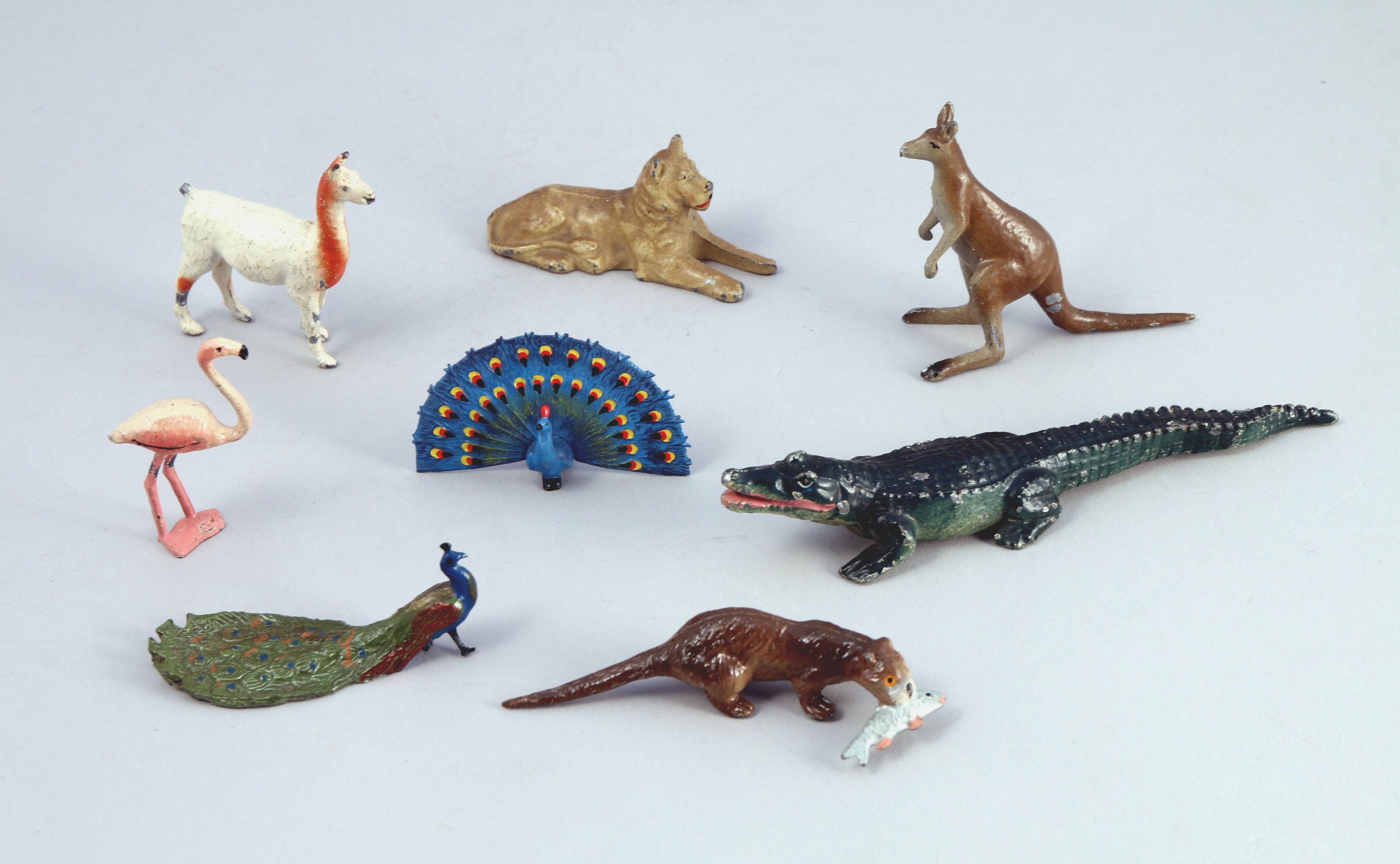 - HUIT PLOMBS CREUX, en majorité de la maison BLANCHERIE FRÈRES: crocodile, lionne, kangourou, lama, loutre, flamant rose et paons.