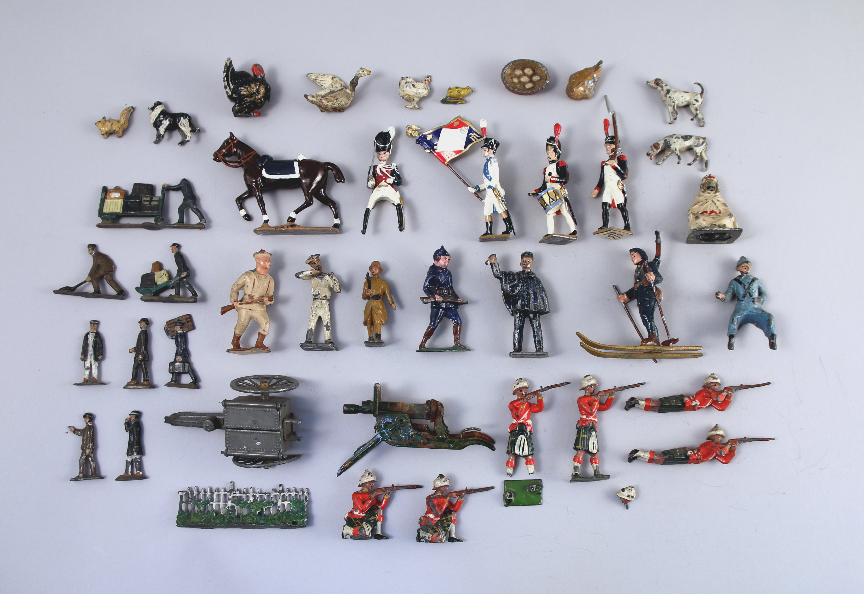 JOINT: Réunion d'environ 30 SUJETS EN PLOMB tels que: chasseur alpin sur ses skis, 5 soldats écossais, voyageurs, dindon BF, écureuil... En l'état.