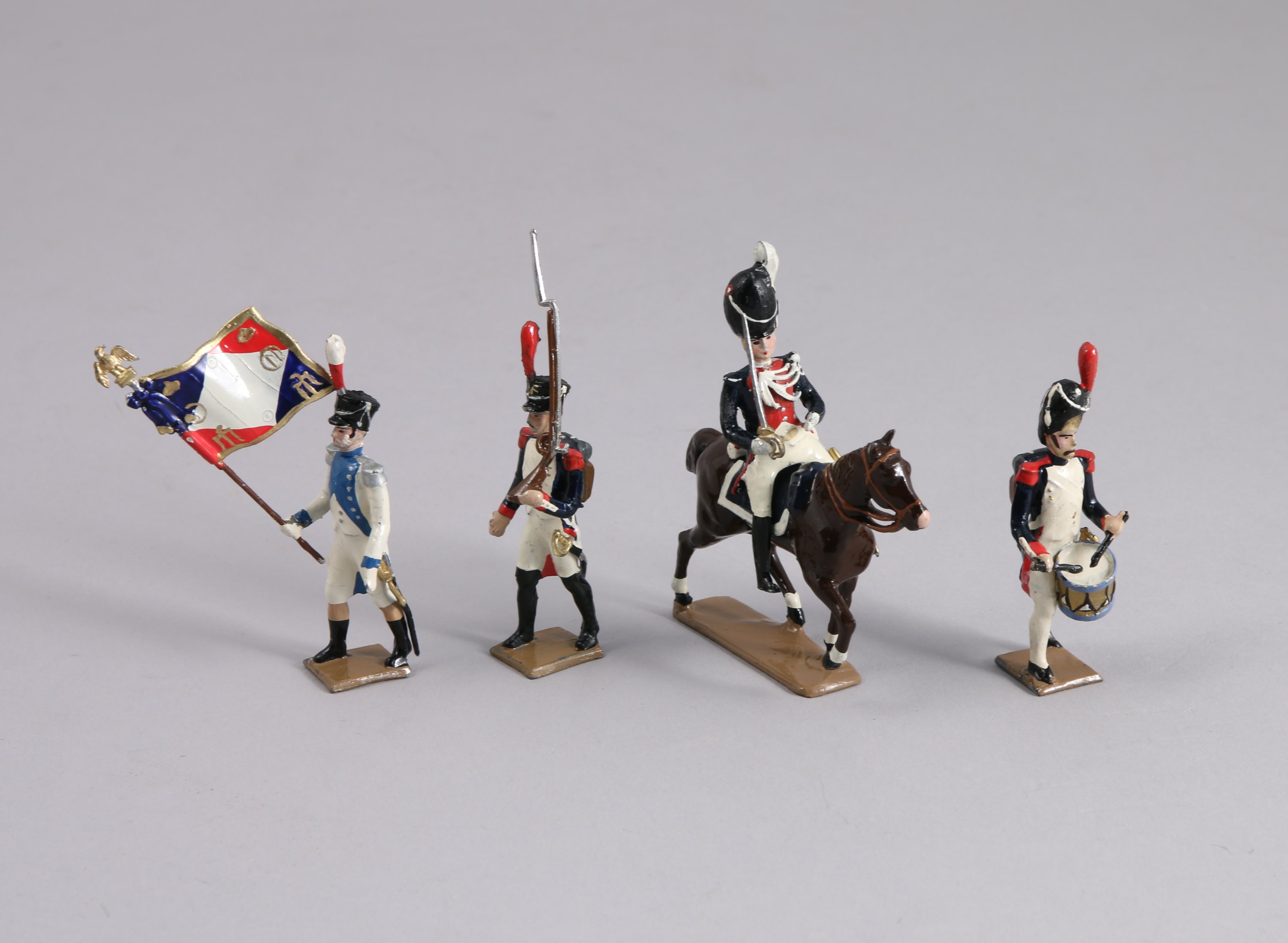 REINETTE - SOLDATS DE LA GRANDE ARMÉE en plomb peint polychrome, 4 PIÈCES: CAVALIER, PORTE-DRAPEAU, TAMBOUR et FANTASSIN.